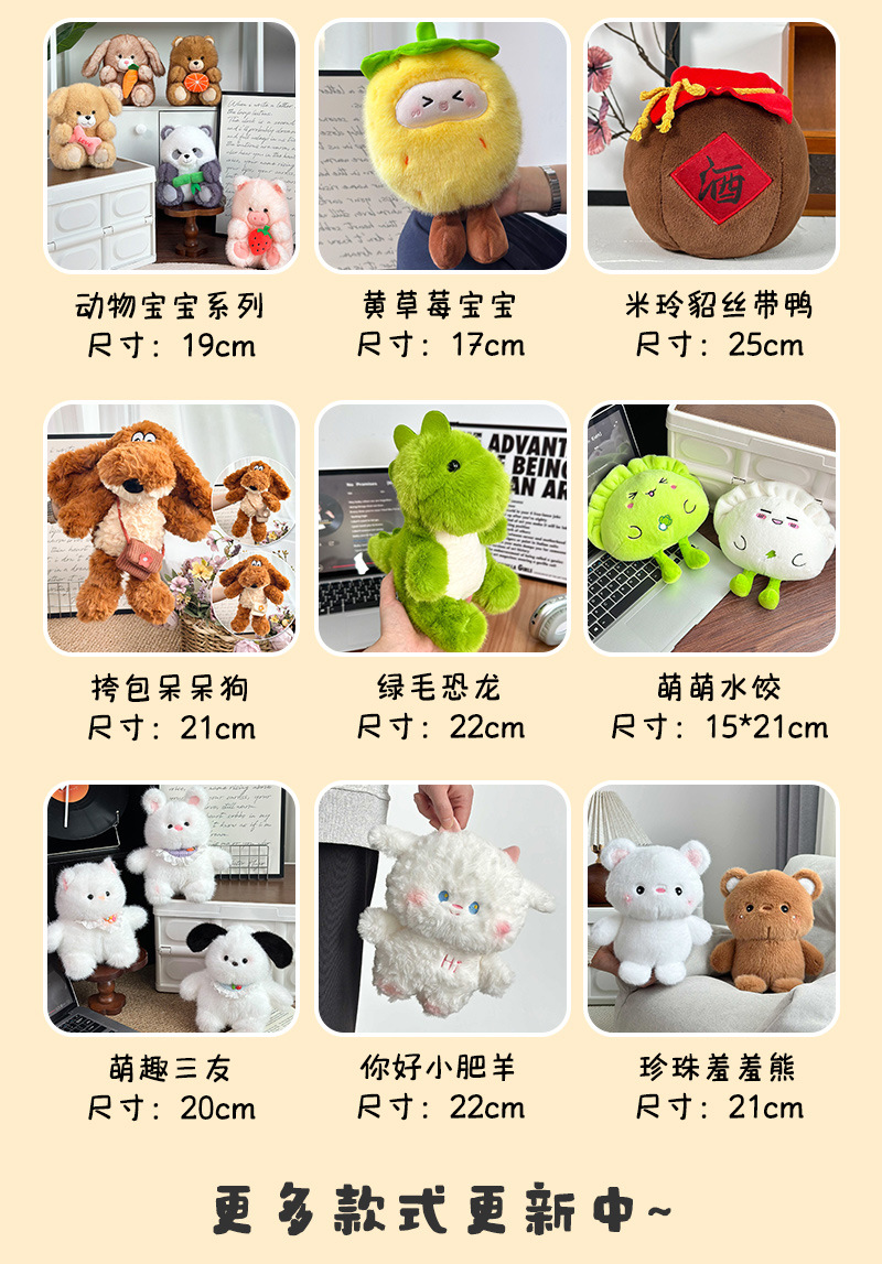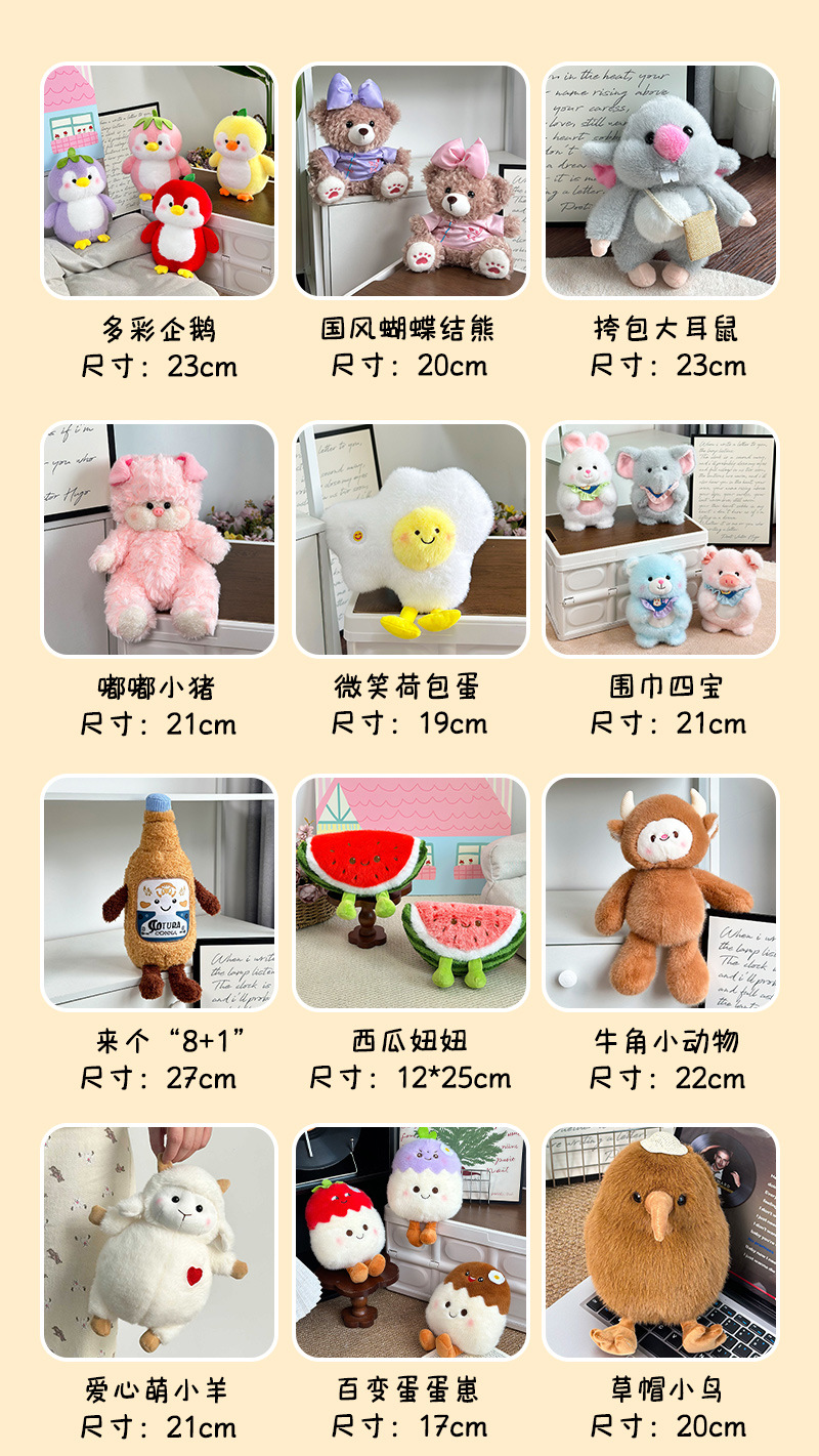 8inch сумка для куклы; Да, котенок 23см без ушей.; Щенок собирает грибы 23см; Привет маленькая толстая овчарка 22см без рогов; Собака-воровка курицы 21см; Милый ягненок с любовью 21см без ножек; Кукла Радужное Облако 22см; Громовое облако 24см; Фруктовая карликовая собака 25см; Трехцветный мальчик-пчелка 21см.; Спортивный Медведь 22см; Жемчужный Скромный Медведь 21см; Электрический кот с глазами 22см; Улыбающееся яйцо-пашот 19см; Медведь-бантик в китайском стиле 20см.; Возьмите миску с лапшой улитки 7,5*14,5 см.; Приходите «8+1» 27см.; Арбуз Ниунью 12*25см; Арбуз Заизай 17см; Шарф Четыре Сокровища 21см; Сумка через плечо Крыса с большими ушами 23см; Трехцветный лежачий кролик 11*24см; Рогатое маленькое животное 22см.; Красочный пингвин 23см; Дуду Пигги 21см; Милые трое друзей 20см; Пакет пива 21см.; Птица в соломенной шляпе, 20 см; Кролик Хилл 24см; Серия «Малыши» 19 см; Шарф кошка-кролик 20см; Милые пельмени 15см*21см.; Зеленый меховой динозавр 22см.; Разнообразие мячей 17см.; Кукла-винный бутылка 18*15 см; Сумка через плечо 21см.; Милый медвежонок, 23 см; Дуриан Кролик 22см; Белоголовый медведь 22см.; Один баклажан 23см.; Мультяшные картофель фри 15*19см; Желтая клубничка для малышей, 17 см; Ноно Ягненок 21см; Милый маленький желтый медвежонок 22см.
