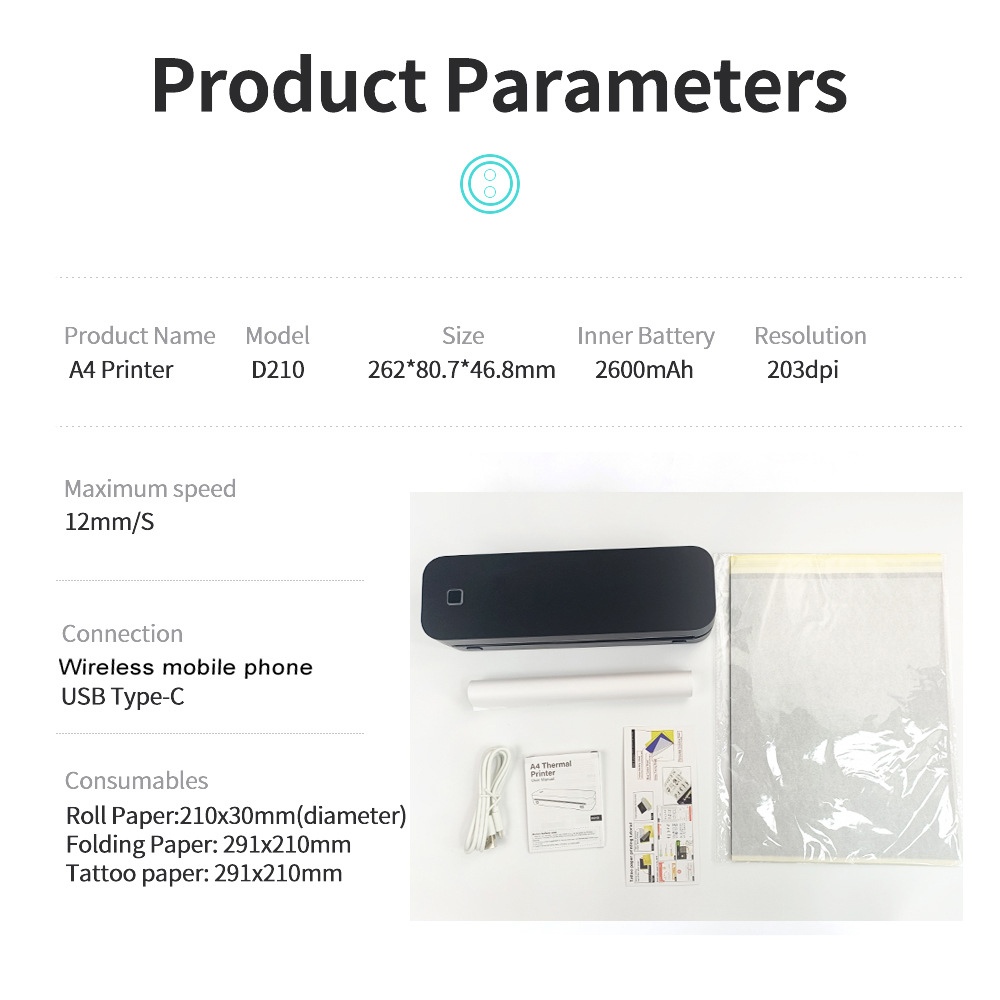 D210 Белый Белый; D210 Черный Черный; Стойкая рулонная бумага формата А4 - 8m; Термоскладная бумага формата А4 100 шт.; Термоскладная бумага А4 200шт.; Бумага для татуировки формата А4 50 шт.
