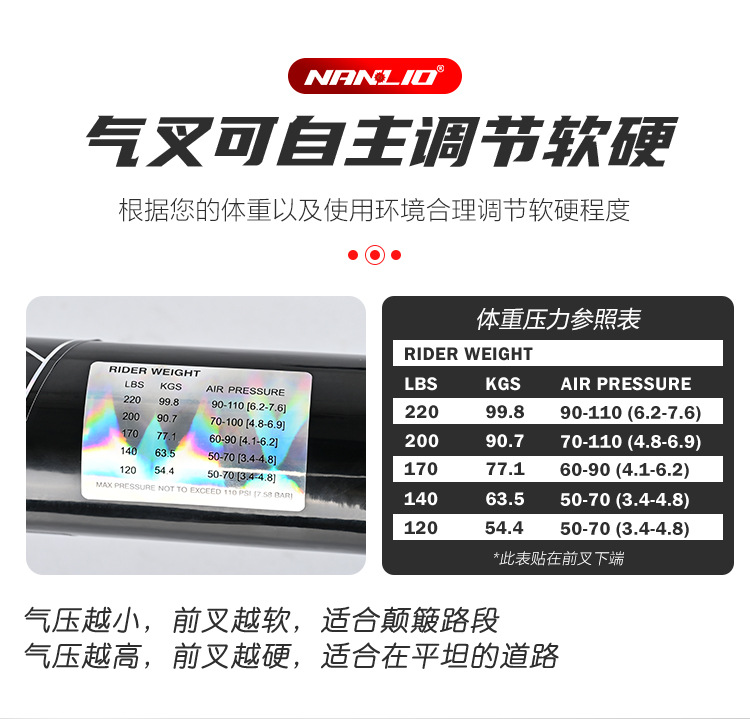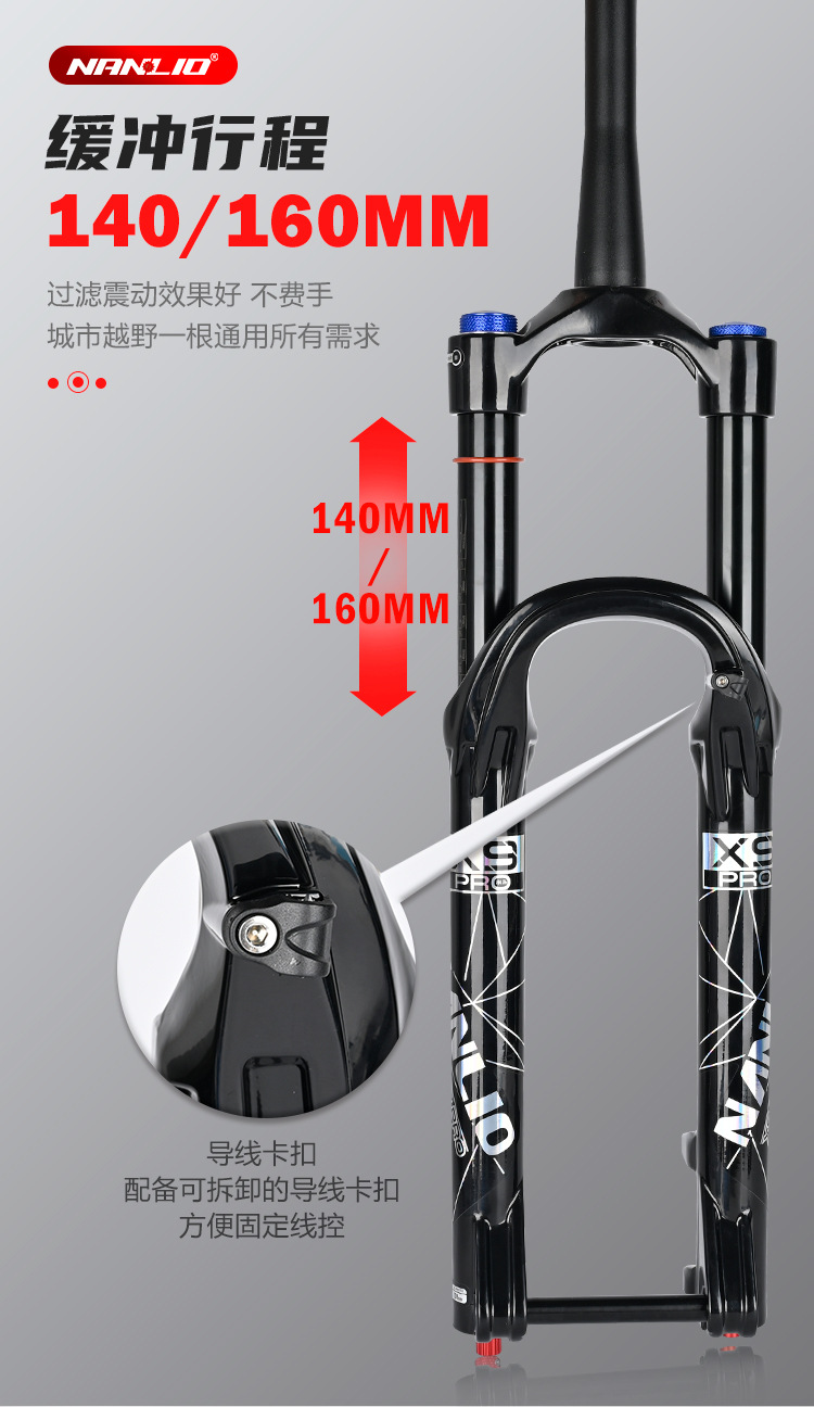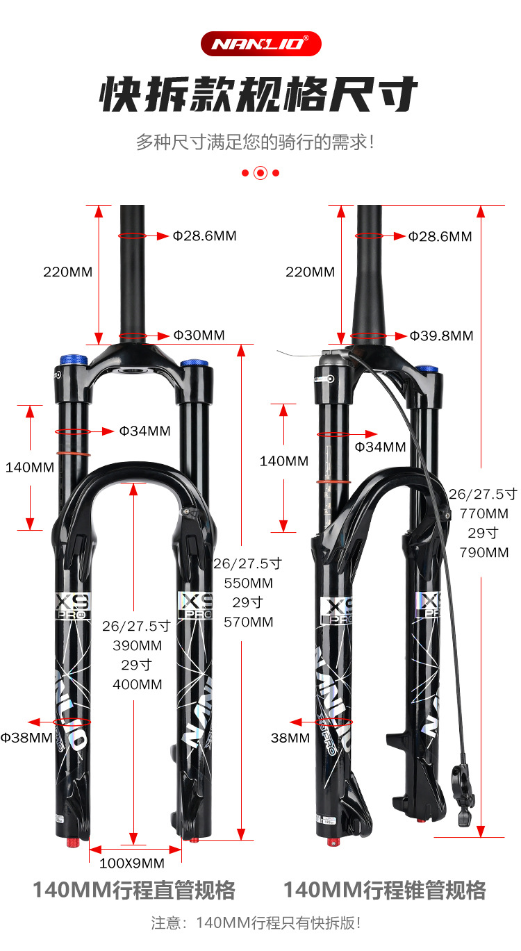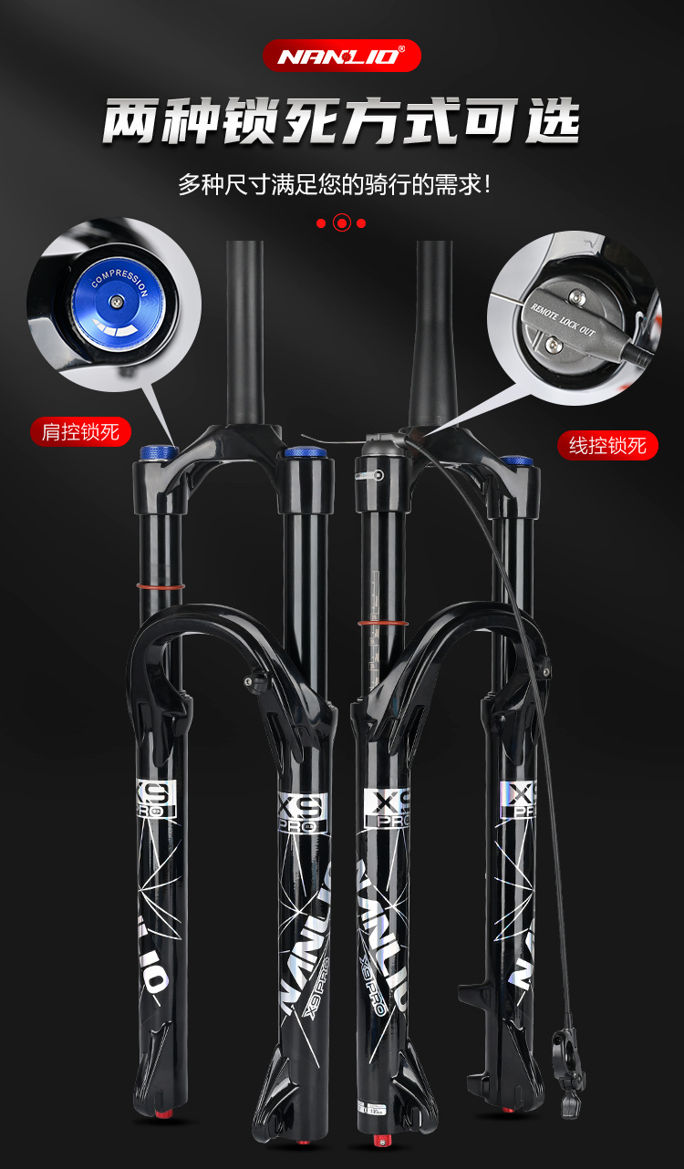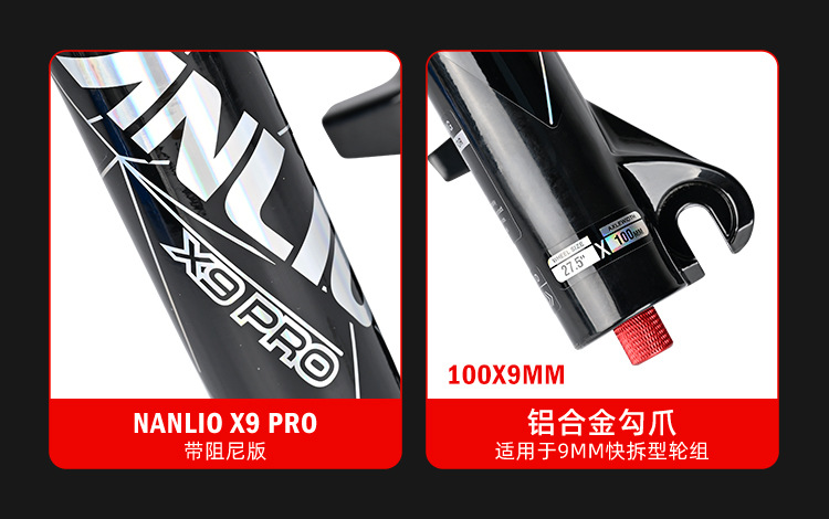 1. The Nanlio X9 PRO bicycle fork suspension is a high-quality option with a 34mm diameter, available for wheel sizes of 26, 27.5", and 29 inches, ideal for mountain bikes. 这款Nanlio X9 PRO自行车前叉悬架是一款高品质选择,直径为34毫米,适用于26英寸、27.5英寸和29英寸的车轮,非常适合山地自行车。