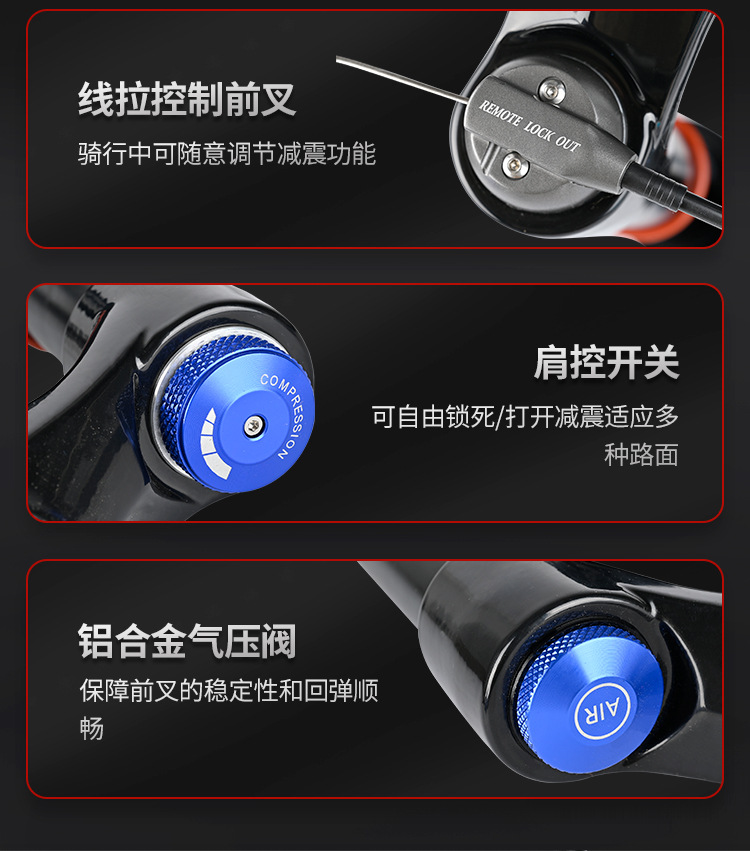 3. The manual control lock allows the rider to adjust the suspension according to preferences and needs, providing greater stability on flat terrains or during climbs. 手动控制锁定功能可让骑手根据个人喜好和需求调整悬挂,提供更大的稳定性,无论是在平坦地形上还是爬坡时。