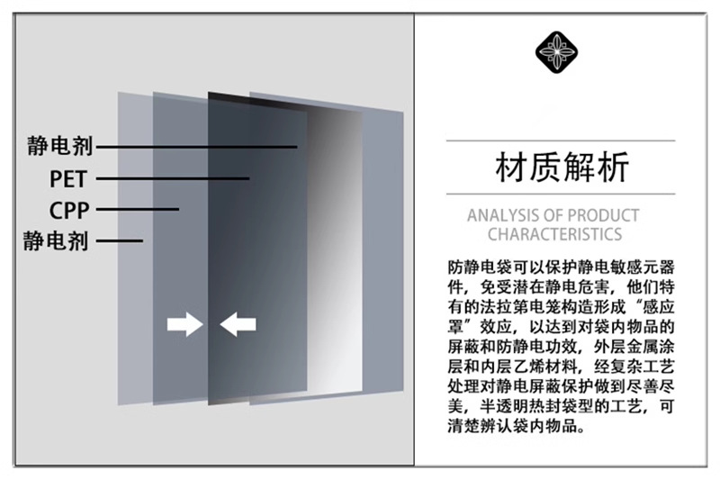 适用范围:用于对湿度及静电敏感的电子元器件的包装,广泛应用于IT电子通讯行业、五金、PCB板、主板、网卡、显卡、显示器、各种硬盘、数码电子等等产品的包装。