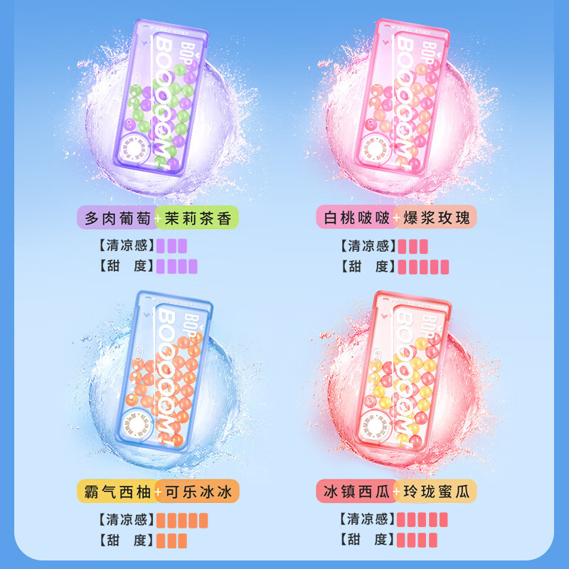 «Сукулентный виноград + аромат чая с жасмином» Двойная комбинация; Двойная комбинация «Белый персик Бобо + Взрывная роза».; Двойное сочетание «Охлажденный арбуз + изысканная сладкая дыня»; Двойная комбинация «Кока Бинбин + Властный Грейпфрут»