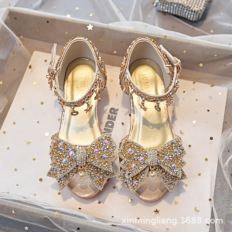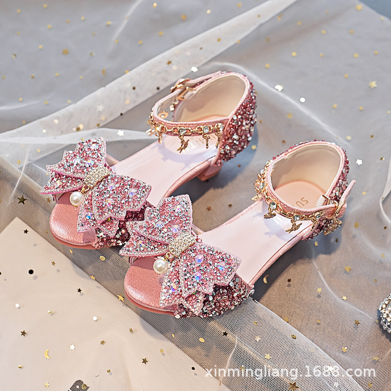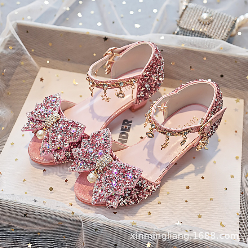 Новые детские туфли на высоком каблуке с кристаллами Принцесса для детей среднего и большого возраста Учащиеся начальной школы Сандалии для выступлений на сцене Подиум Обувь для девочек