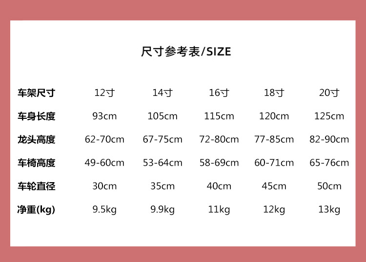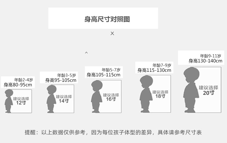 12 дюймов подходит для роста 85-95 см; 14 дюймов подходит для роста 95-105 см; 16 дюймов подходит для роста 105-115 см; 18 дюймов подходит для роста 115-125 см; 20 дюймов подходит для роста 125-135 см