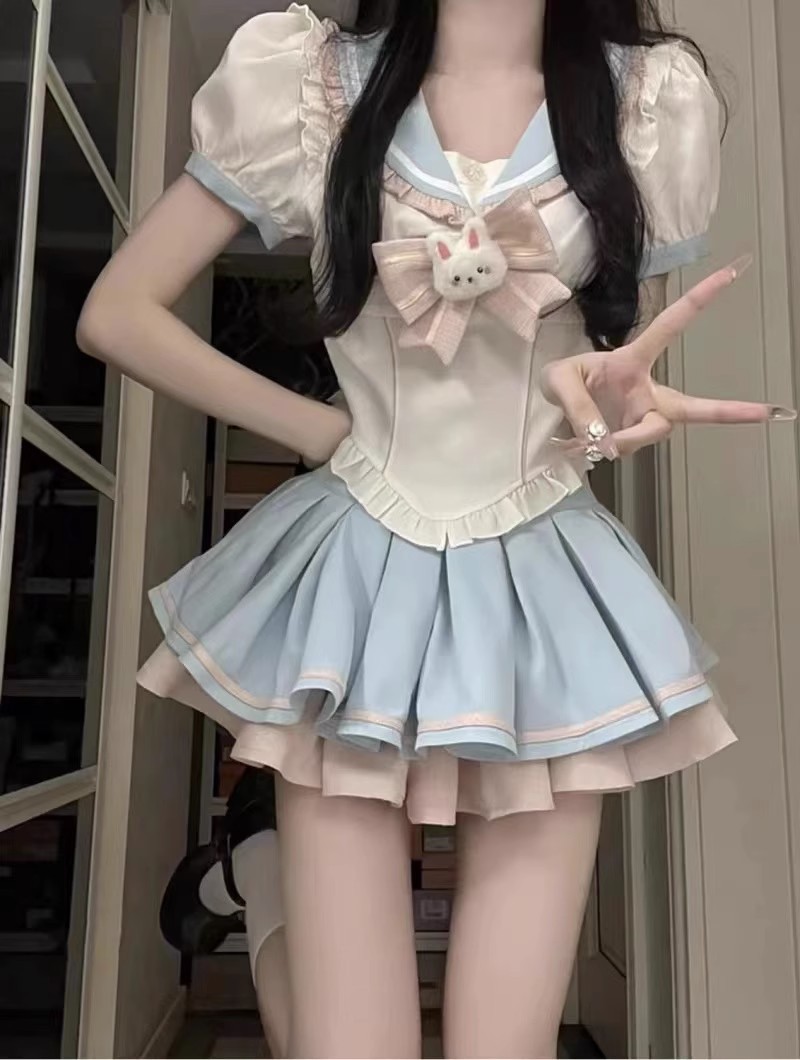 Сладкая рубашка с рюшами и бантом с темно-синим воротником, пышная юбка с высокой талией, униформа JK, женский весенний костюм из двух частей