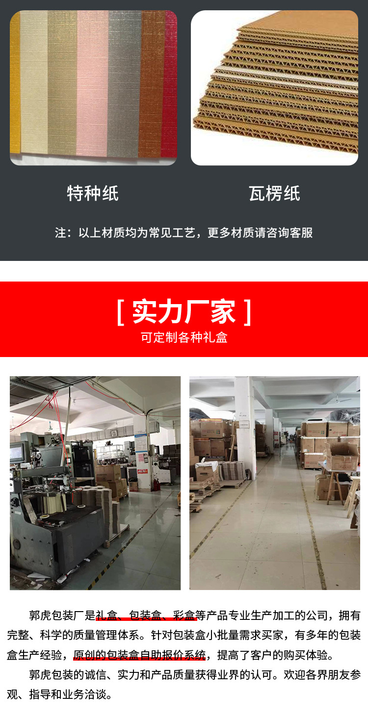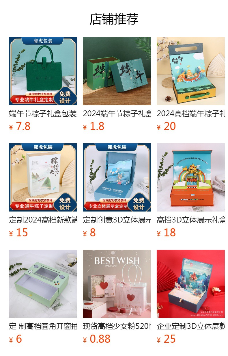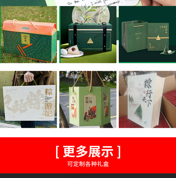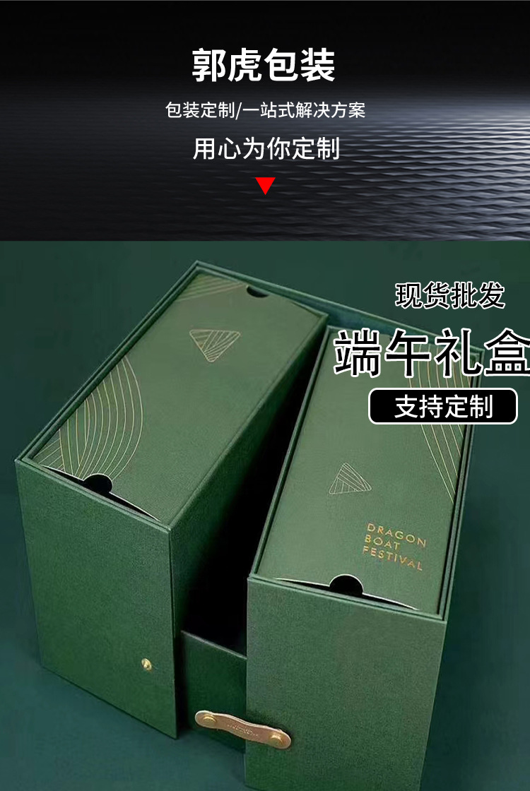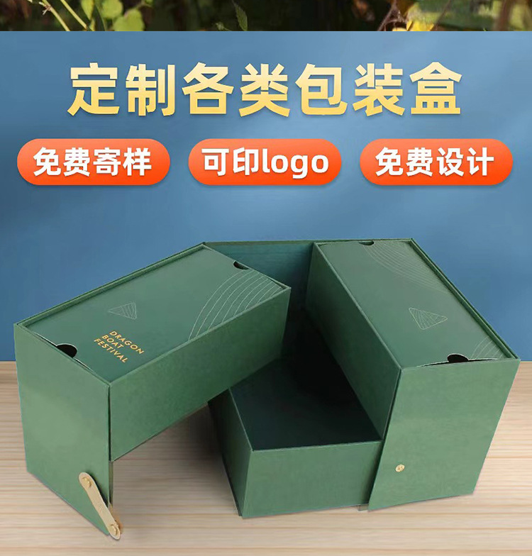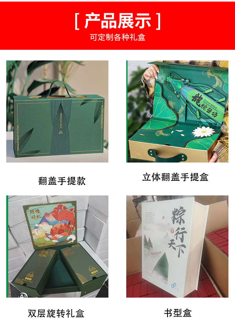 本厂专业定制各种节日礼盒,中高档礼盒,专来生产硬盒10来年,各种中盒型都可以制作保质保量 。今年端午粽子礼盒有很多新款现货也支装各种来样定制,来图定制,参考盒型定制,价格优惠,现货100个起加印LOGO。需要联系我。18266908436 桂丹
