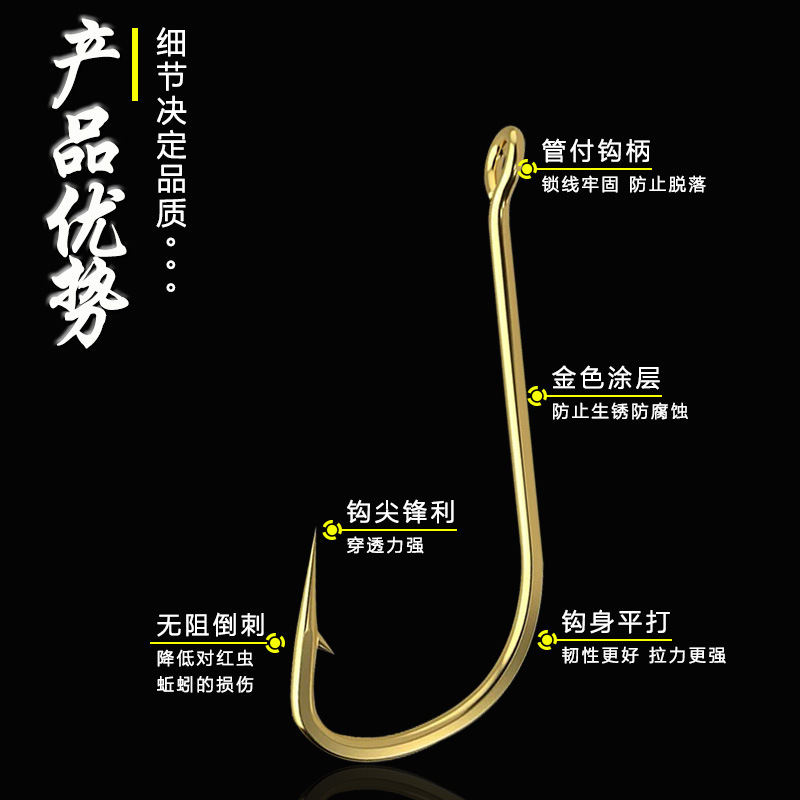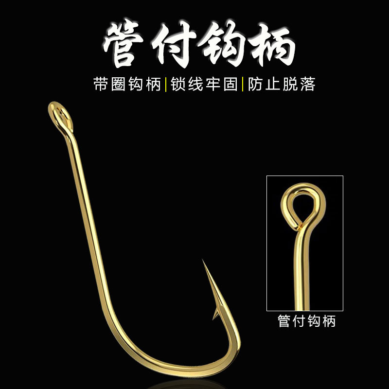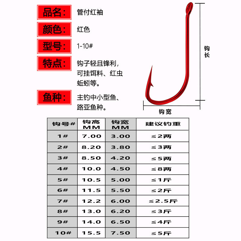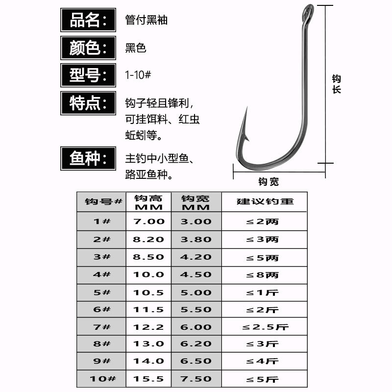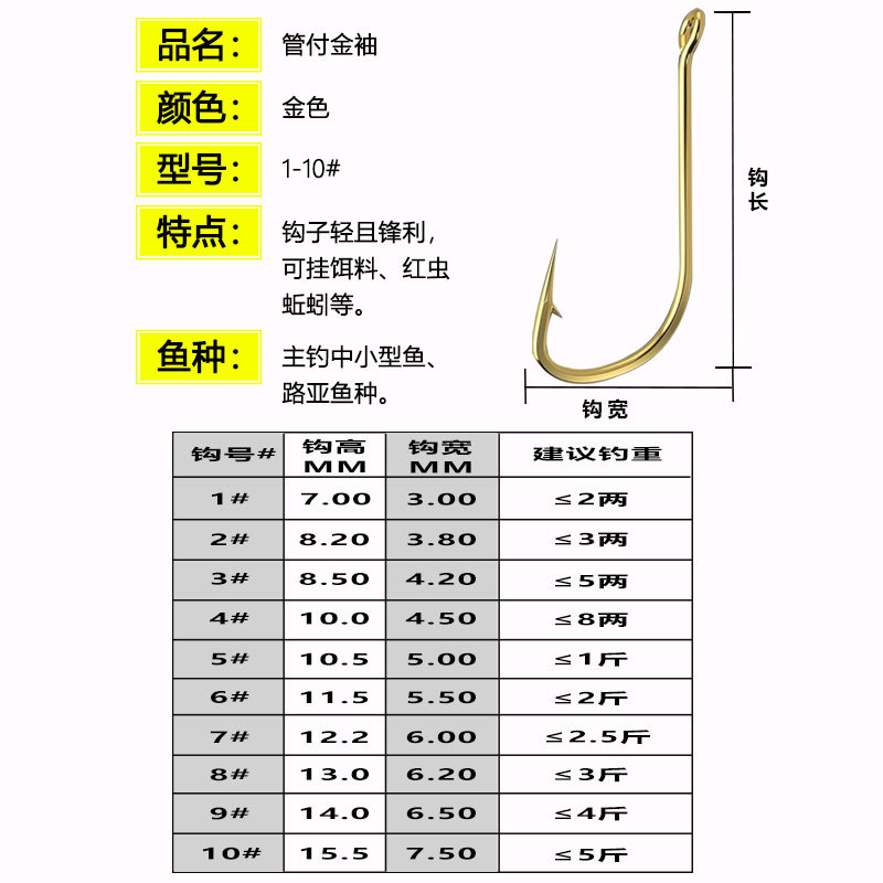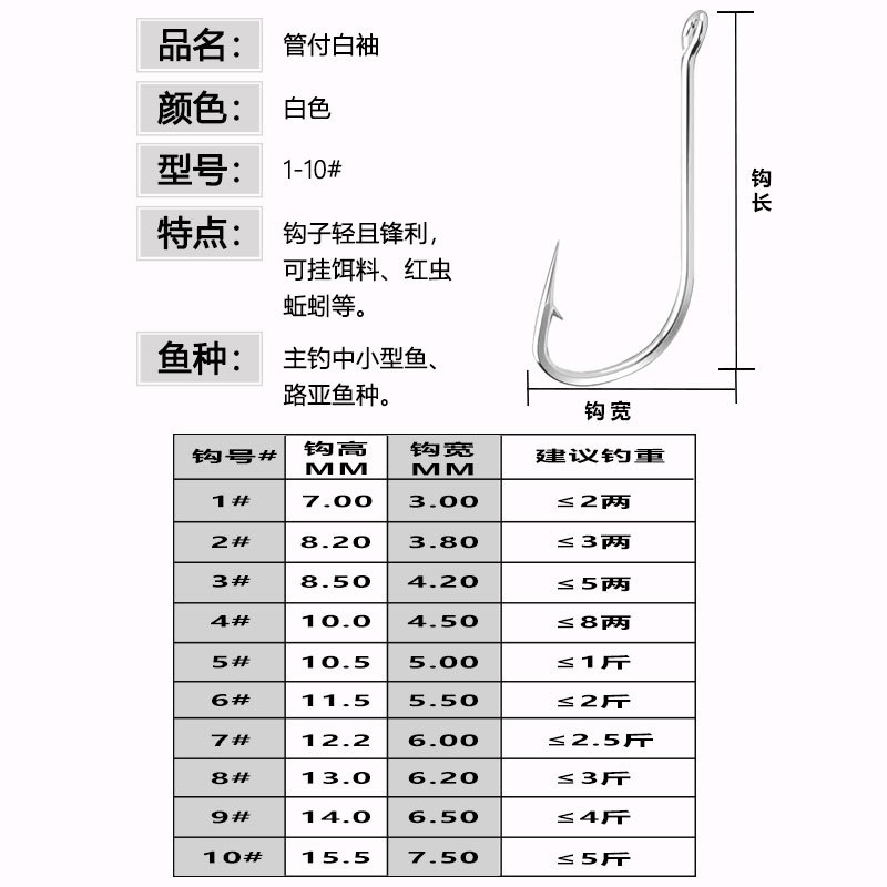 袖:此钩型无倒刺。钩尖锋利,钩柄长,钩条细钩身轻,适用于吸入取食的小型鱼种,快钓快取,多用于钓白鲫、小白条等。