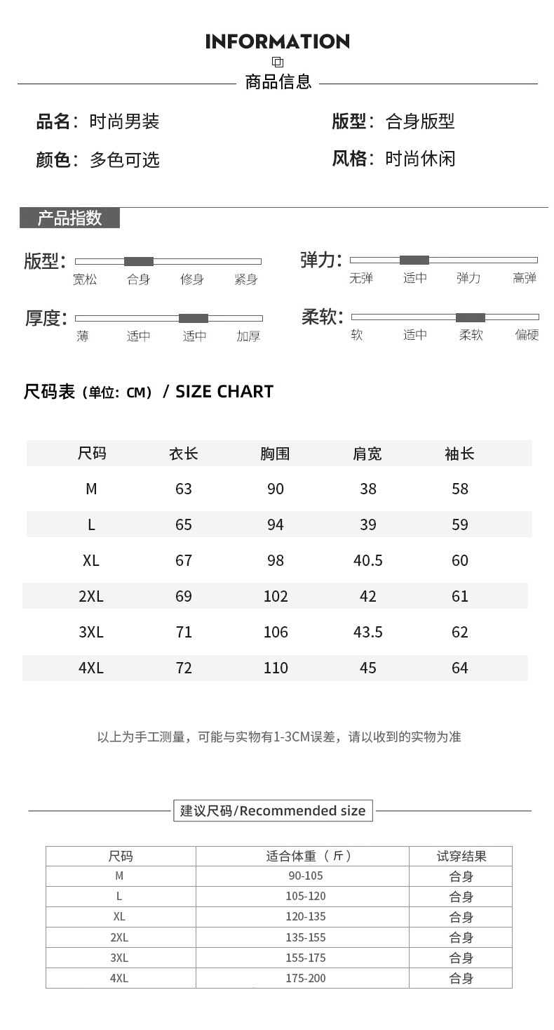 165/M; 170/L; 175/XL; 180/2XL; 185/3XL; 190/4XL