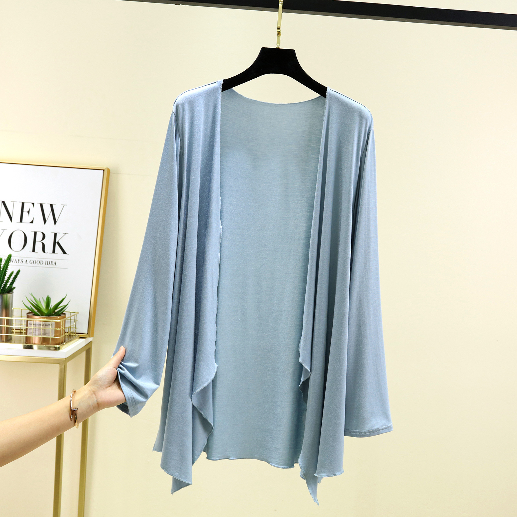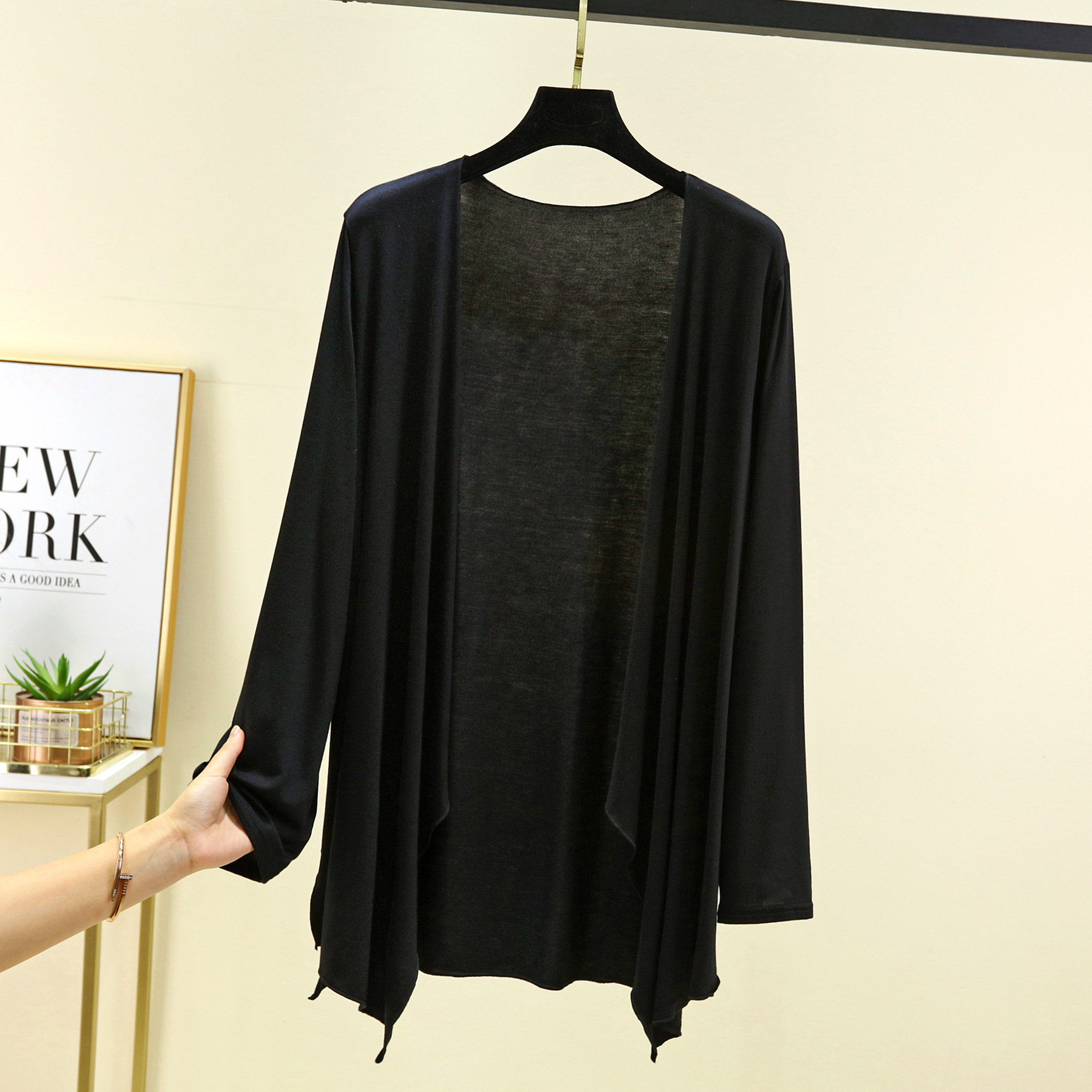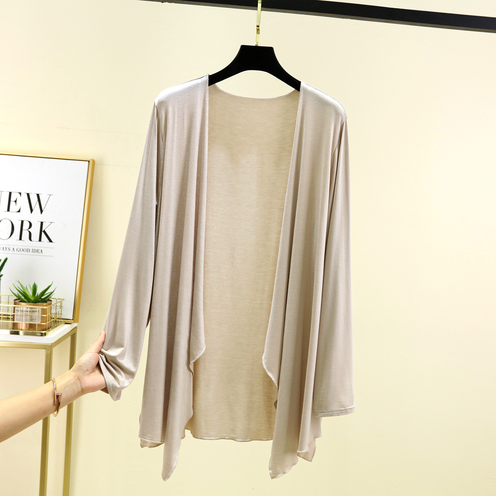 Модальный кардиган с длинными рукавами, женская летняя новая Солнцезащитная рубашка с кондиционером, однотонное тонкое пальто средней длины с неровной шалью
