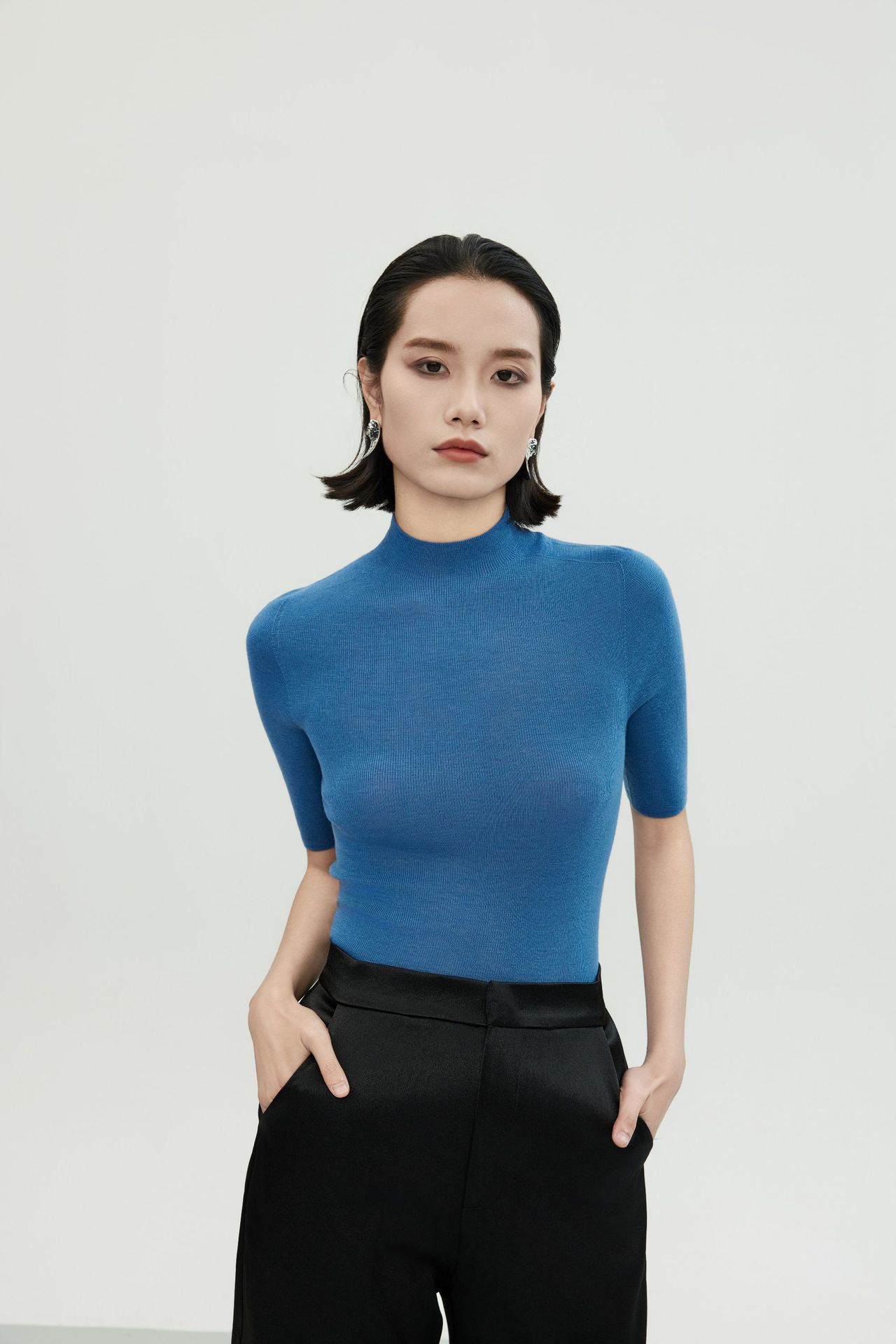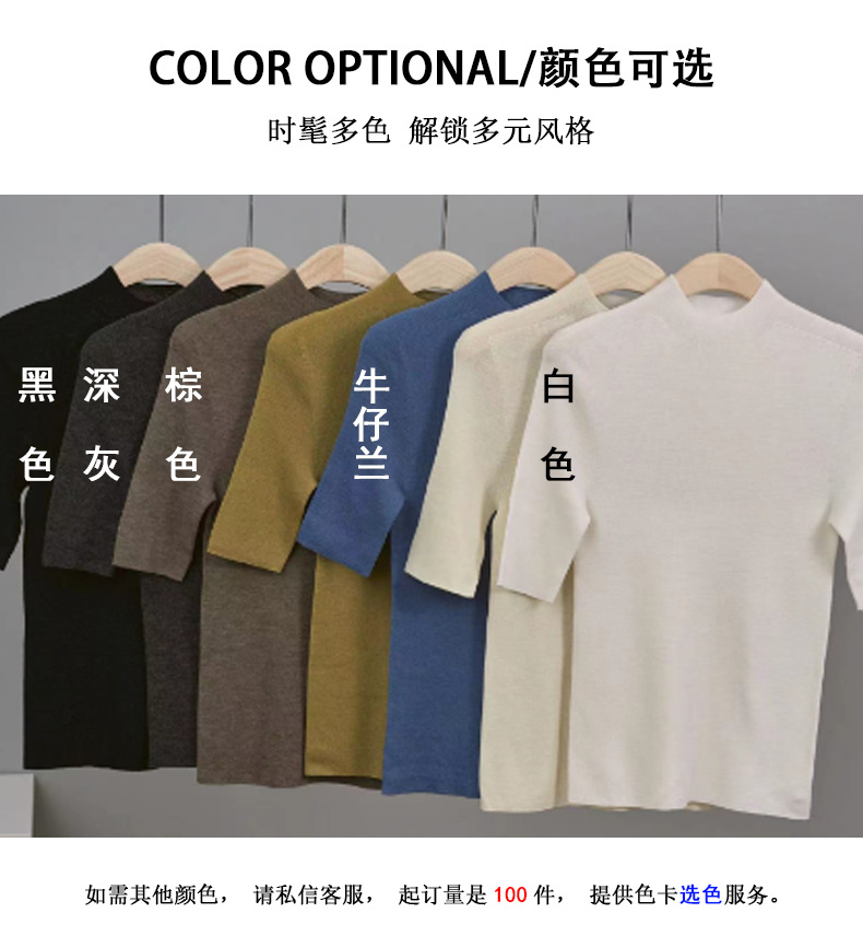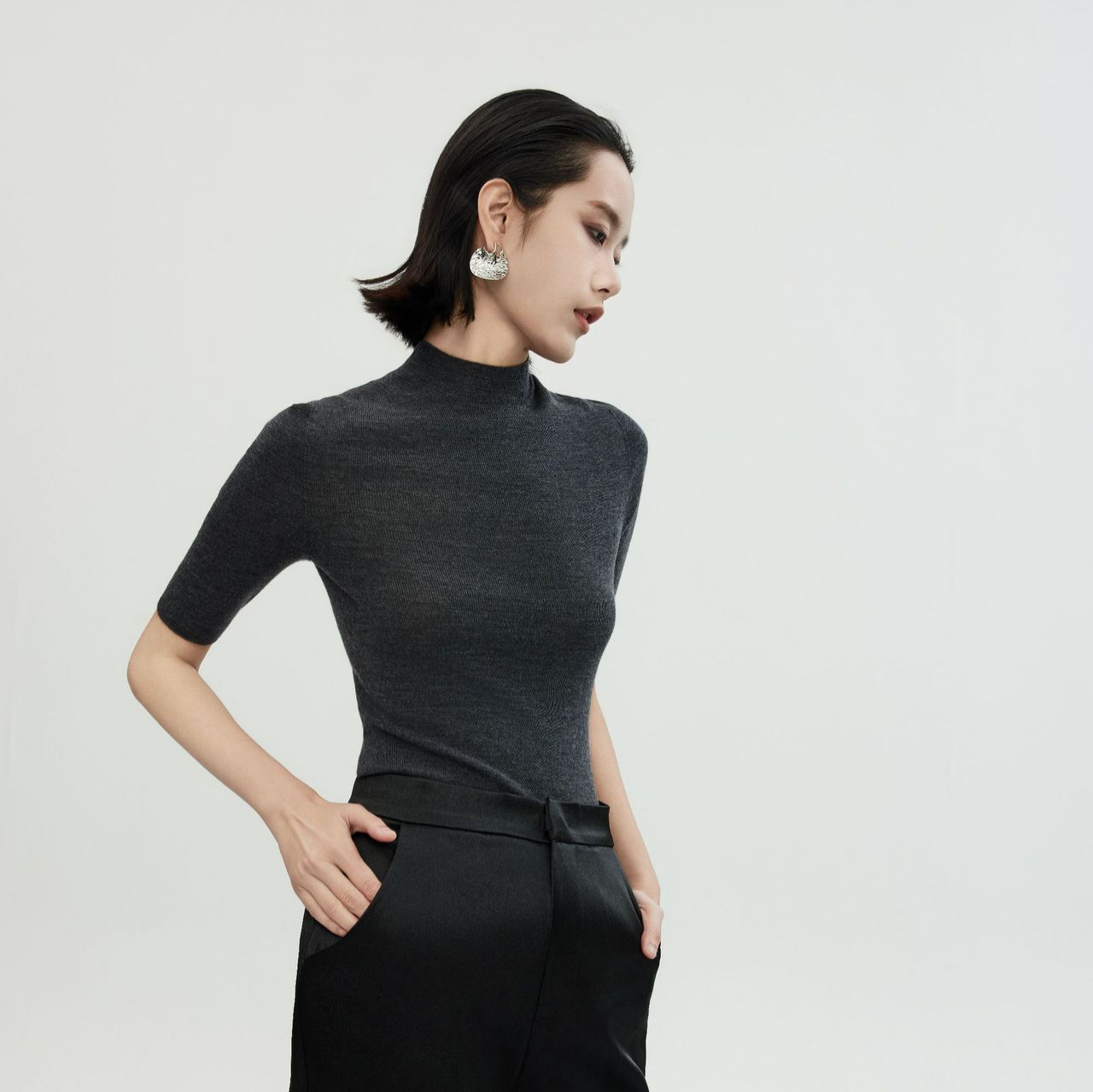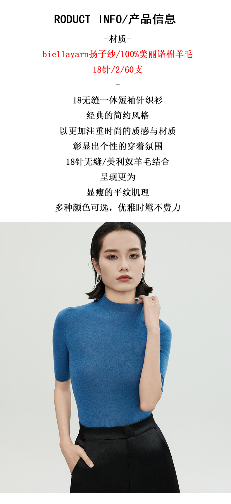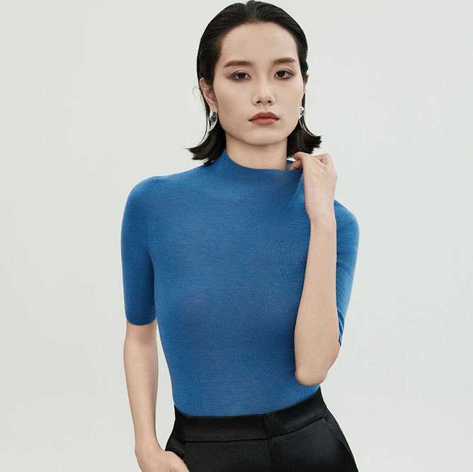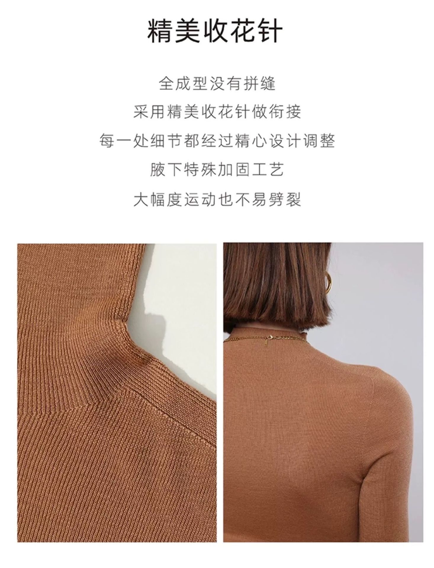【2/60 Yangtze yarn】Бесшовный трикотажный топ из 100% шерсти с воротником-стойкой и рукавами три четверти, тонкий фасон, для женщин.