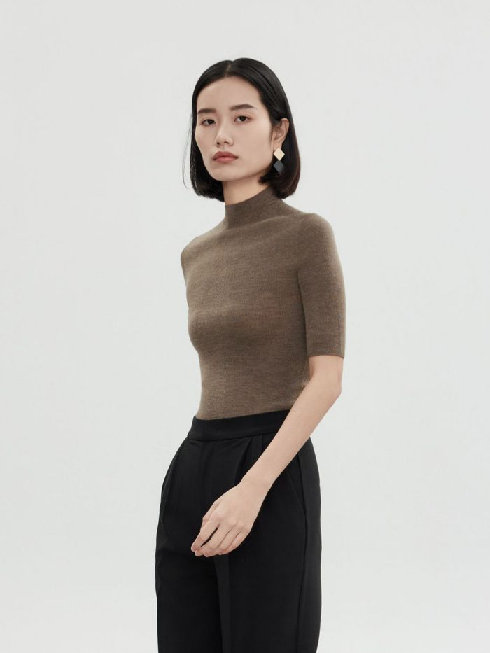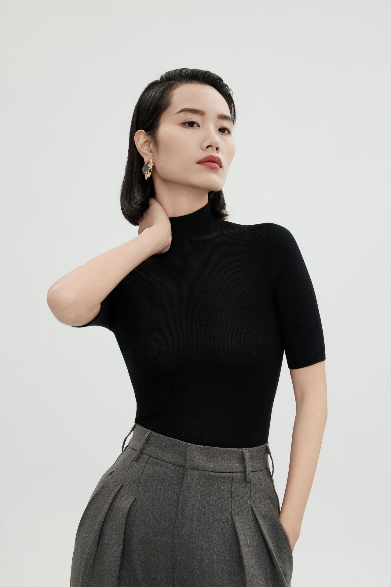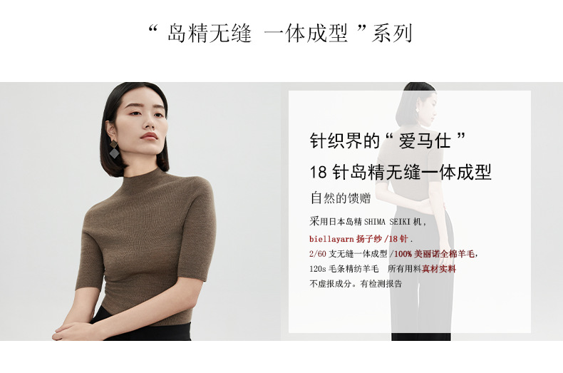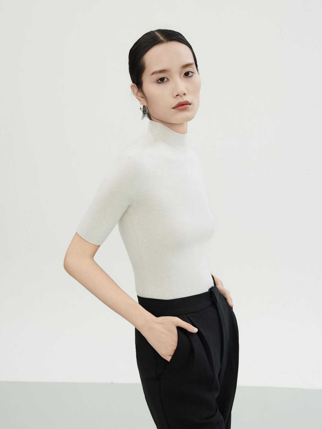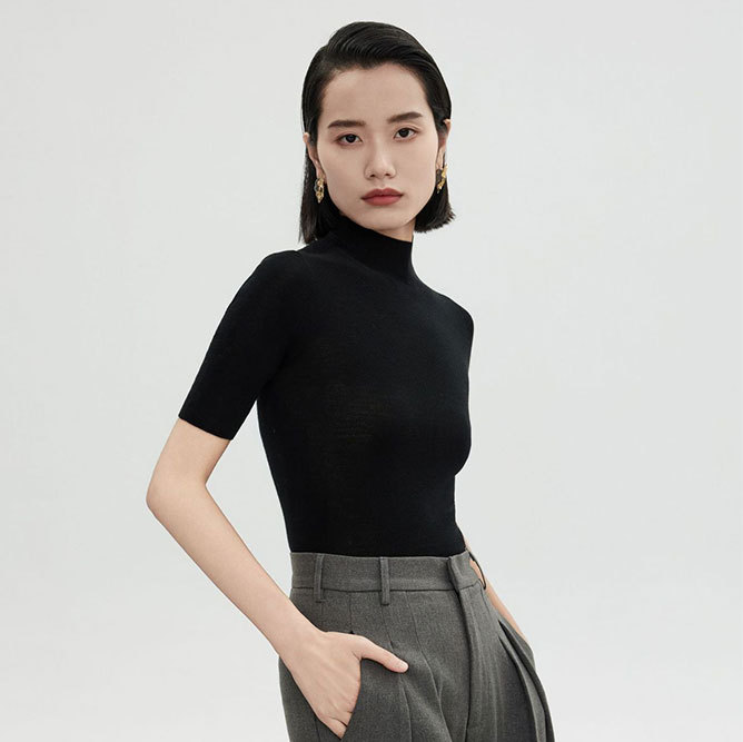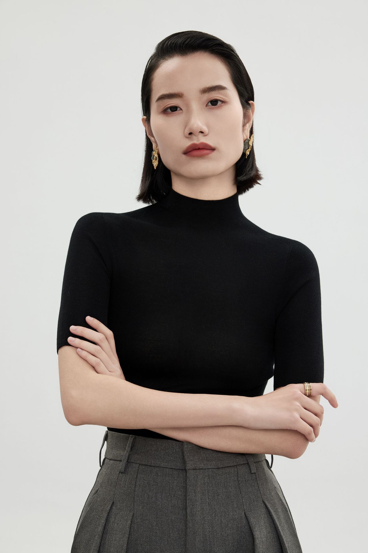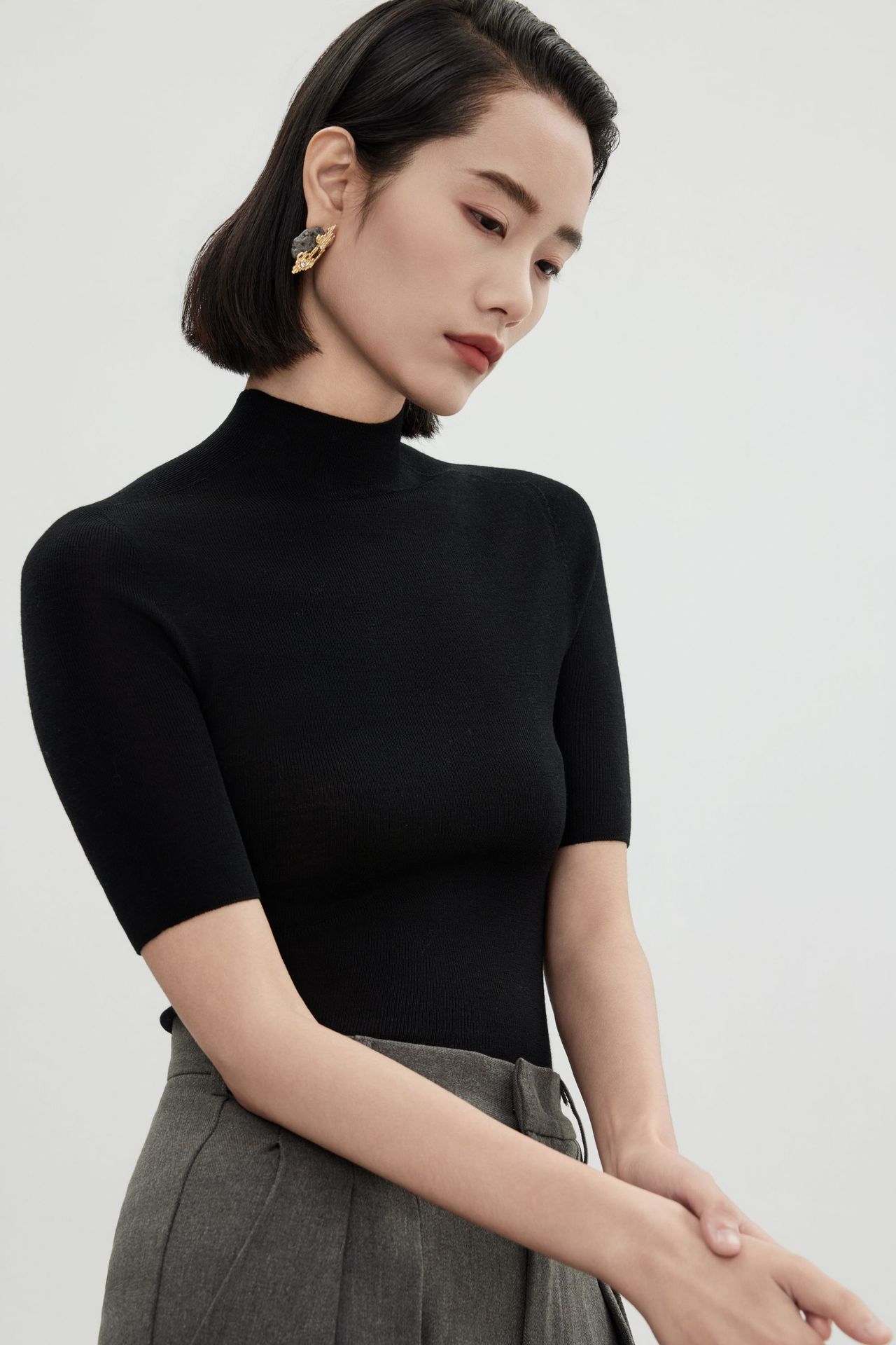 【2/60 Yangtze yarn】Бесшовный трикотажный топ из 100% шерсти с воротником-стойкой и рукавами три четверти, тонкий фасон, для женщин.