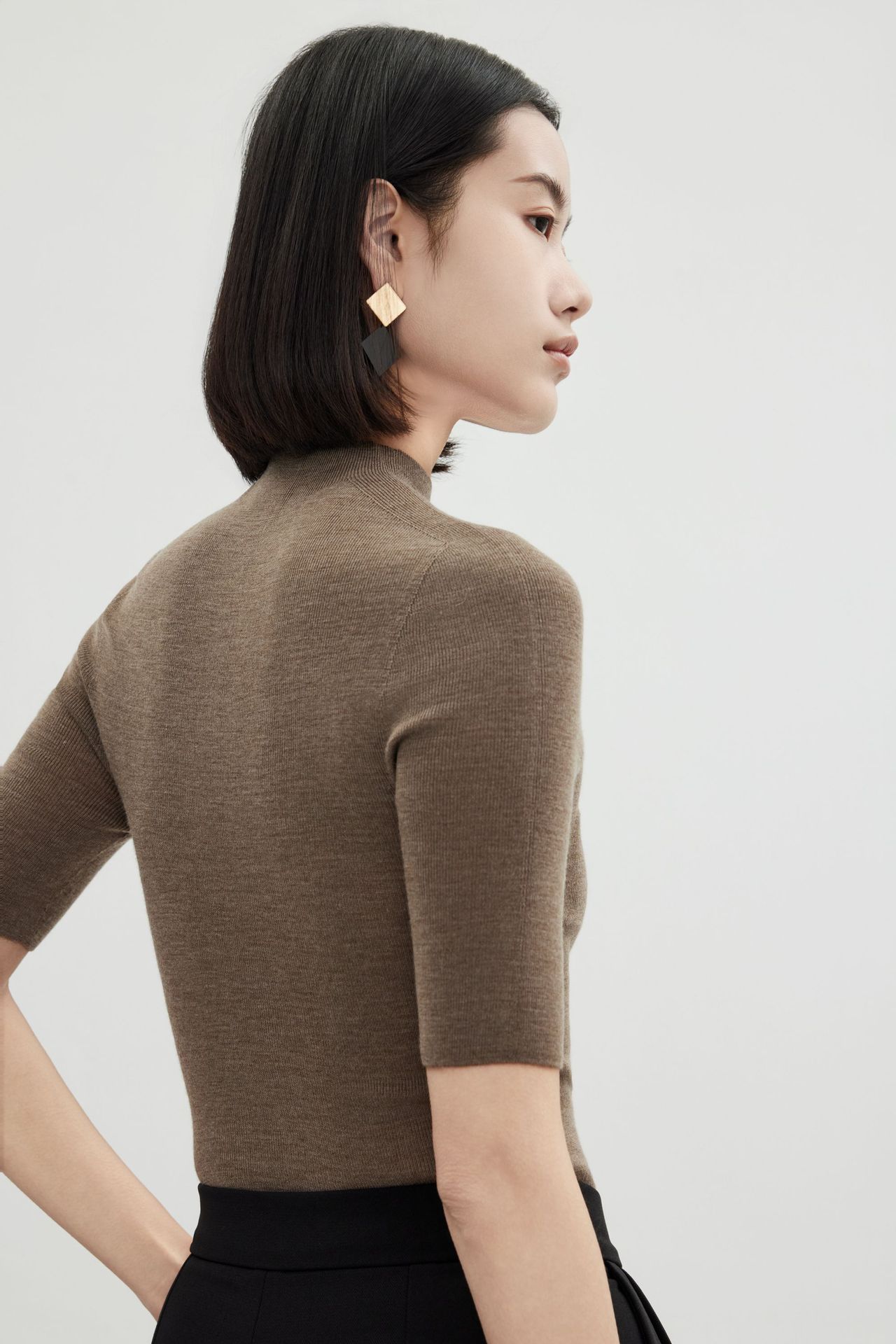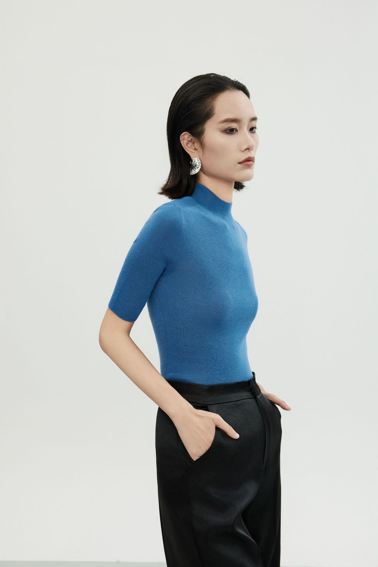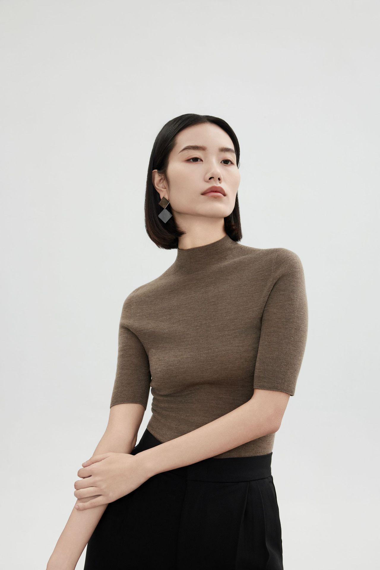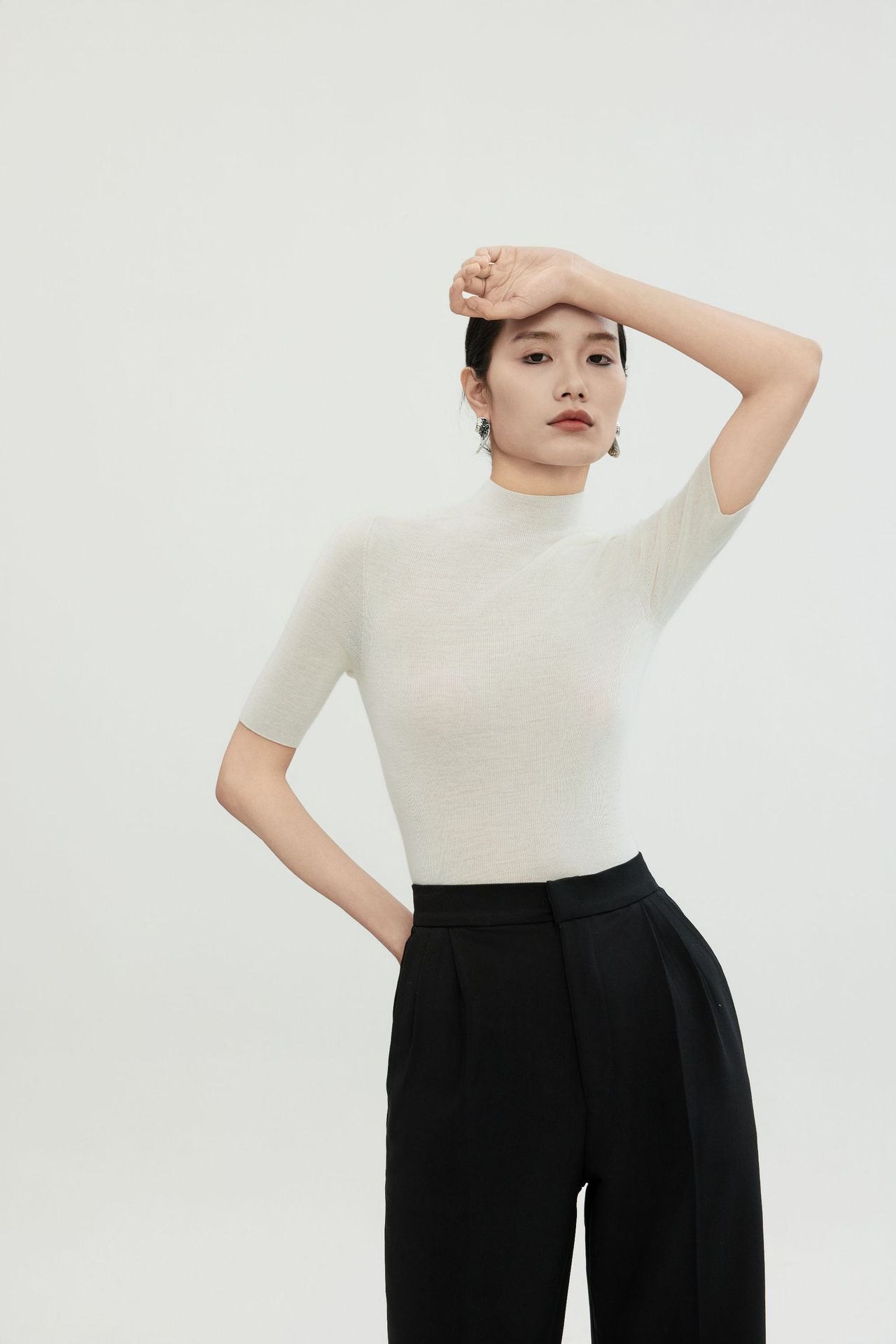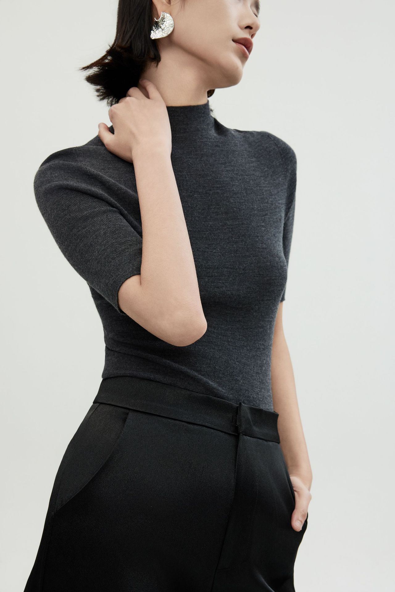 【2/60 Yangtze yarn】Бесшовный трикотажный топ из 100% шерсти с воротником-стойкой и рукавами три четверти, тонкий фасон, для женщин.