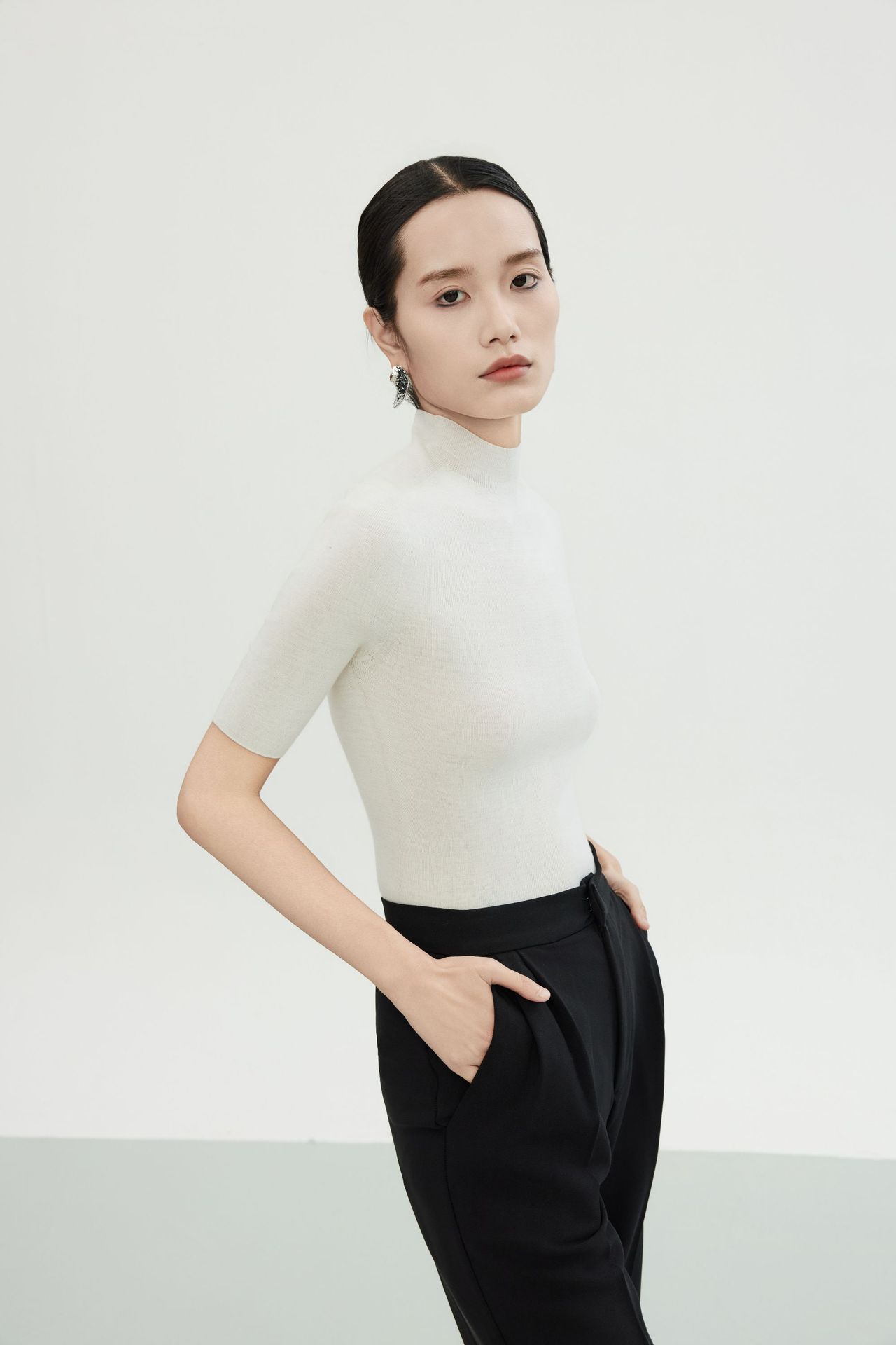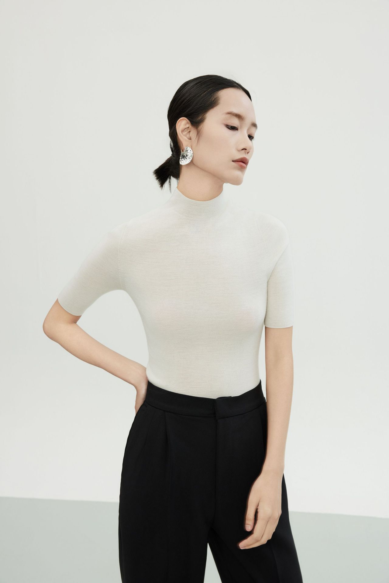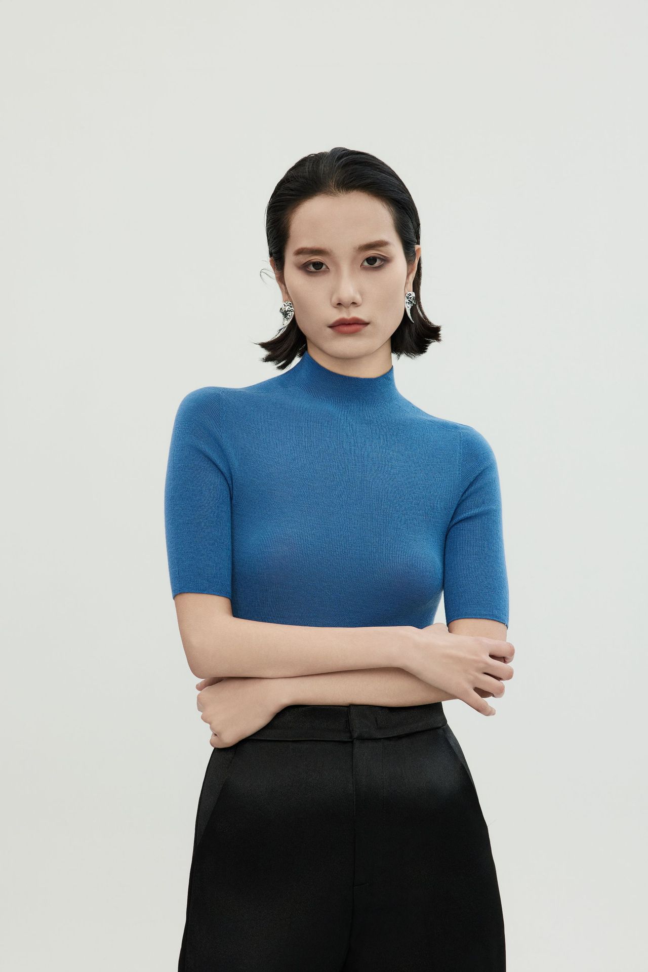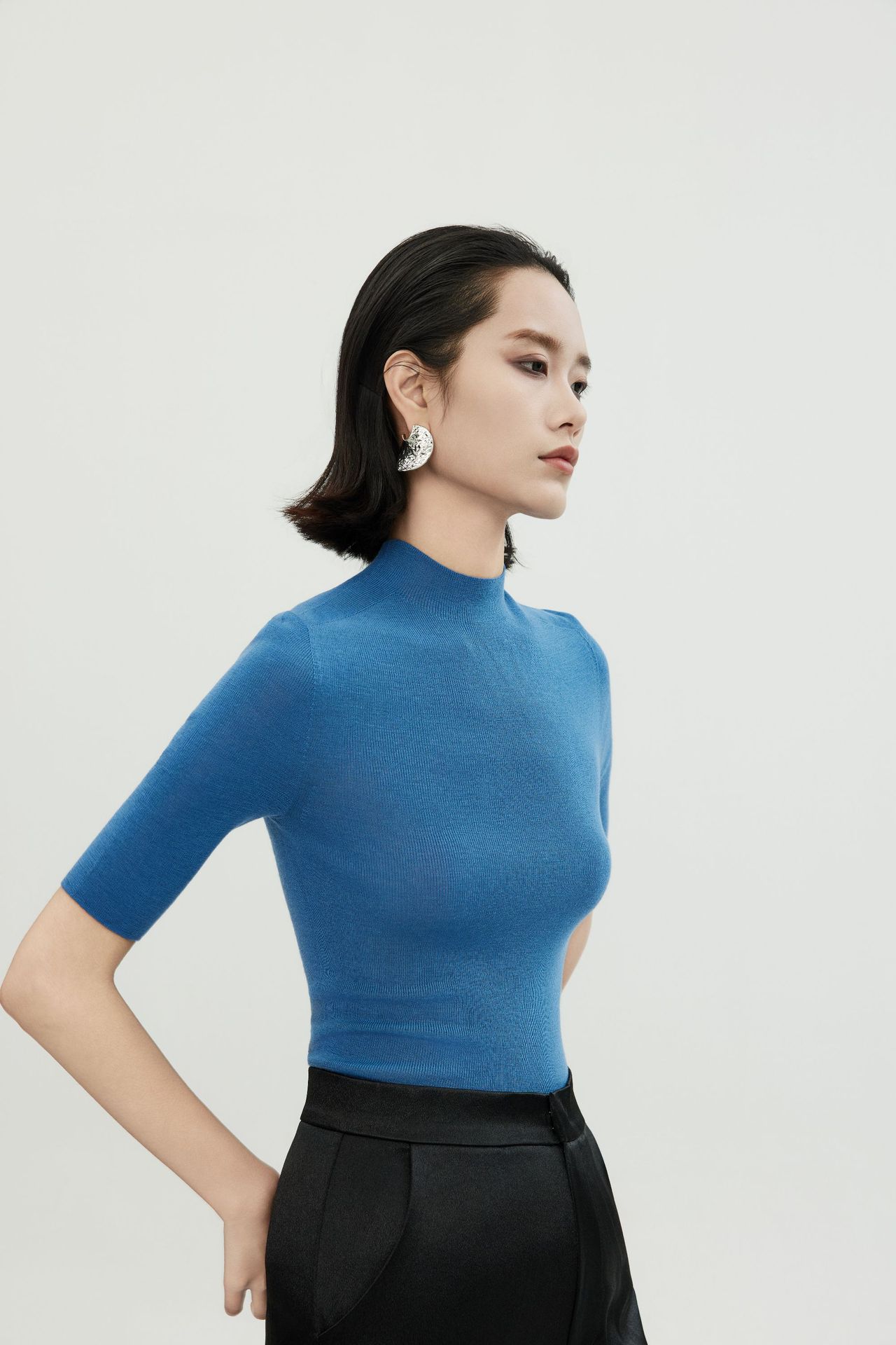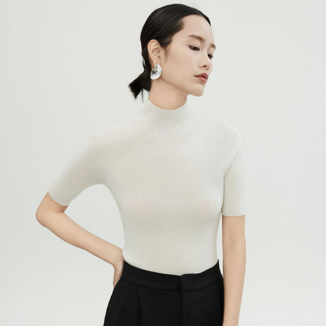 【2/60 Yangtze yarn】Бесшовный трикотажный топ из 100% шерсти с воротником-стойкой и рукавами три четверти, тонкий фасон, для женщин.