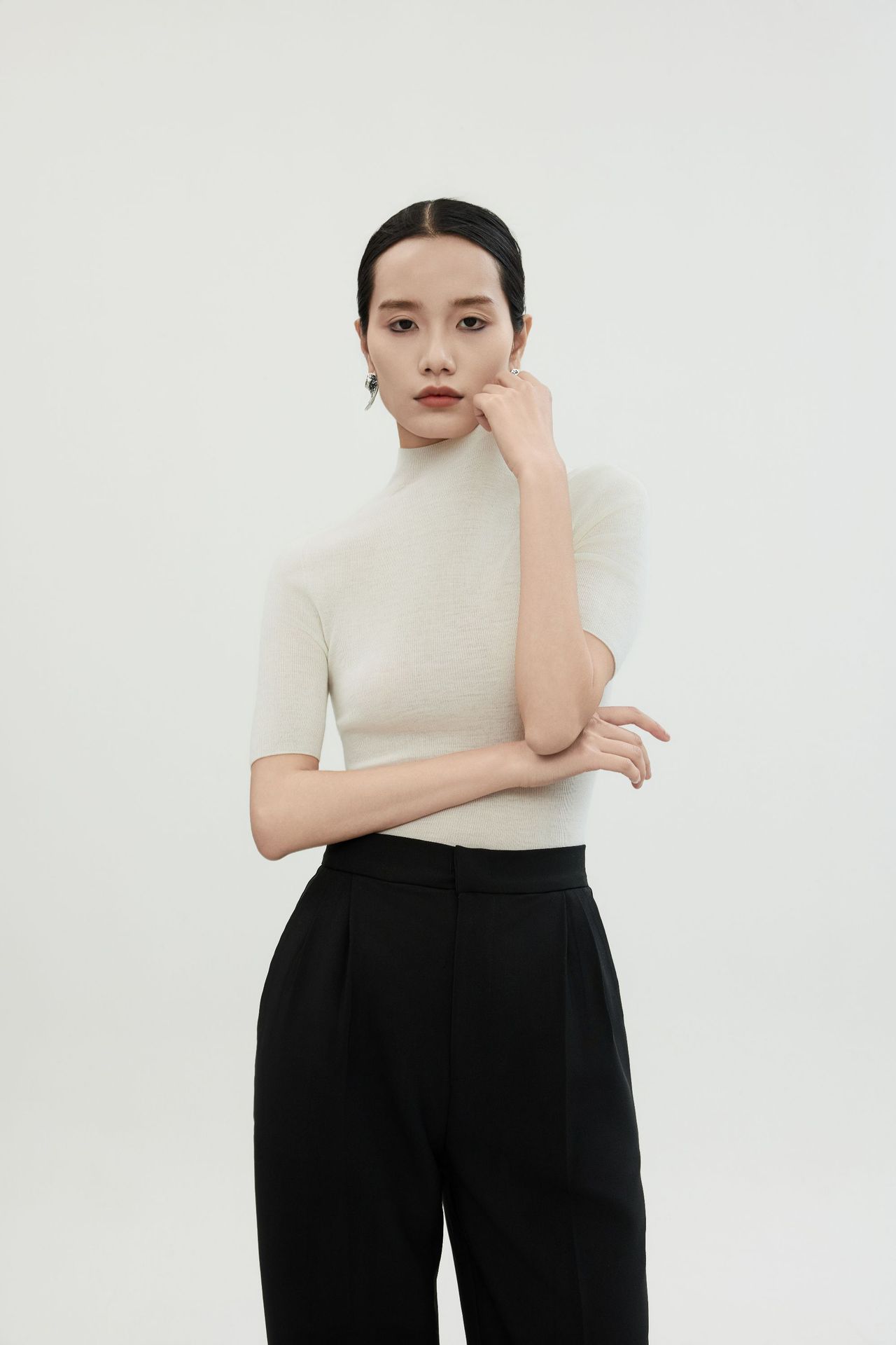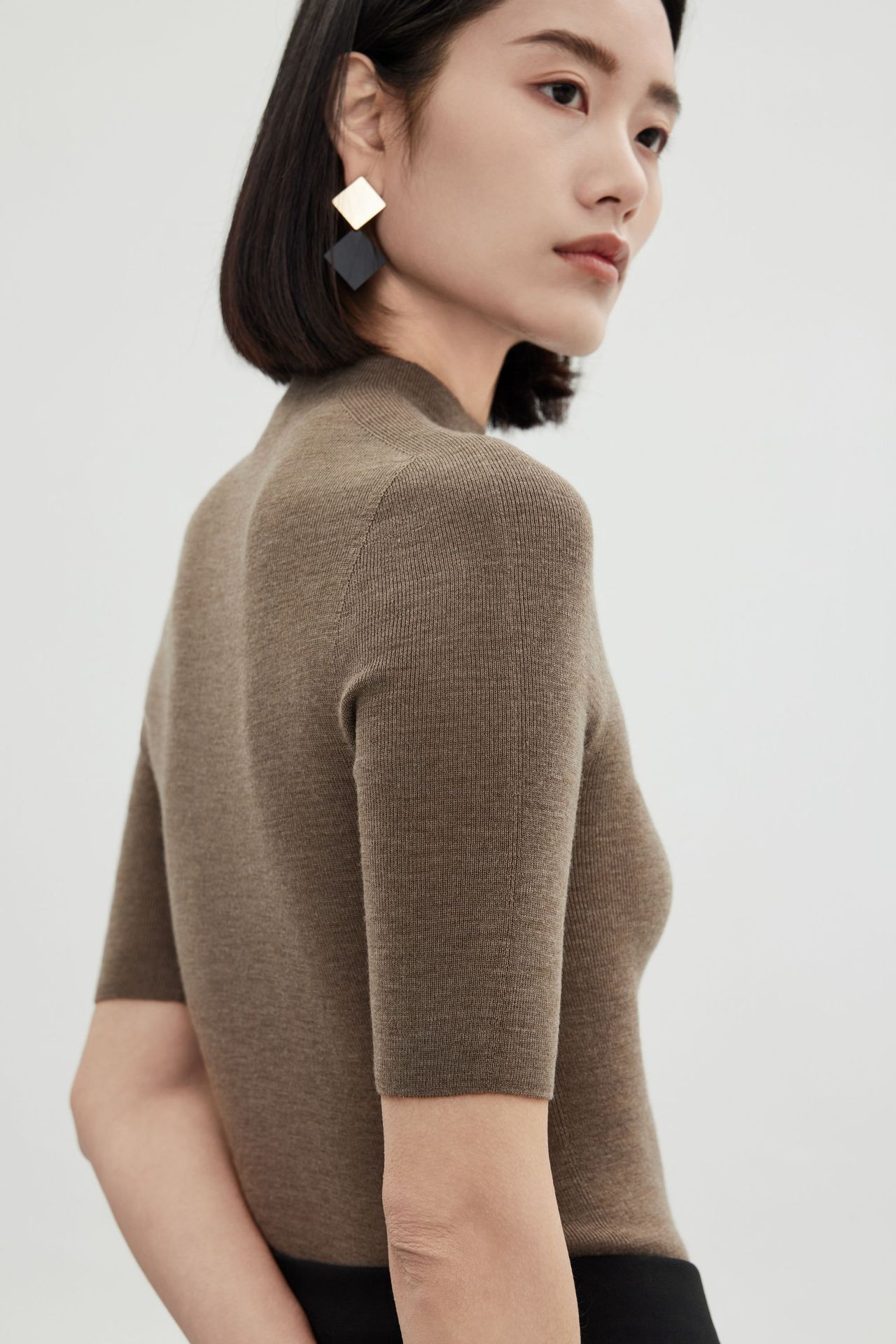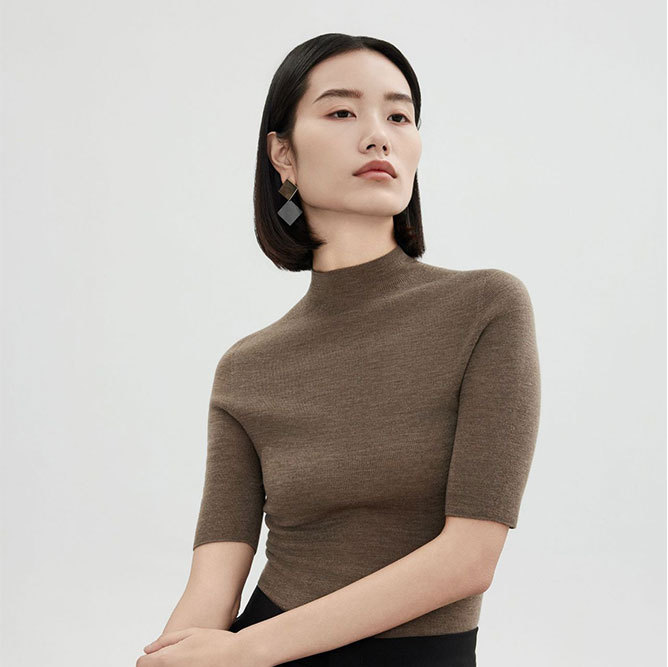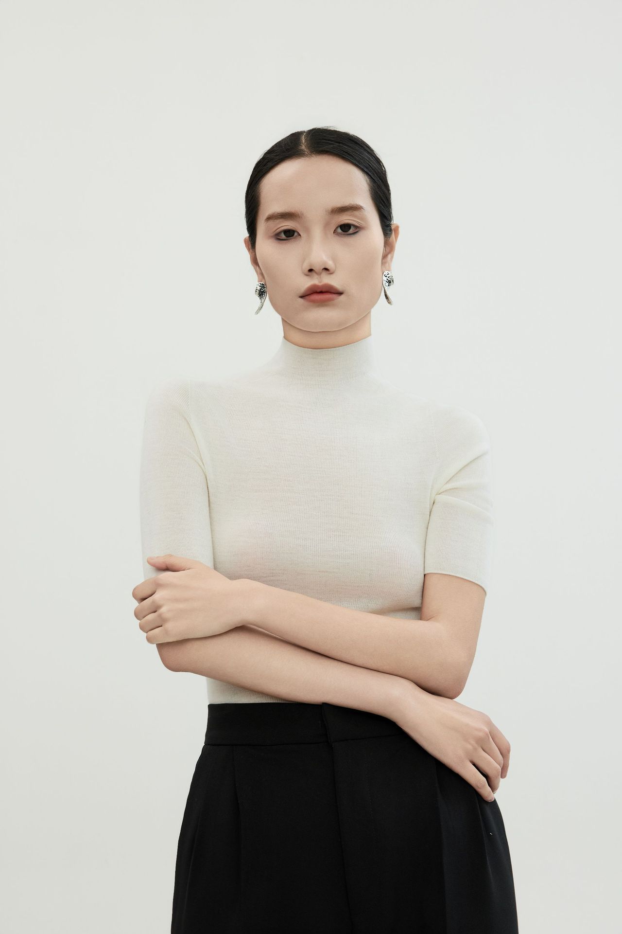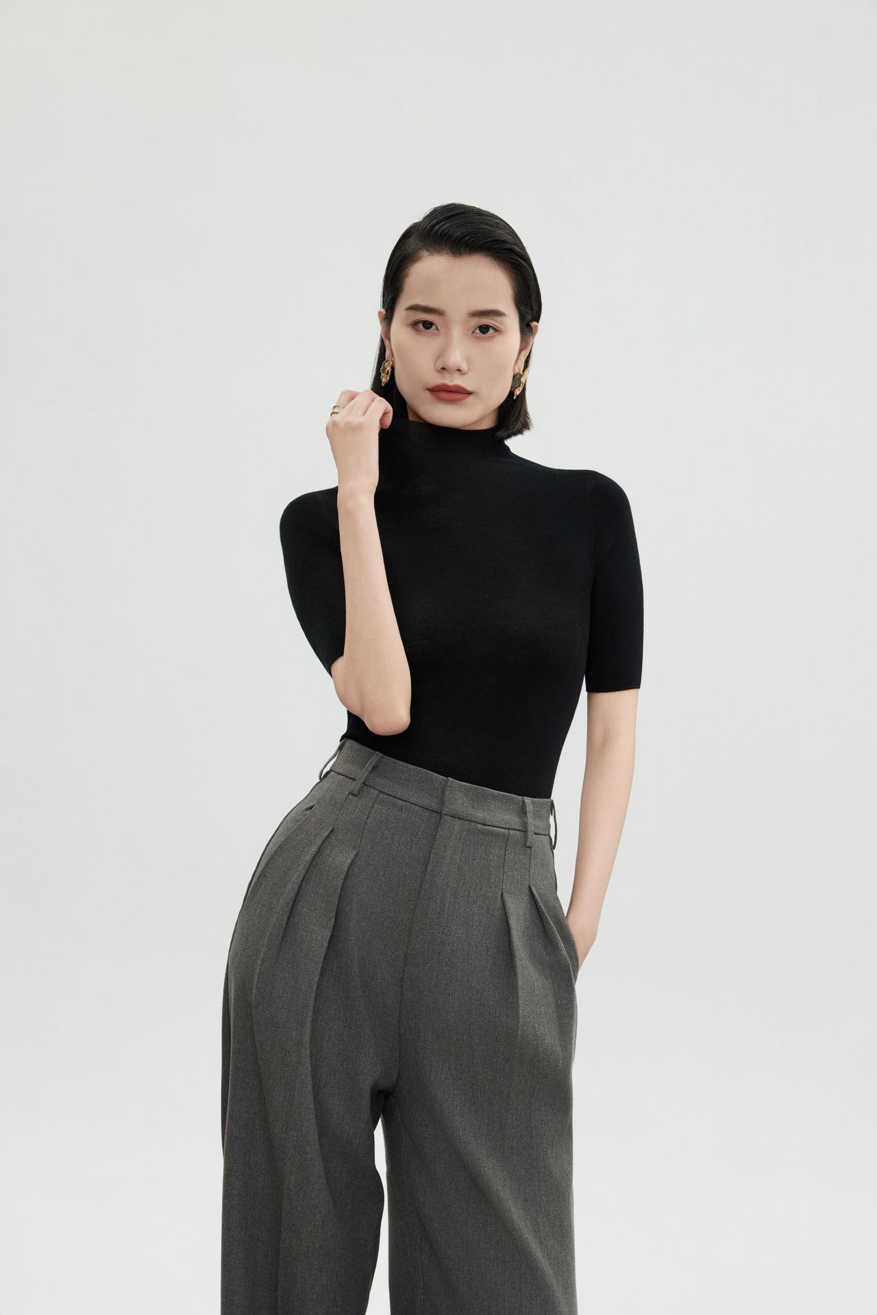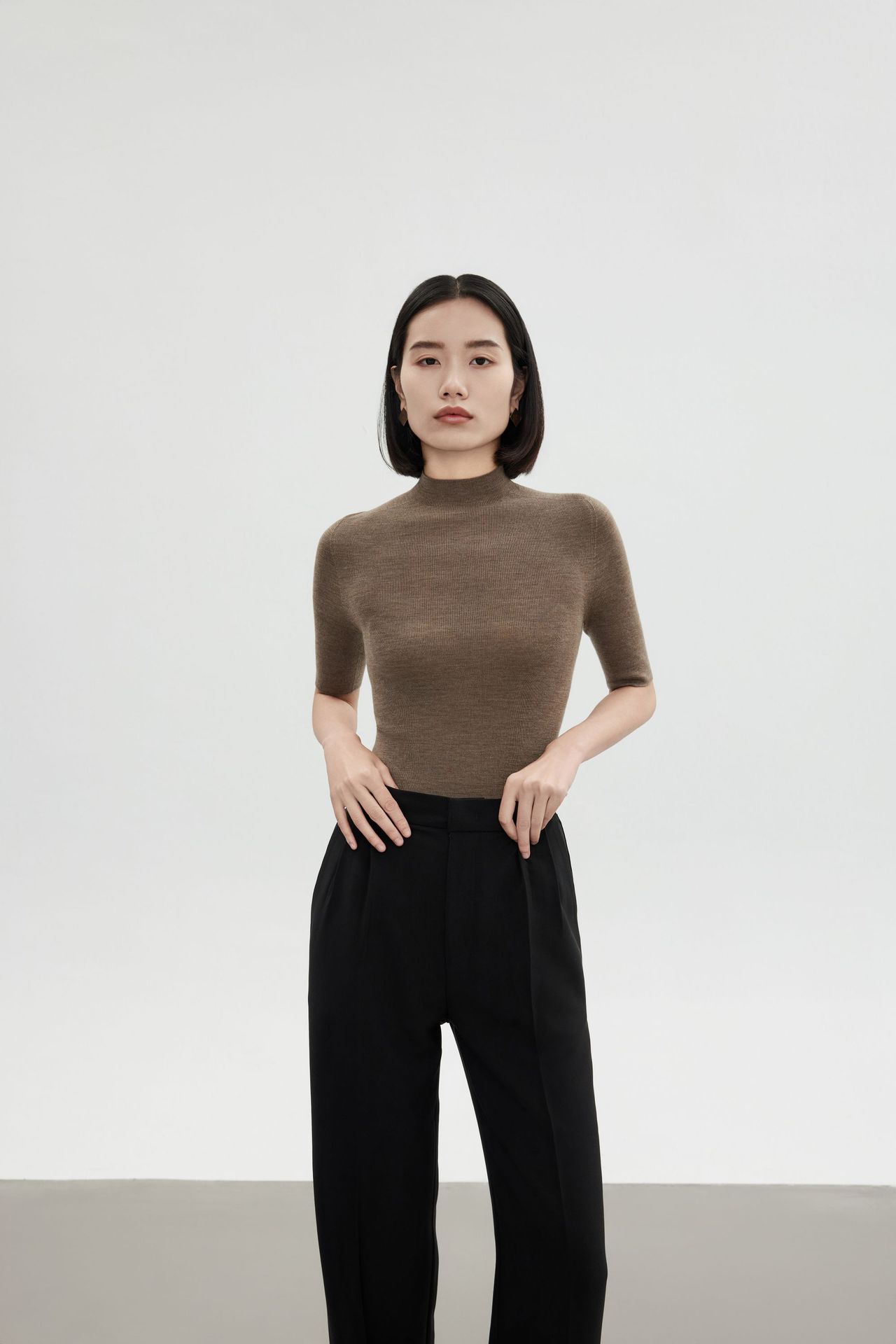 【2/60 Yangtze yarn】Бесшовный трикотажный топ из 100% шерсти с воротником-стойкой и рукавами три четверти, тонкий фасон, для женщин.