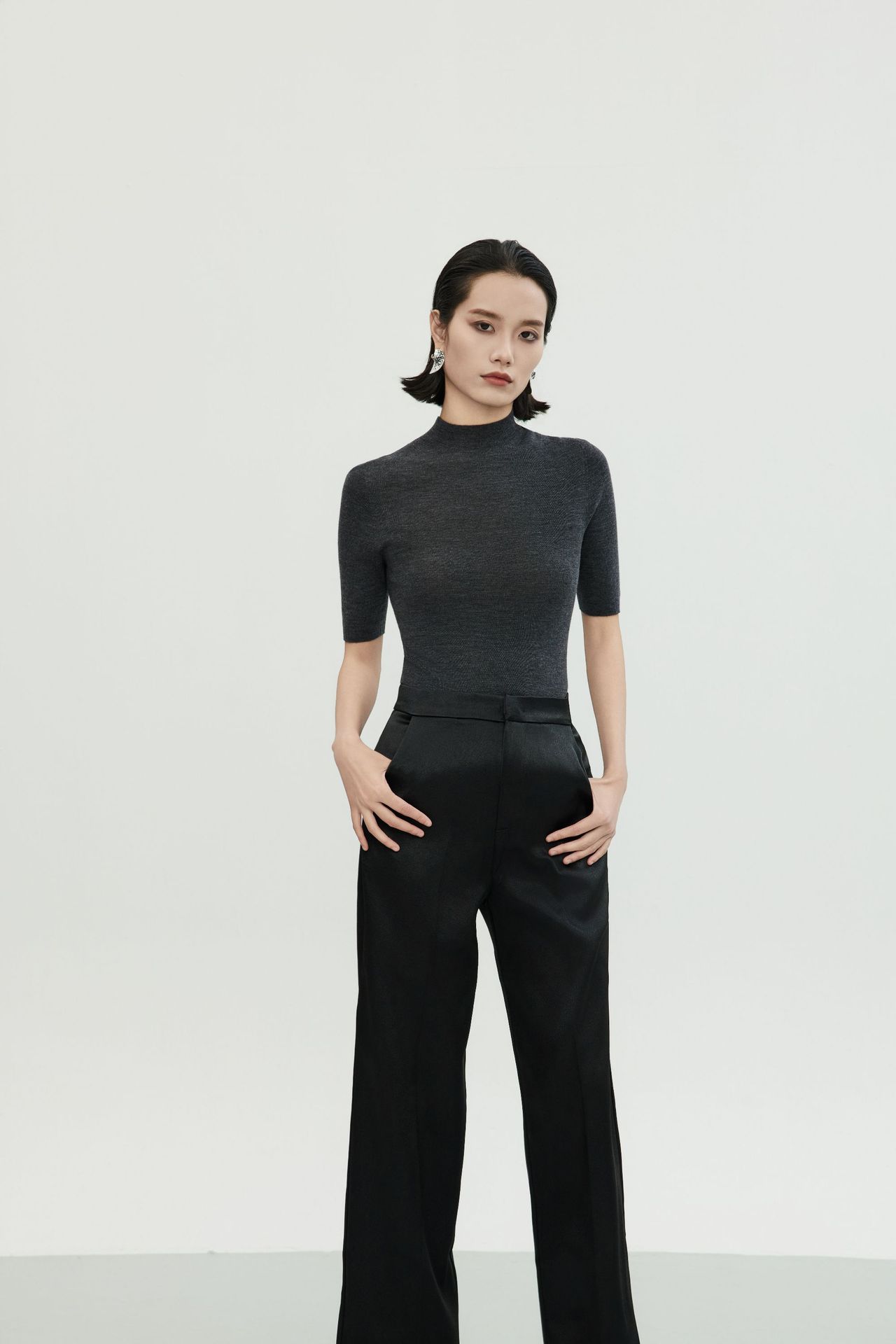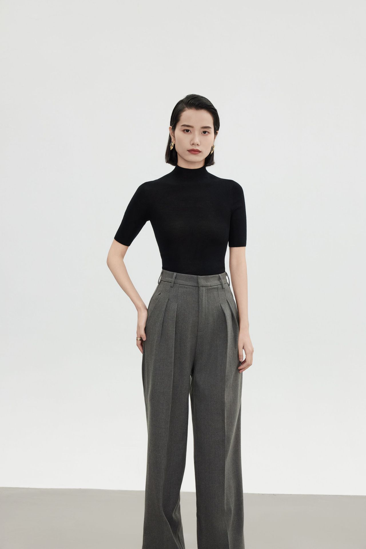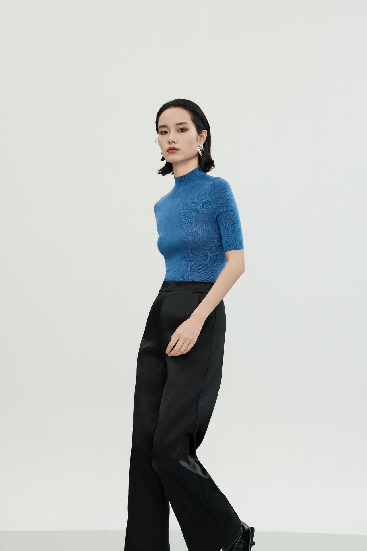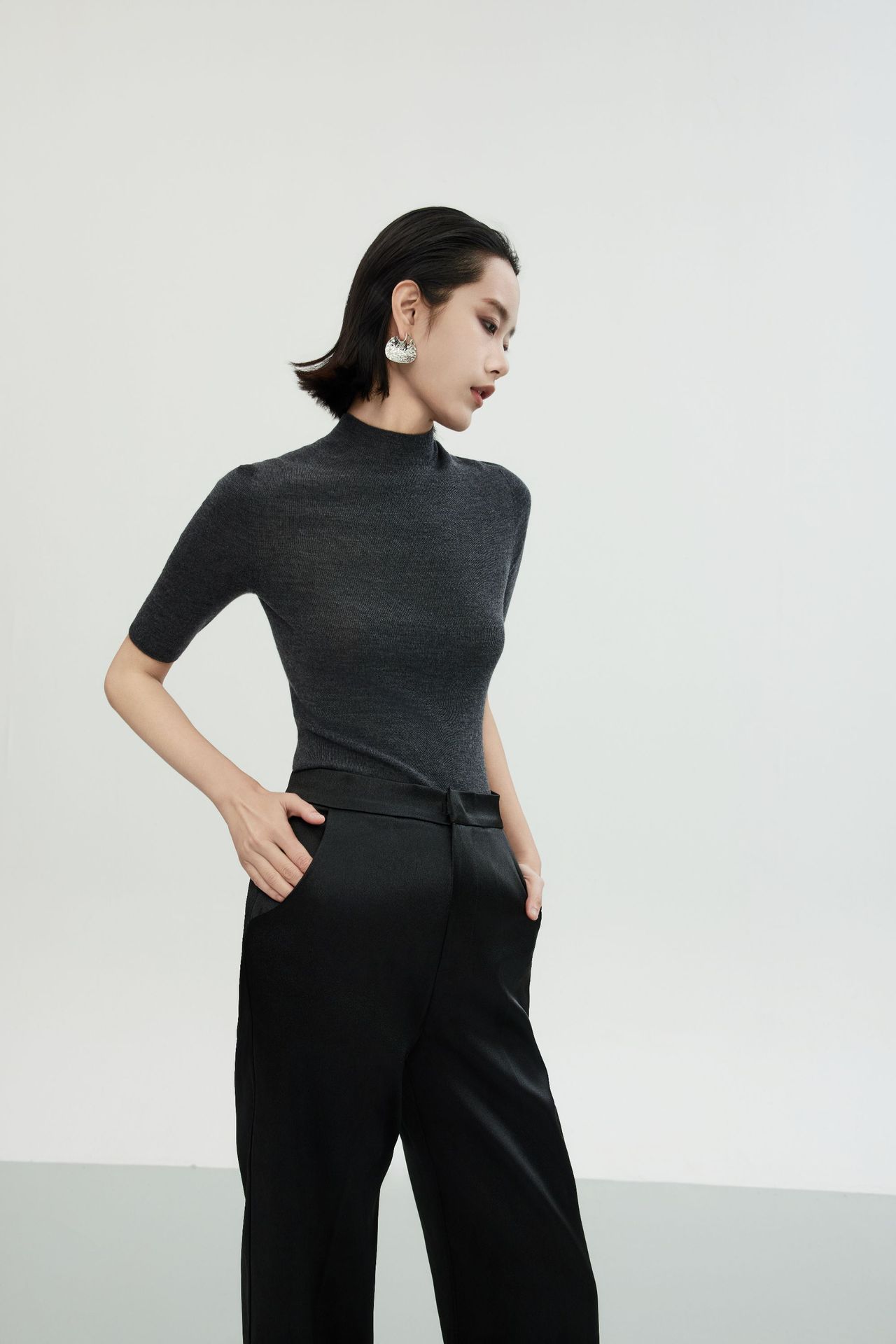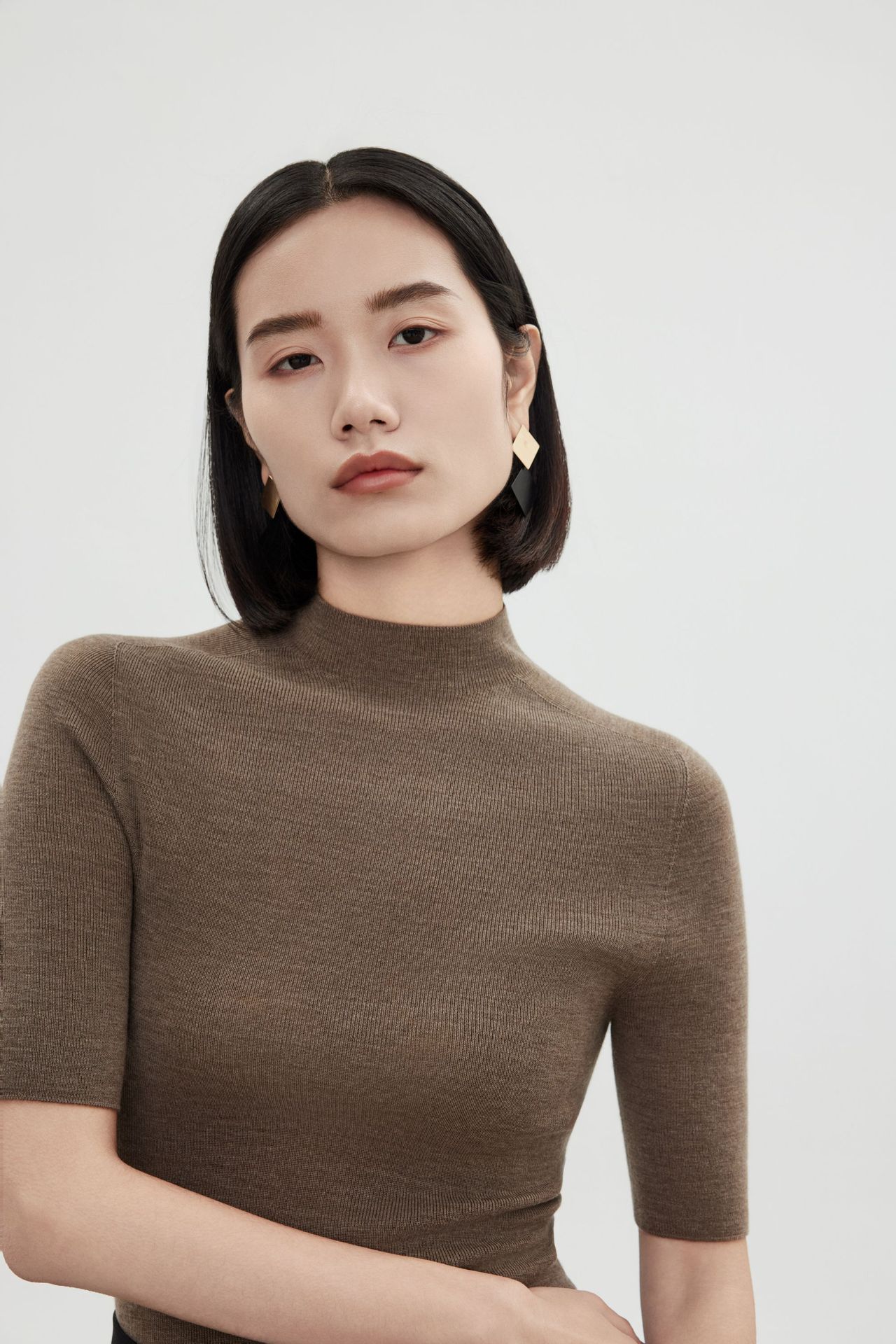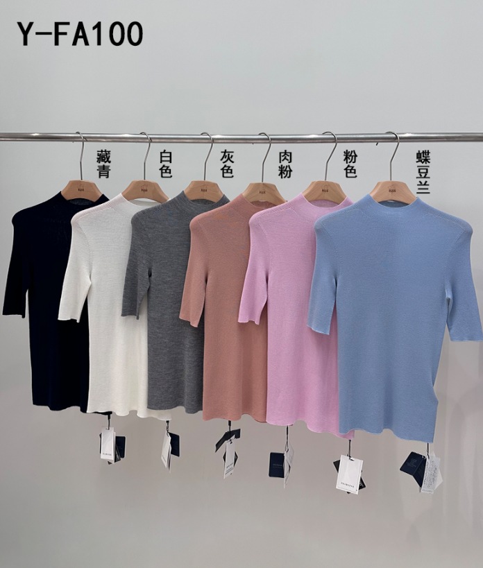 【2/60 Yangtze yarn】Бесшовный трикотажный топ из 100% шерсти с воротником-стойкой и рукавами три четверти, тонкий фасон, для женщин.