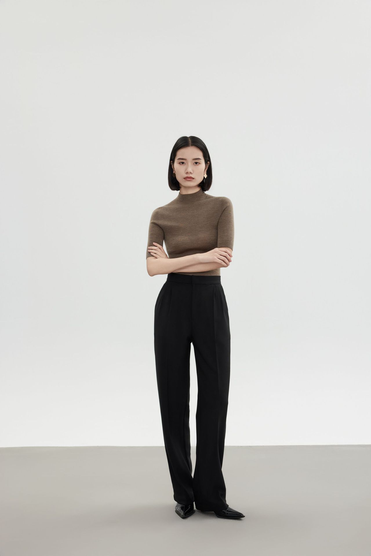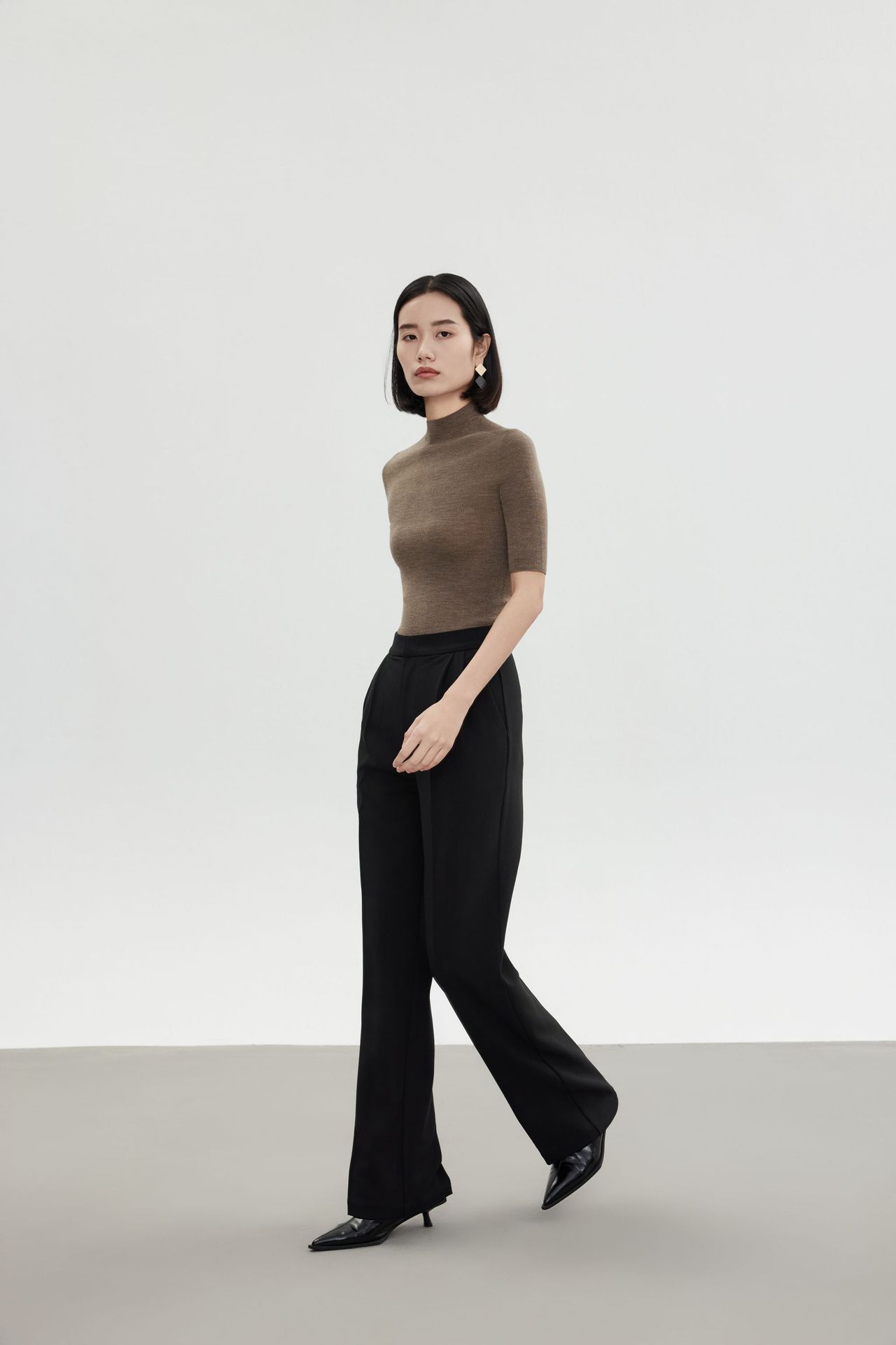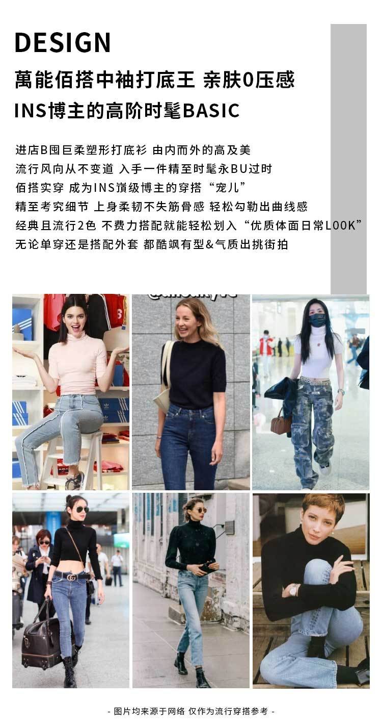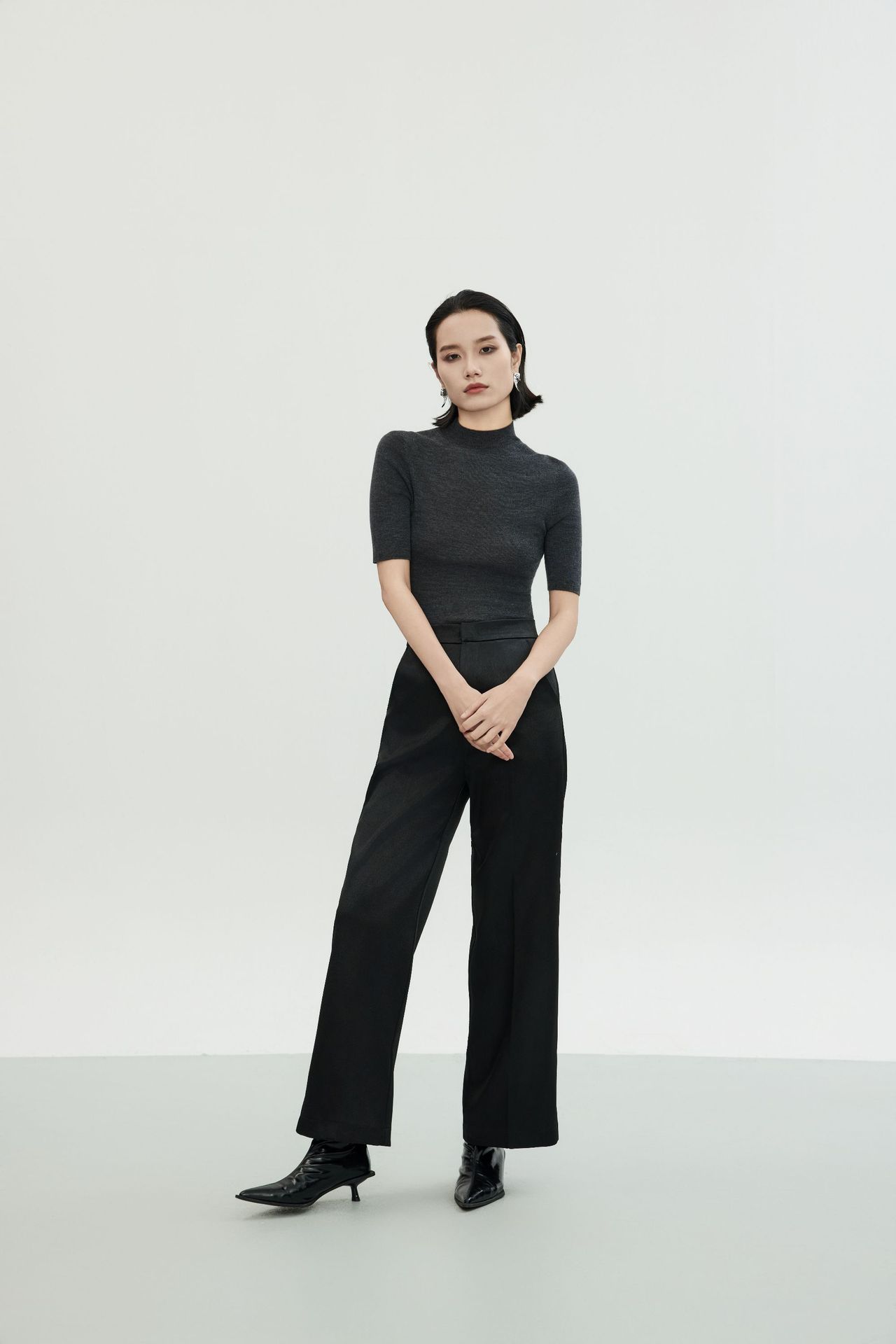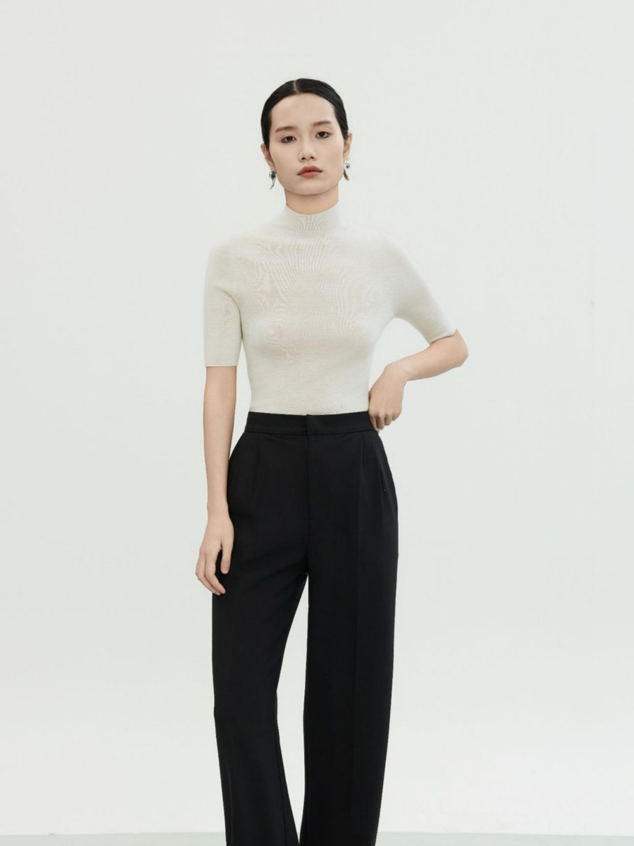 【2/60 Yangtze yarn】Бесшовный трикотажный топ из 100% шерсти с воротником-стойкой и рукавами три четверти, тонкий фасон, для женщин.