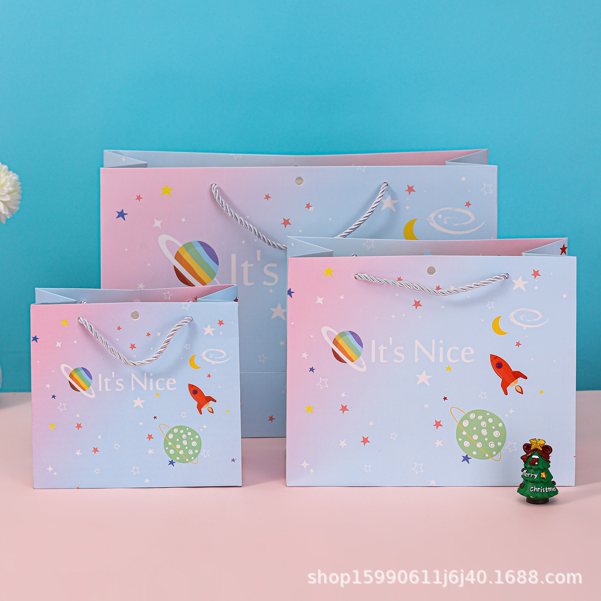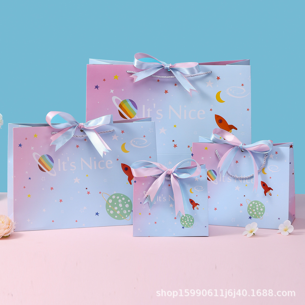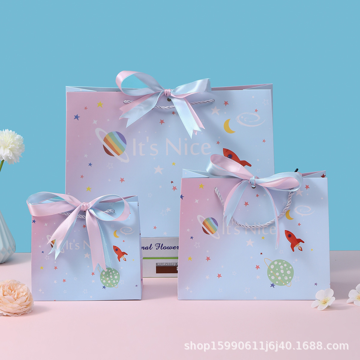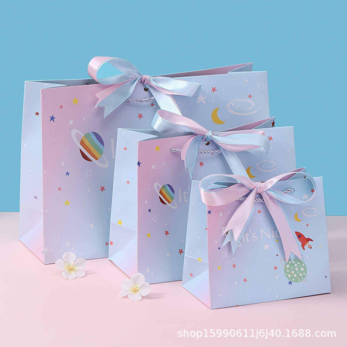 Космическая подарочная сумка двухцветная лента; Космическая подарочная сумка без ленты