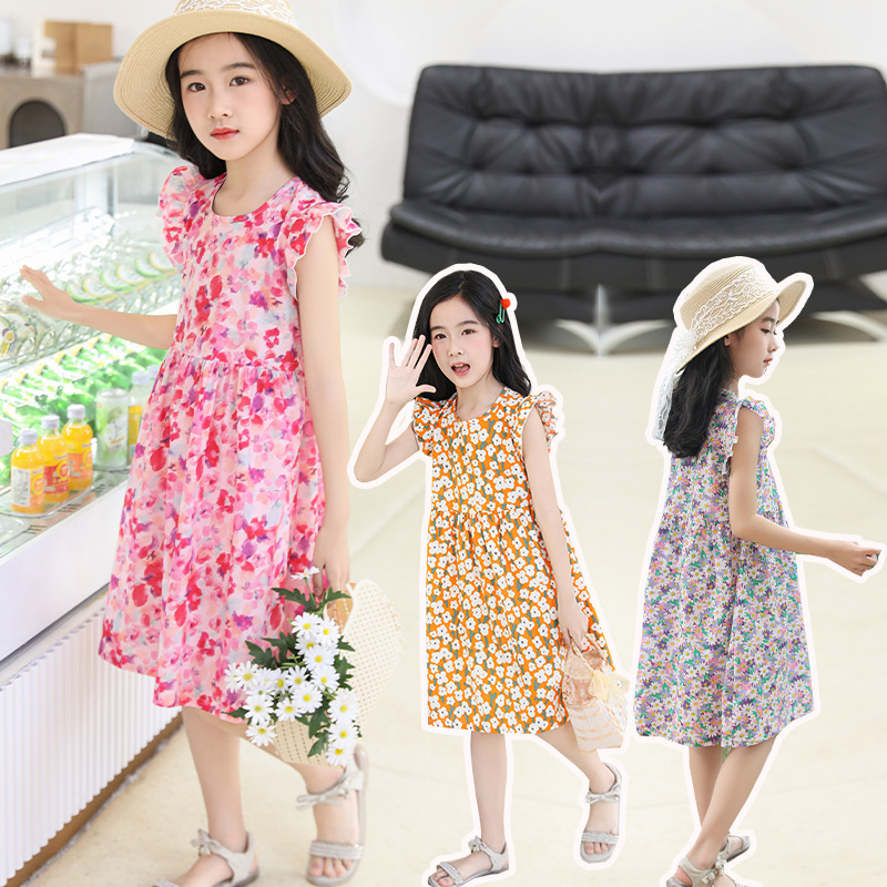 2024 новые летние тонкие девушки цветочные платья хлопковые шелковые летающие рукава искусственные хлопчатобумажные ночные платья детские платья принцессы