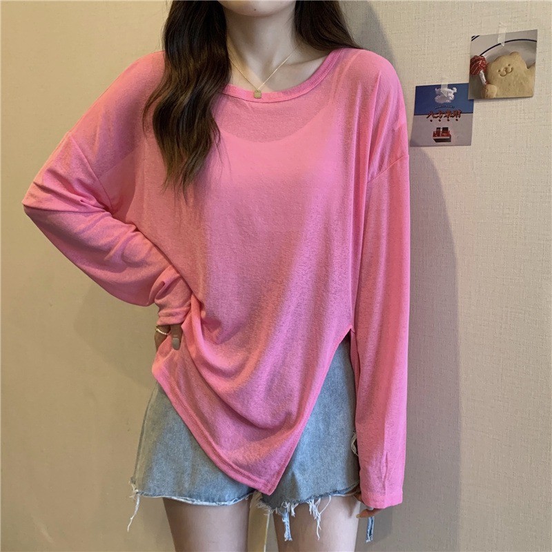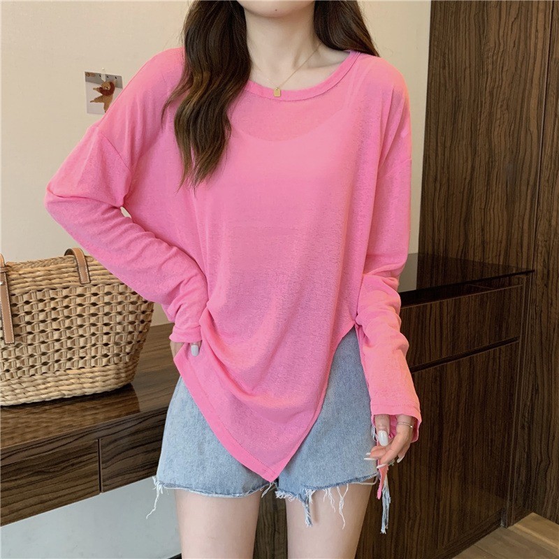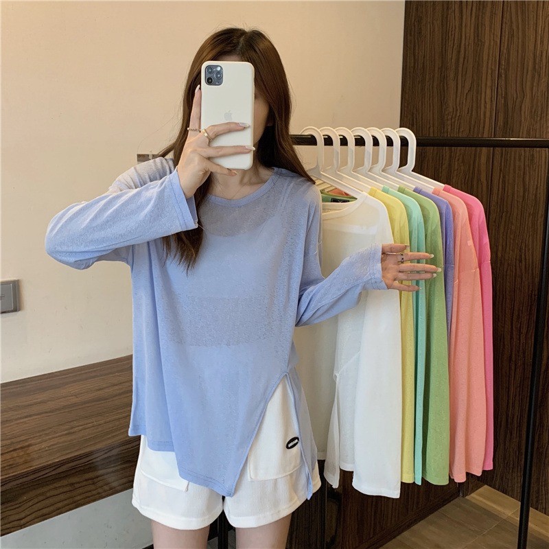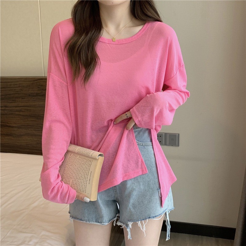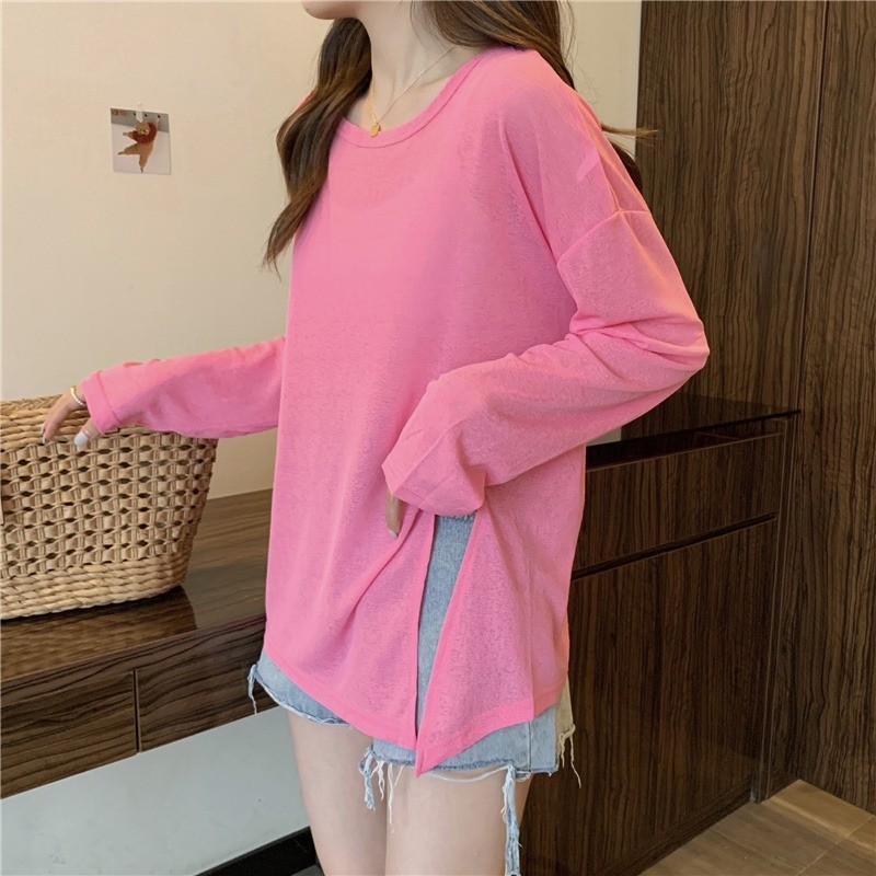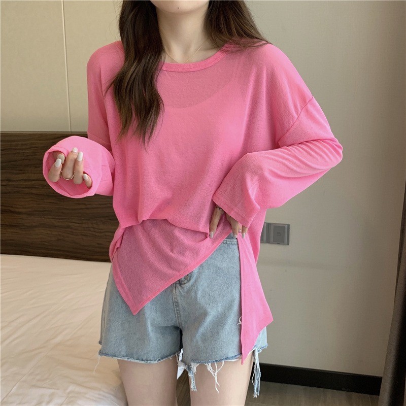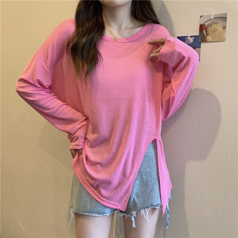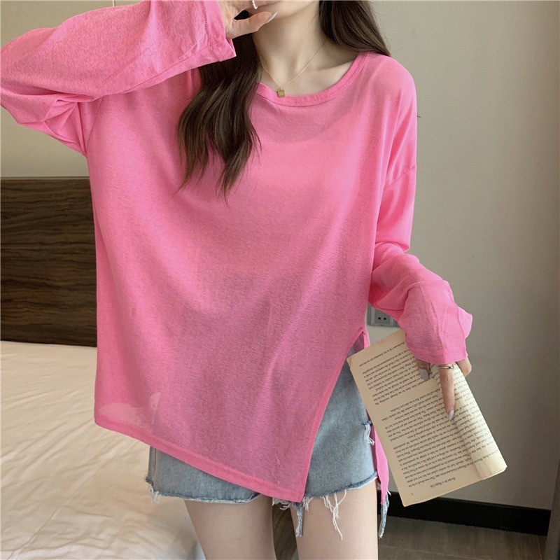 Тонкая, слегка прозрачная женская футболка с длинными рукавами и разрезом для защиты от солнца, летняя женская футболка в стиле k, новинка 2025, свободная блузка ярких цветов с кондиционером