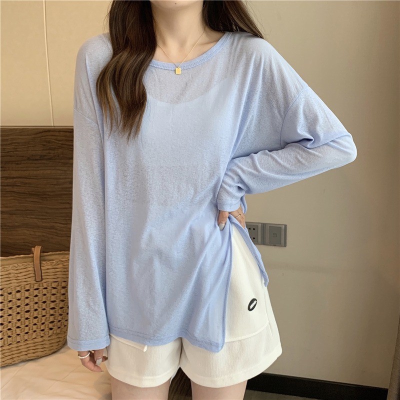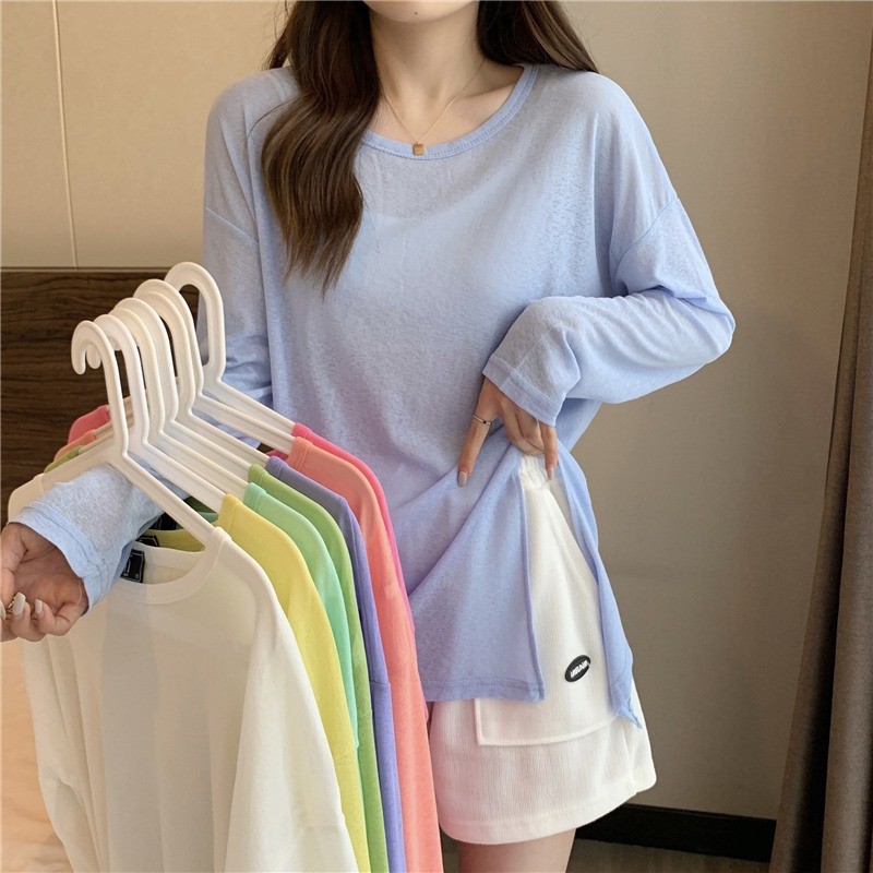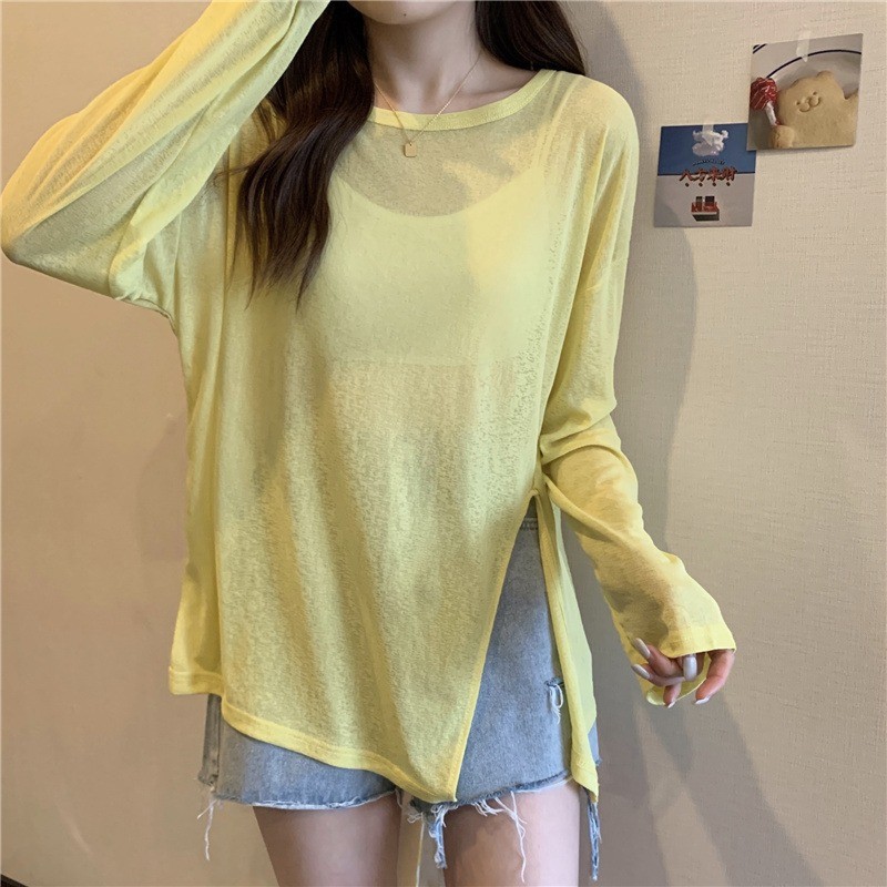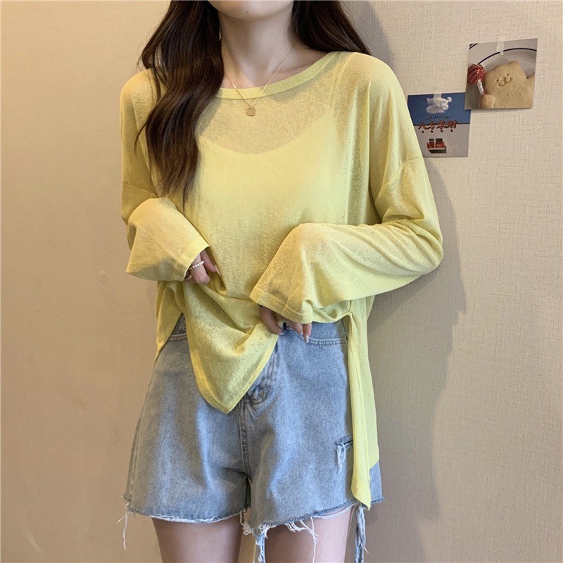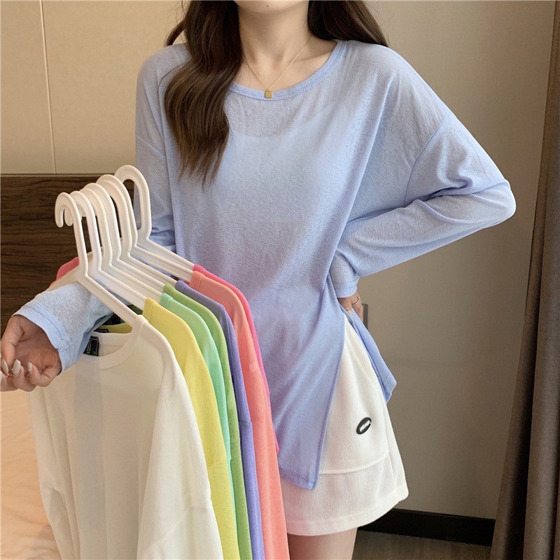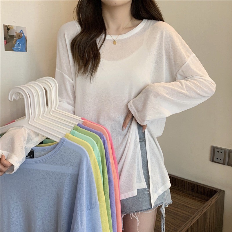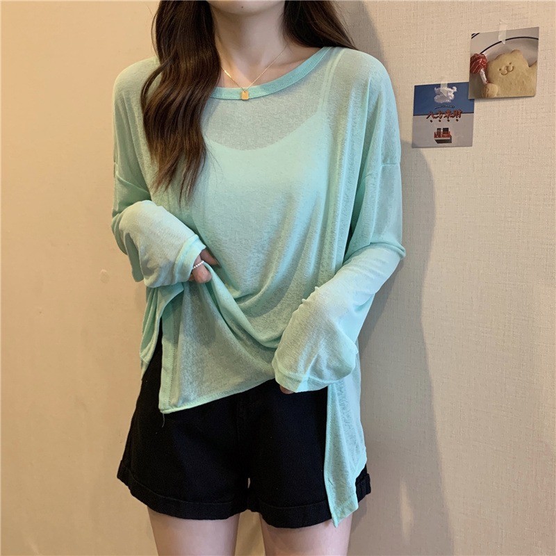 Тонкая, слегка прозрачная женская футболка с длинными рукавами и разрезом для защиты от солнца, летняя женская футболка в стиле k, новинка 2025, свободная блузка ярких цветов с кондиционером