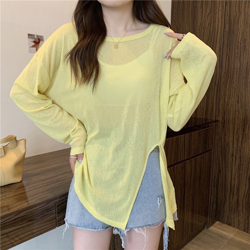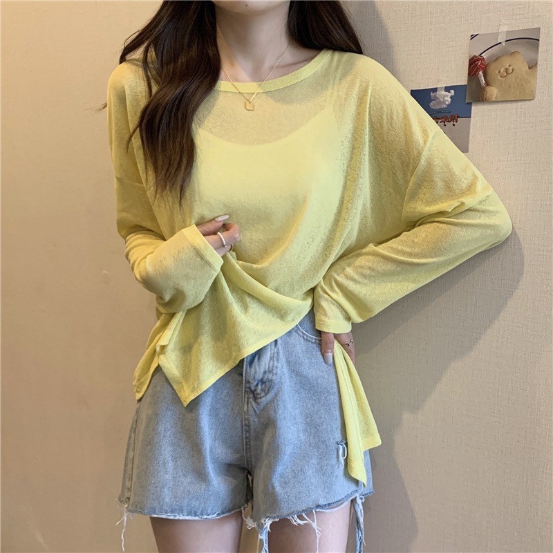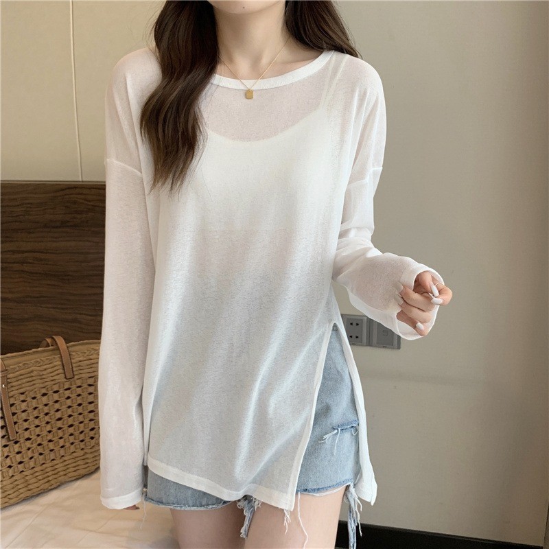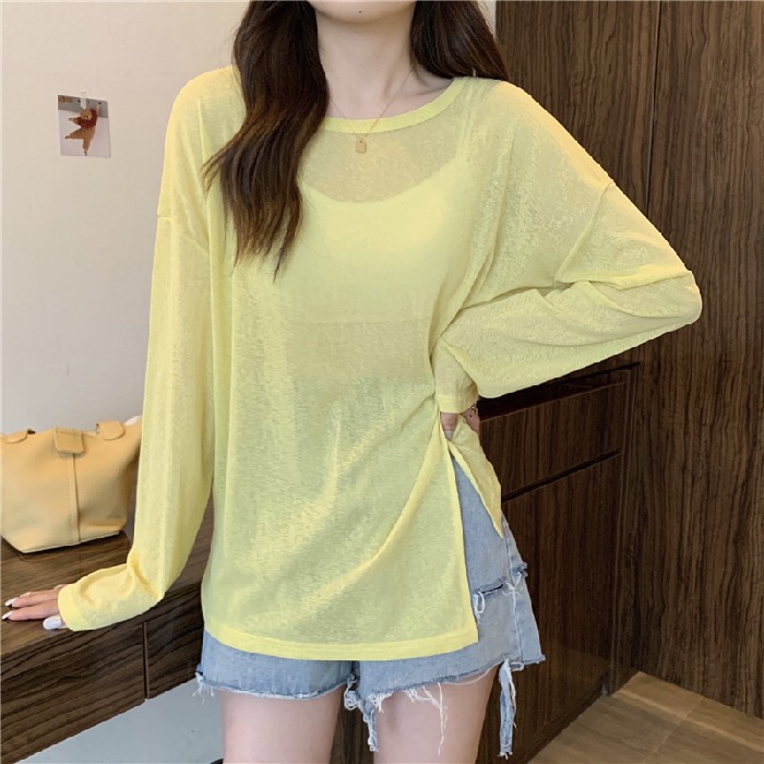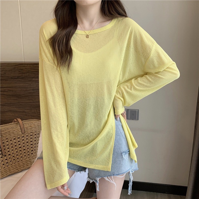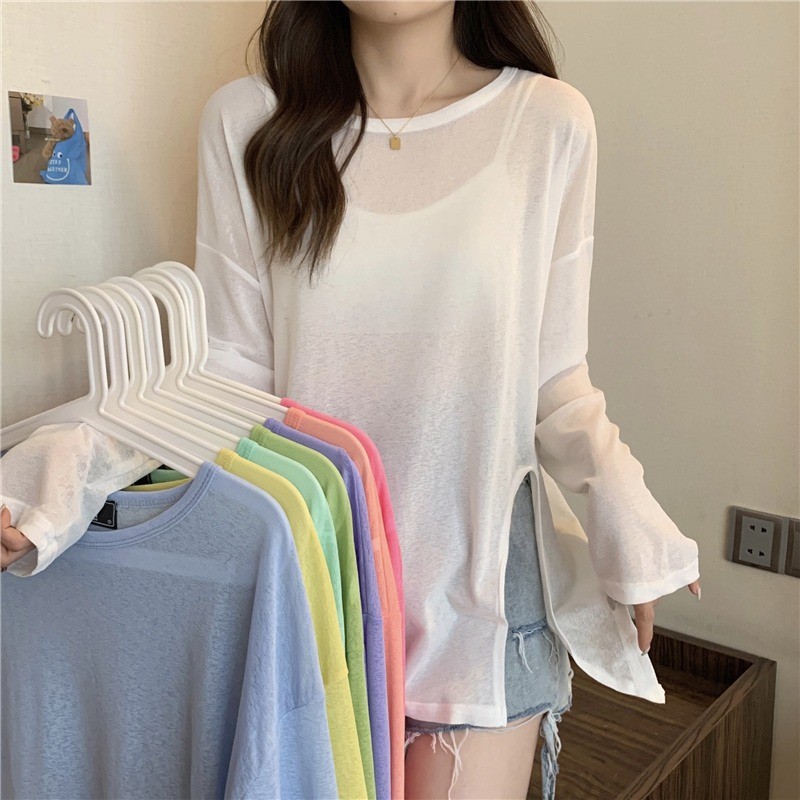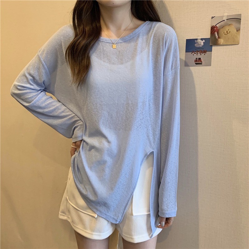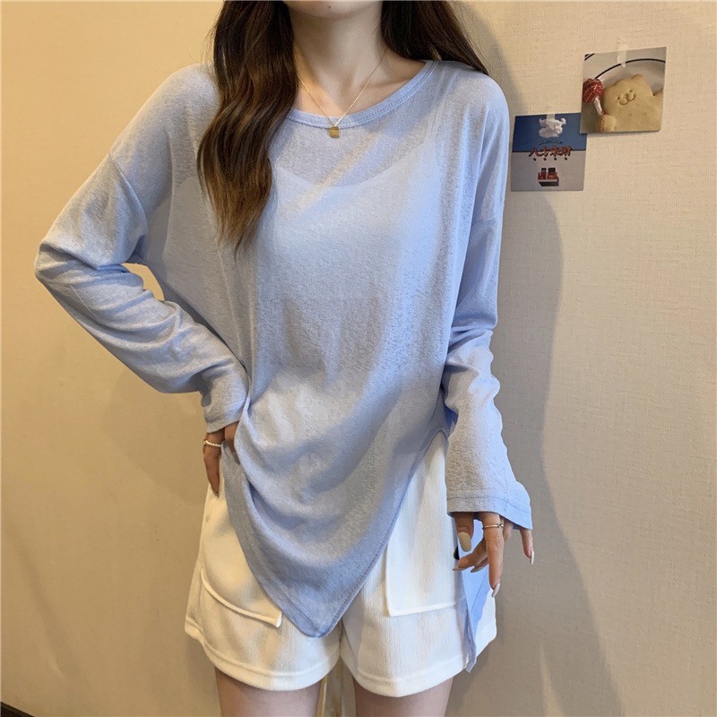 Тонкая, слегка прозрачная женская футболка с длинными рукавами и разрезом для защиты от солнца, летняя женская футболка в стиле k, новинка 2025, свободная блузка ярких цветов с кондиционером