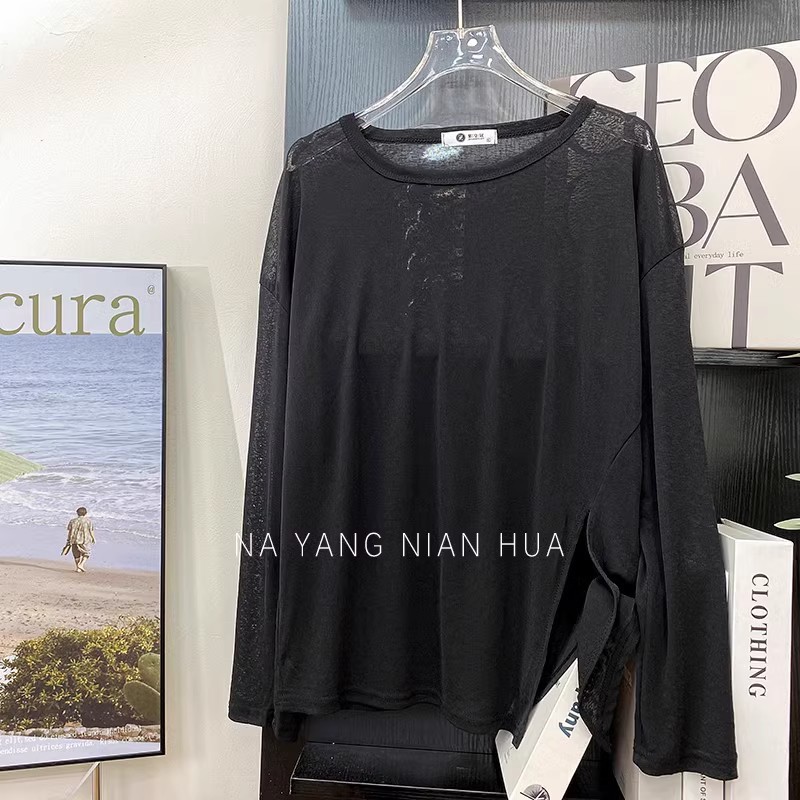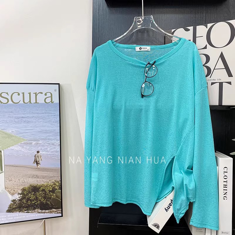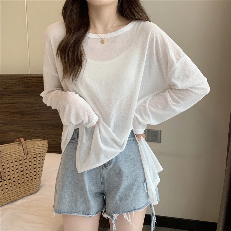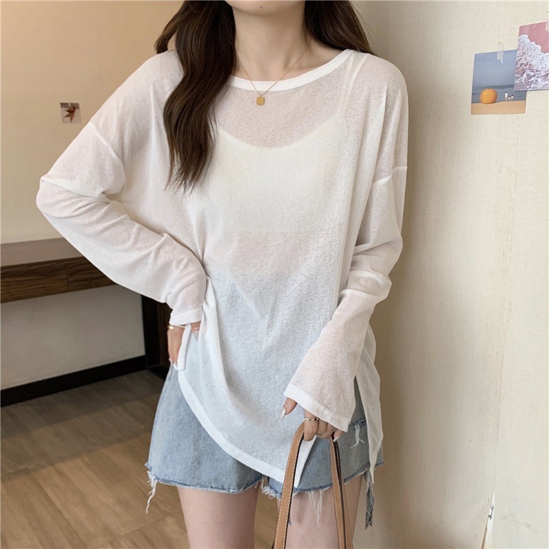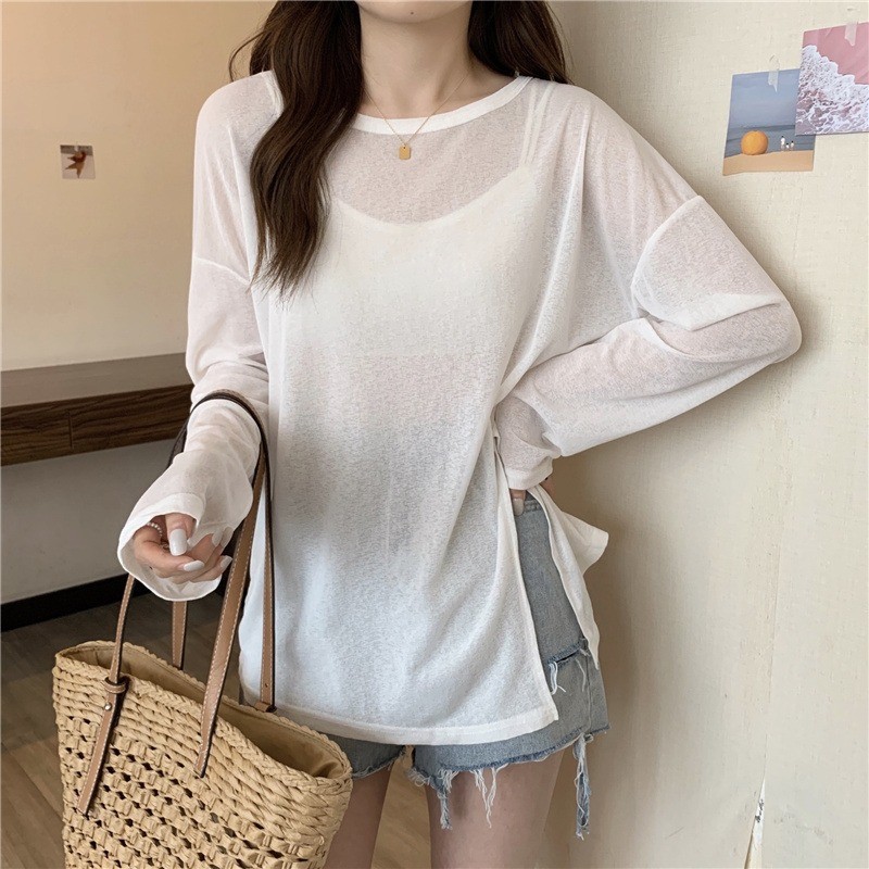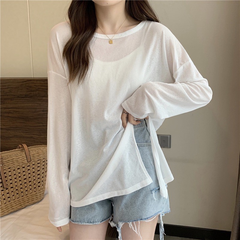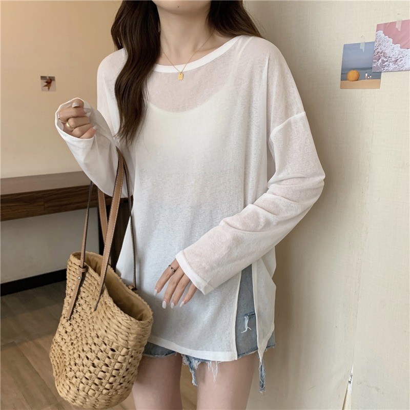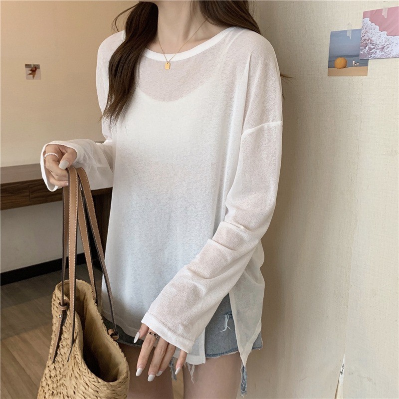 Тонкая, слегка прозрачная женская футболка с длинными рукавами и разрезом для защиты от солнца, летняя женская футболка в стиле k, новинка 2025, свободная блузка ярких цветов с кондиционером