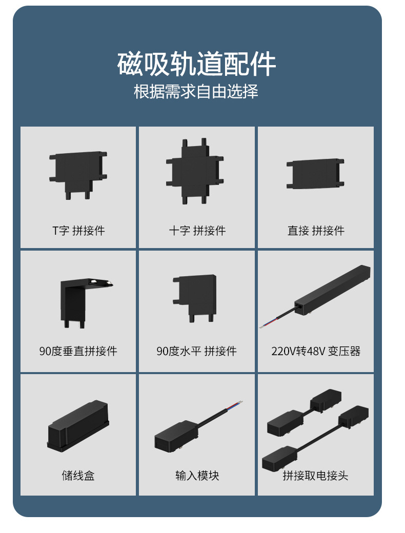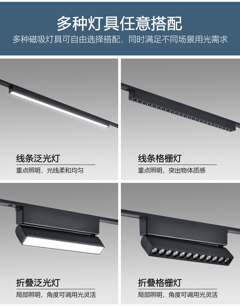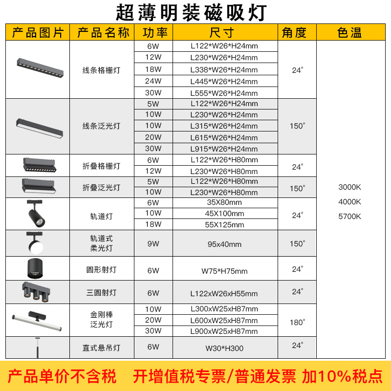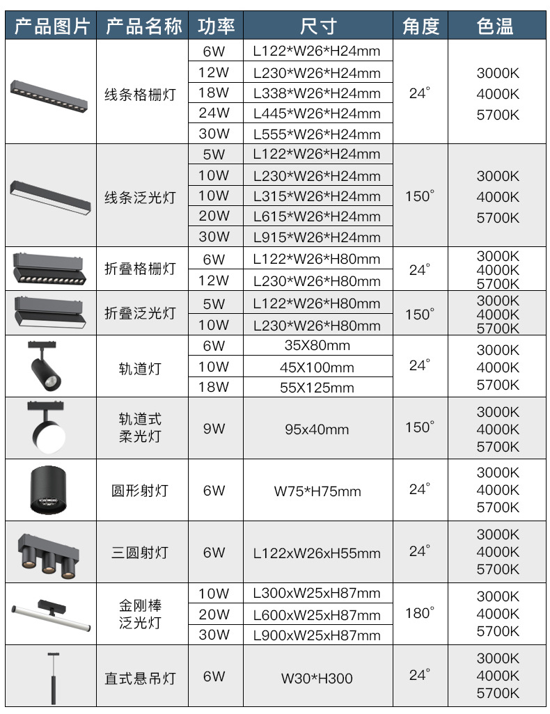Лампа решетки 122mm 6W; Сетчатый фонарь 230mm 12W; Сетчатый фонарь 338mm 18W; Сетчатый фонарь 445mm 24W; Лампа решетки 555mm 30W; Прожектор 122mm 5W; Прожектор 230mm 10W; Прожектор 315mm 15W; Прожектор 615mm 20W; Прожектор 915mm 30W; Складной решетчатый фонарь 122mm 6W; Складной решетчатый фонарь 230mm 12W; Складной прожектор 122mm 5W; Складной прожектор 230mm 10W; Круглая прожекла 75mm 6W; Круглая регулируемая угловая прожекция 75mm 6W; Три круглых прожекла 122mm6W; Трасса прожекла 35*80mm 6W; Трасса прожекла 45*100mm 10W; Трасса прожекла 55 * 125mm18W; Круглый прожектор 95 * 40mm9W; Алмазная палка прожектор 300 mm10 W; Алмазная палка прожектор 600 mm20W; Алмазная палка прожектор 900 mm30W; Подвесной светильник 30*300mm 6W; Орбитальный источник питания 48V100W; Магнитно-всасывающий рельс питания 48V200W; Прямая сращивание; L-образный угол сшивания; Т-образный угловой сшитый элемент; Крестовый сращивание; Коробка для хранения электропитания; Ультратонкий магнитный трек для накладного монтажа 1m; Ультратонкий магнитный трек для накладного монтажа 2m; Ультратонкий магнитный трек для накладного монтажа 3m
