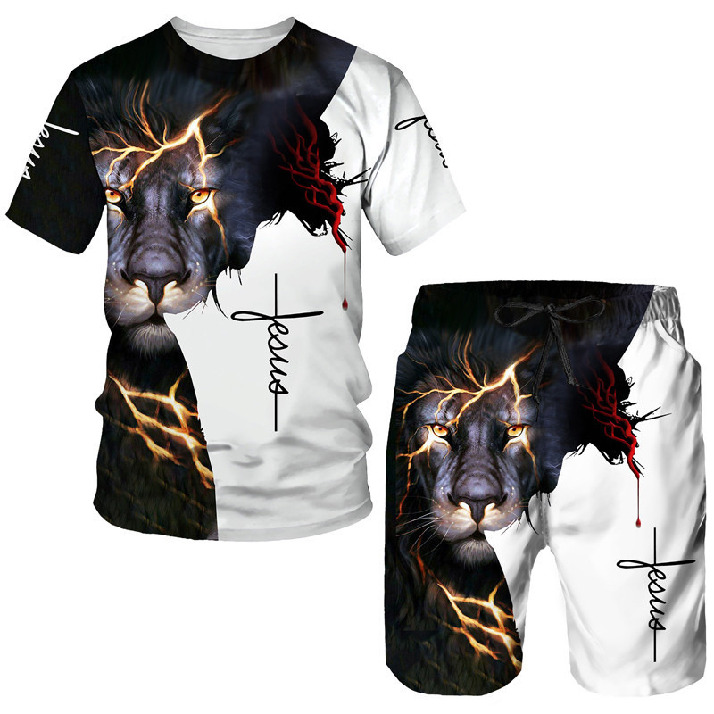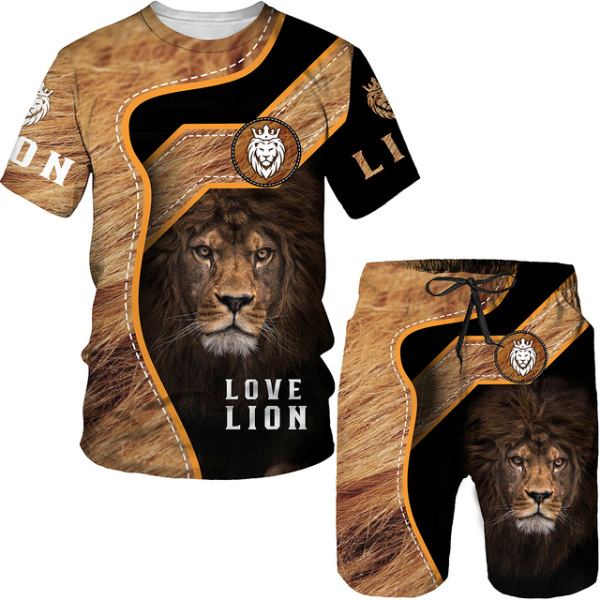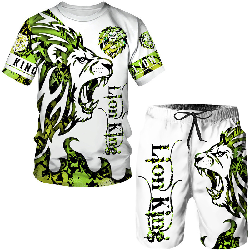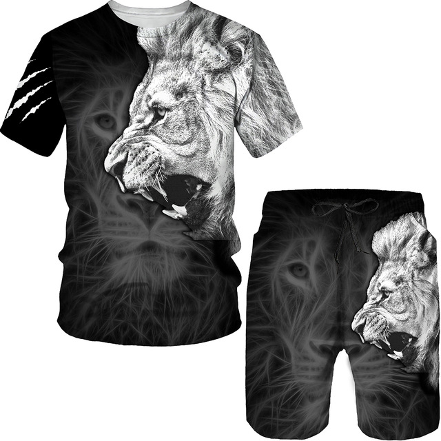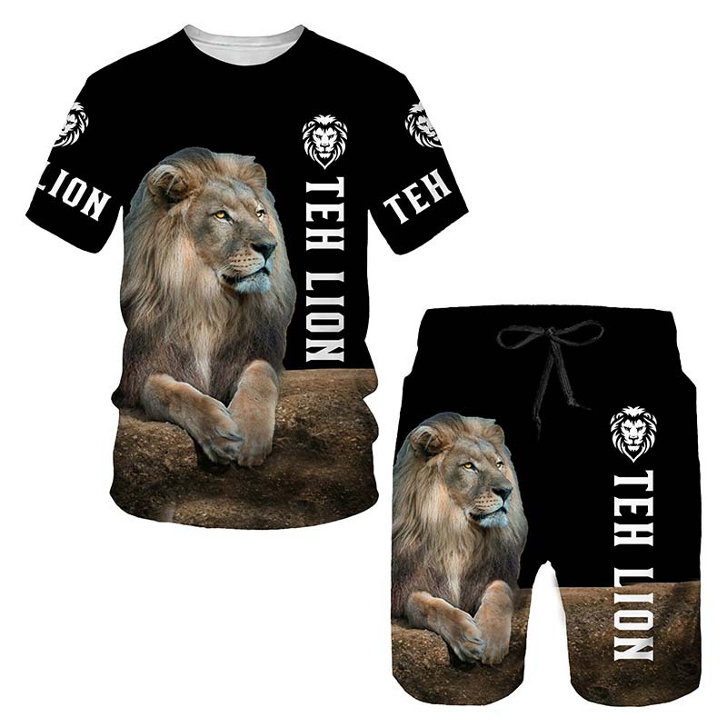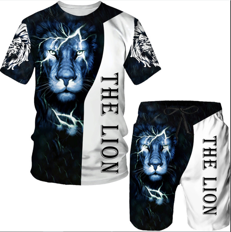 Мода 3D Лев с принтом Мужская спортивная одежда 2 комплекта Летний костюм Трансграничный AliExpress Новая футболка Шорты