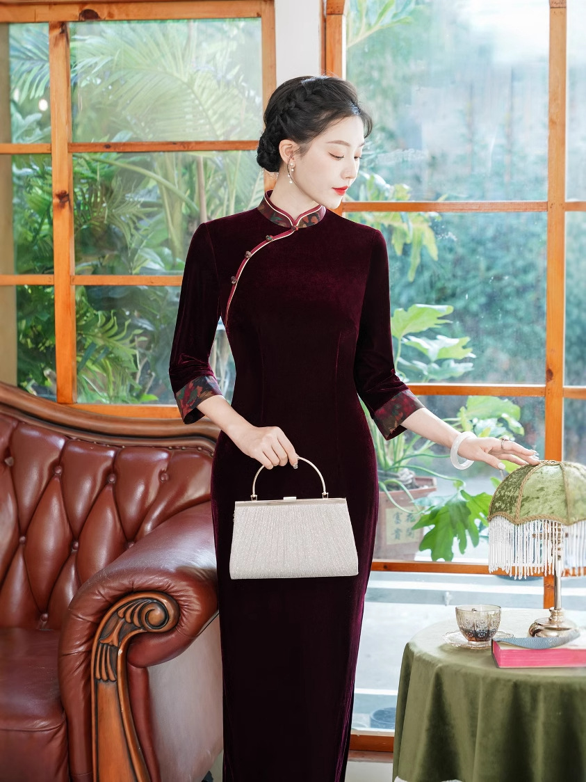 Плюшевая утолщение Hongyun вышитый чонсам 2024 новый длинный сшитый завод прямая модное платье cheongsam
