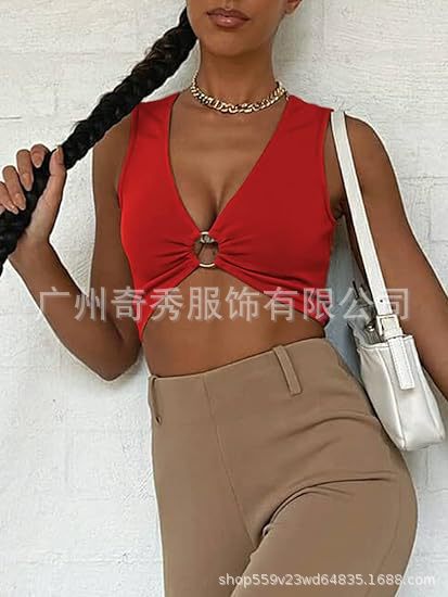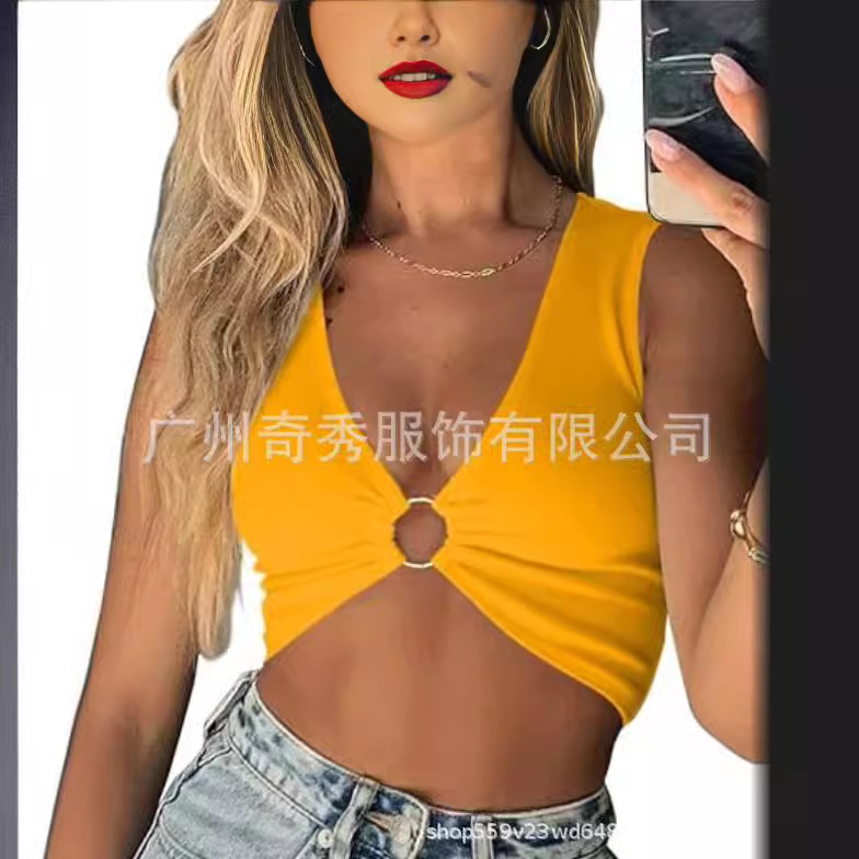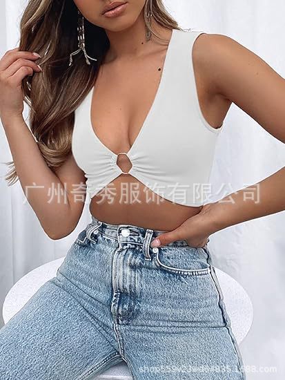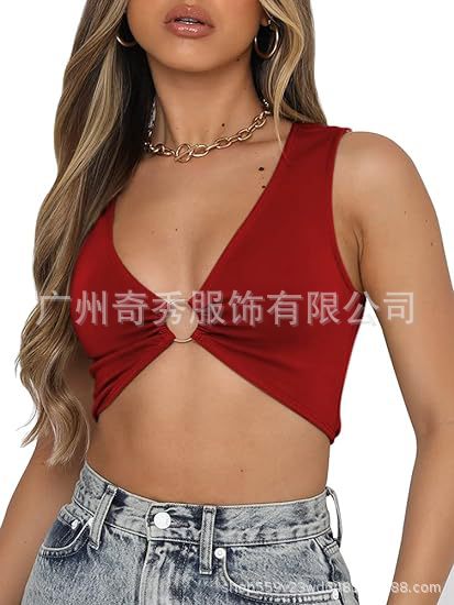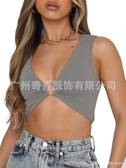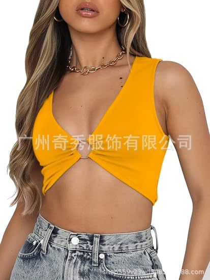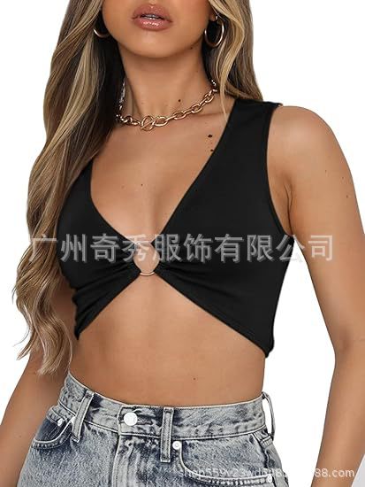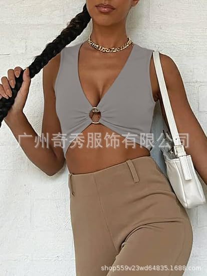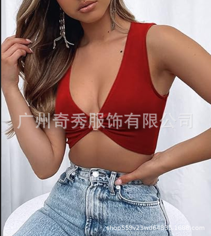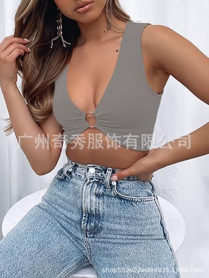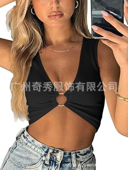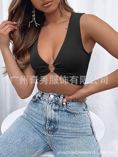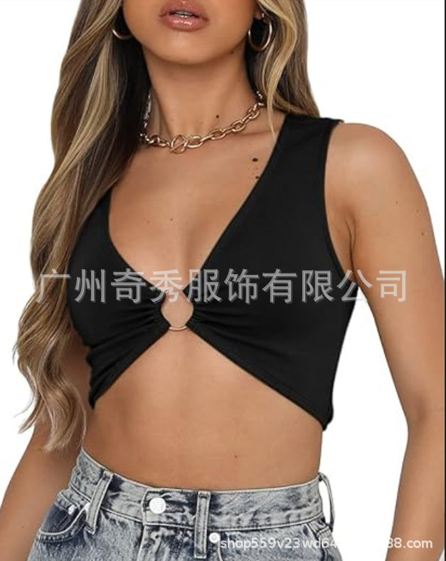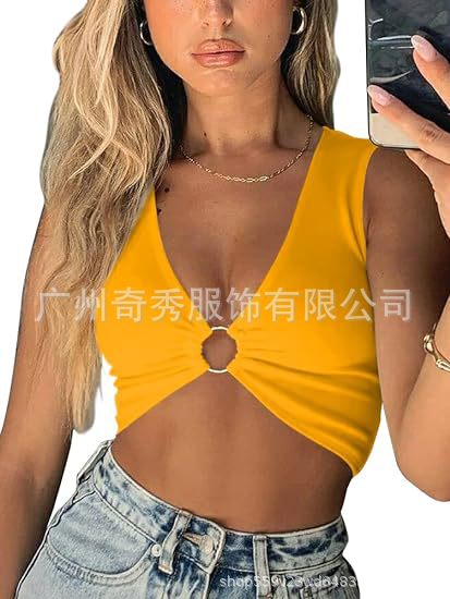 2024 Летний сексуальный укороченный топ для женщин, топ без рукавов с глубоким v-образным вырезом, однотонная майка с глубоким вырезом.