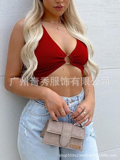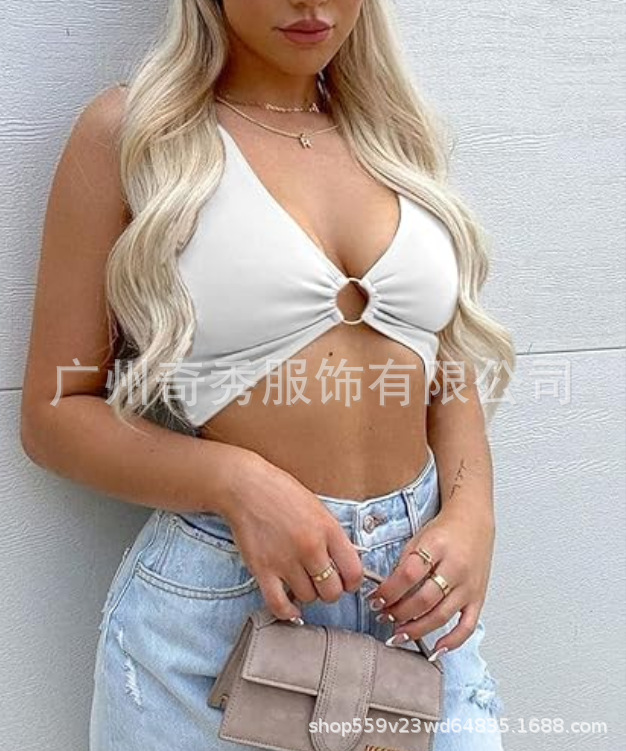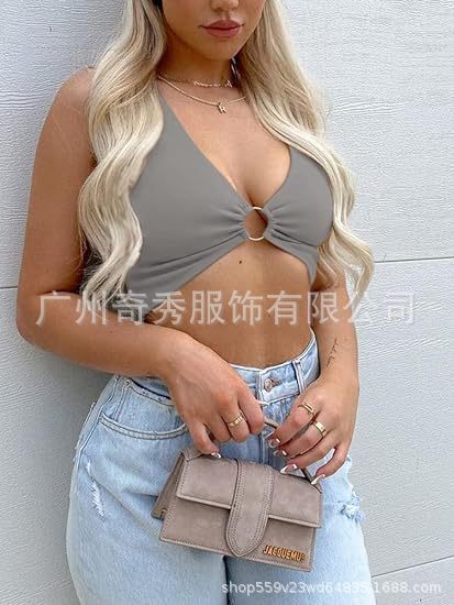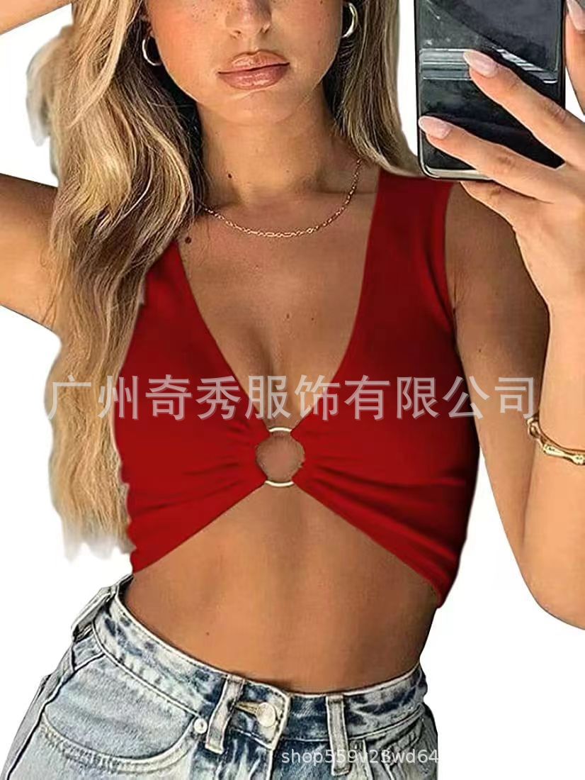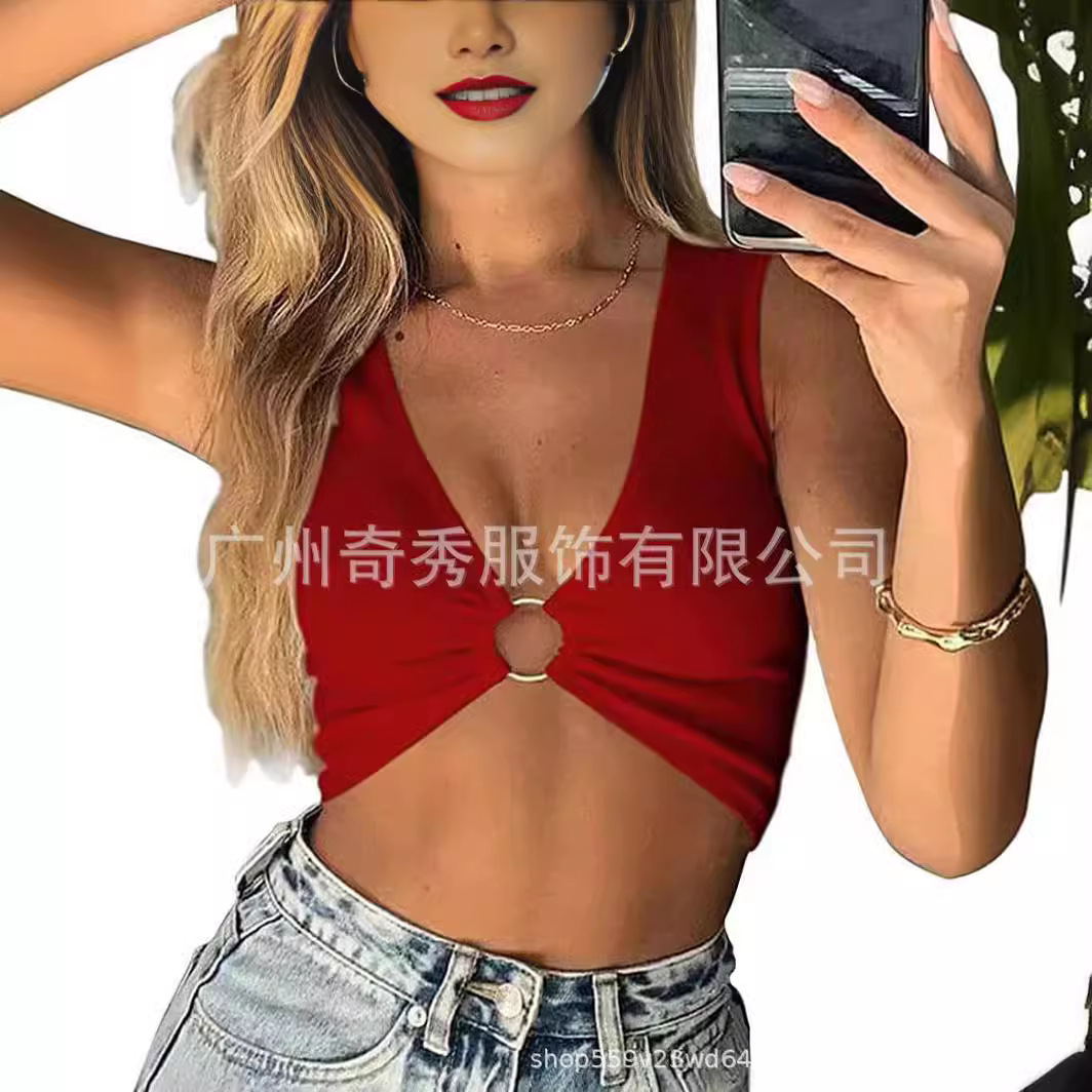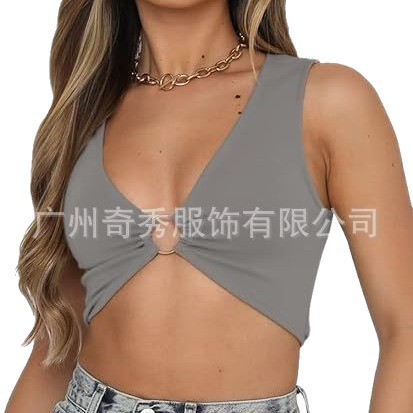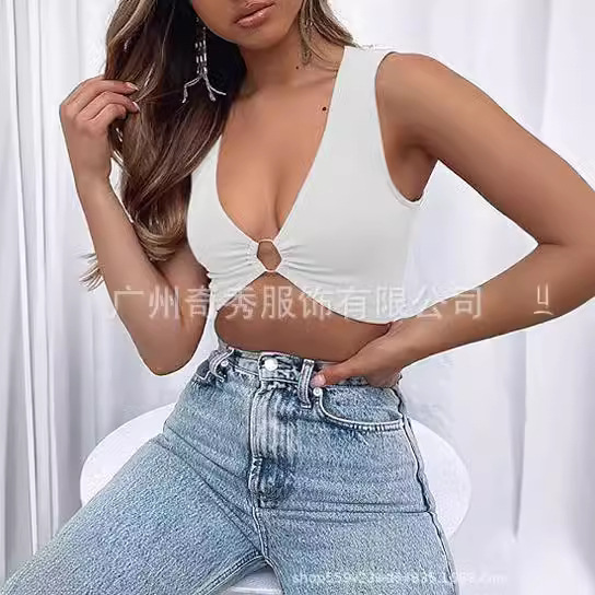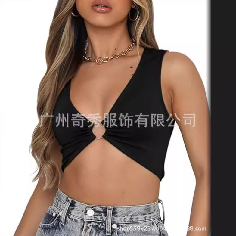 2024 Летний сексуальный укороченный топ для женщин, топ без рукавов с глубоким v-образным вырезом, однотонная майка с глубоким вырезом.