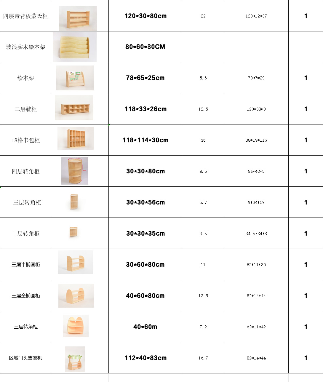 Трёхслойный шкаф Монтессори 120*30*56 см; Четырехъярусный шкаф Монтессори 120*30*80 см; Второй этаж с задней панелью шкаф Монтеса 120*30*35cm; Три этажа с задней панелью шкаф Монтеса 120*30*56cm; Четыре слоя с задней панелью шкаф Монтеса 120*30*80cm; Двухслойный многоэтажный угловой шкаф 30*30*35cm; Три слоя многослойной панели угловой шкаф 30*30*56cm; Четырехслойный многоугольный шкаф 30*30*80cm; Обувной шкаф на втором этаже 118*33*26cm; Трехслойный полуовальный шкаф 30*60*80cm; Трехслойный полный овальный шкаф 40*60*80cm; Торговый автомат 112*83*40cm; Удержатель книжки с картинками 74*65*28cm; Волнистая деревянная книжка с картинками 80*60*30CM; Овальный угловой шкаф 40*60cm; 18 сетки шкаф 118*114*30cm