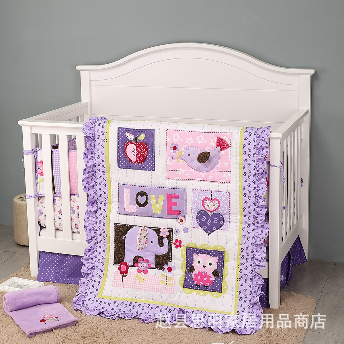 本套产品包含童被、床围、床笠、床裙、尿布袋、毯子六件套