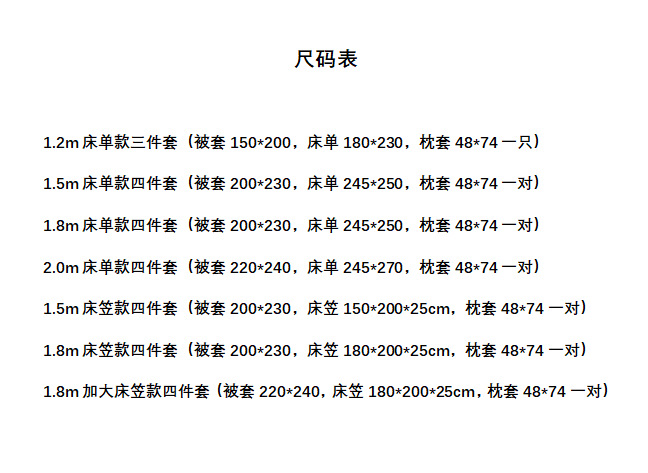 Комплект из трех предметов простыни 1,2 м (одеяло 150*200, простыня 180*230); Комплект из четырех предметов простыни 1,5 м (одеяло 200*230, простыня 245*250); Комплект из четырех предметов простыни 1,8 м (одеяло 200*230, простыня 245*250); Комплект из четырех предметов простыни 2,0 м (одеяло 220*240, простыни 245*270); Комплект из четырех простыней шириной 1,5 м (одеяло 200*230, простыня 150*200*25 см); Комплект из четырех простыней шириной 1,8 м (одеяло 200*230, простыня 180*200*25 см); Очень большой комплект из четырех простыней шириной 1,8 м (одеяло 220*240, простыня 180*200*25 см)