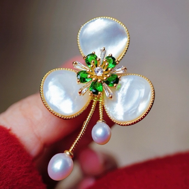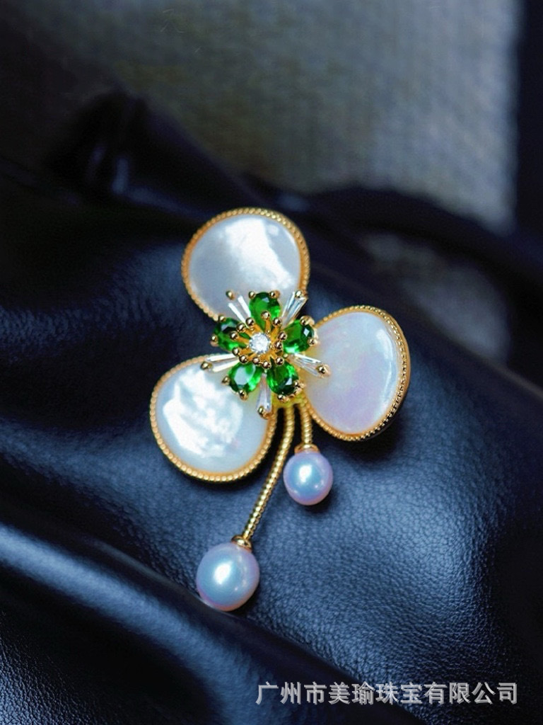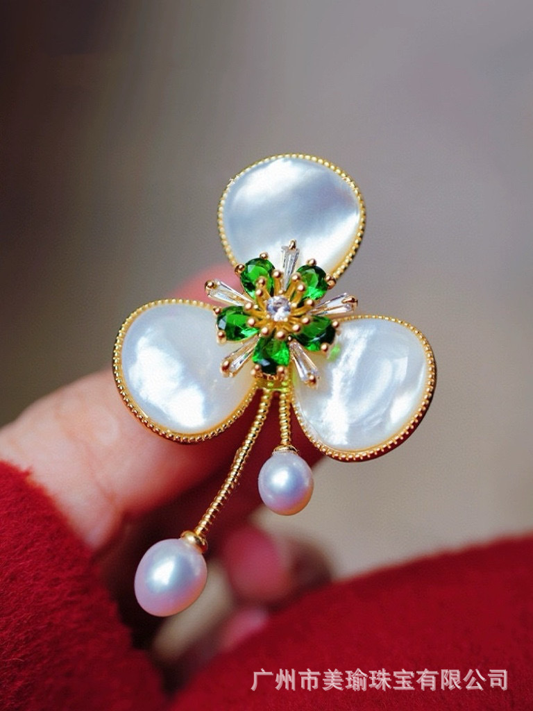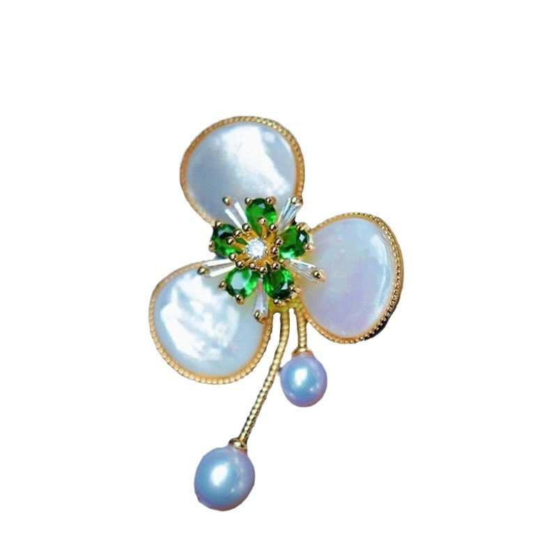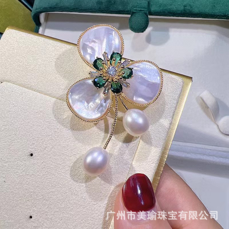 Готовый продукт: брошь-клевер из натурального жемчуга для женщин, дизайн с защитой от просвечивания, нишевая брошь-заколка, художественный стиль.