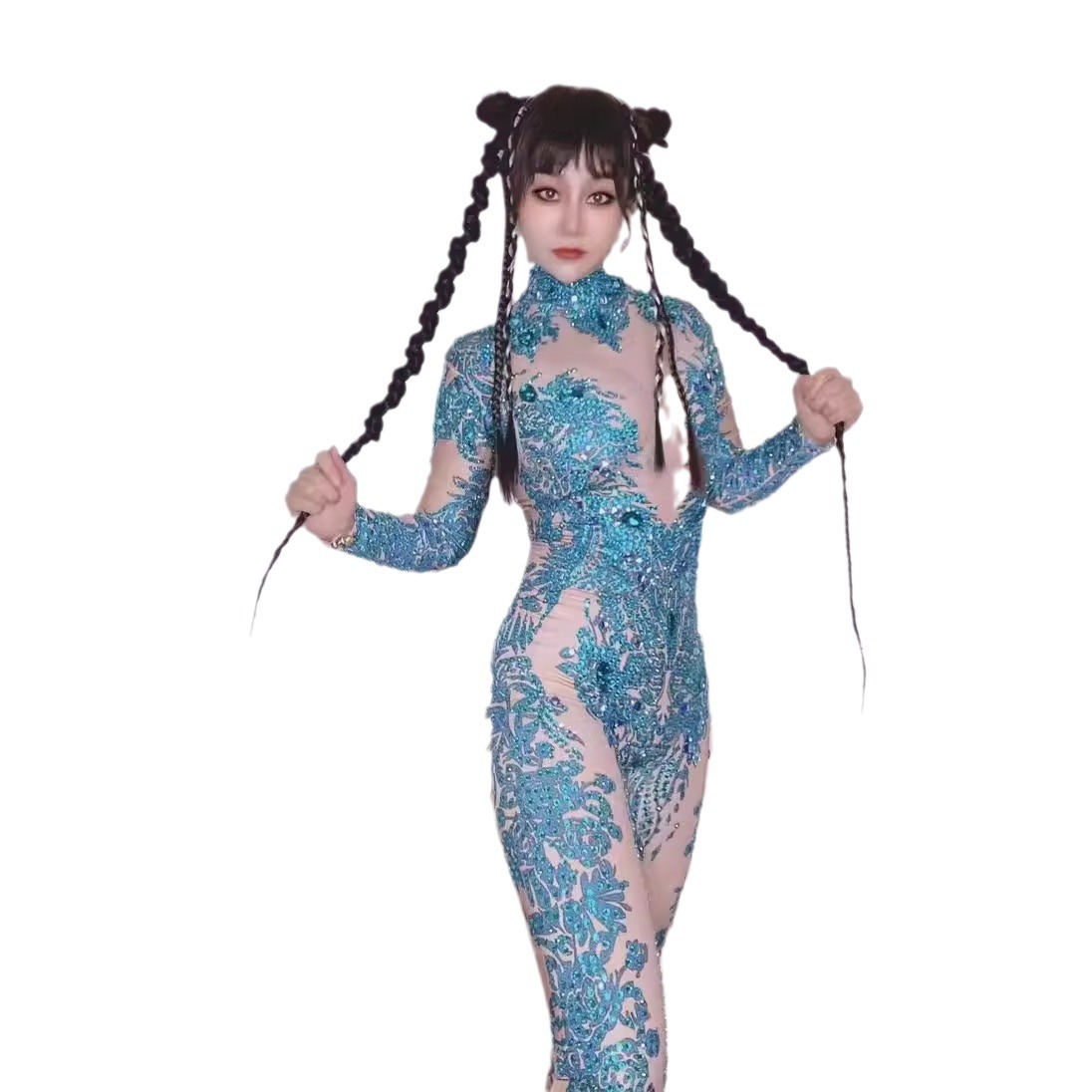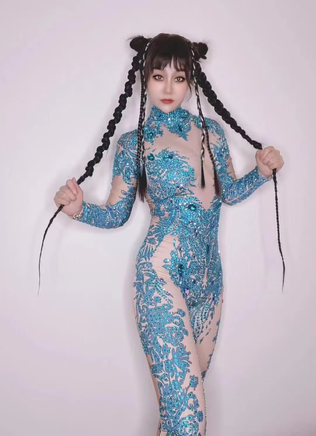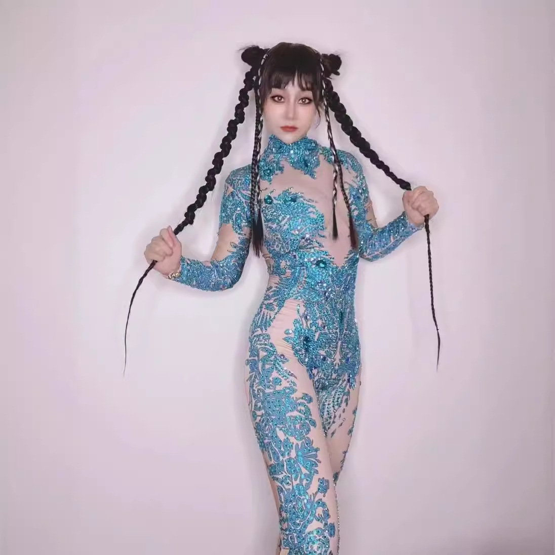 Готовый костюм для выступлений в ночных клубах и барах, женский комбинезон с длинными рукавами, полностью украшенный стразами, с принтом под кожу и синими виноградными гроздями, для вечеринок и дней рождения