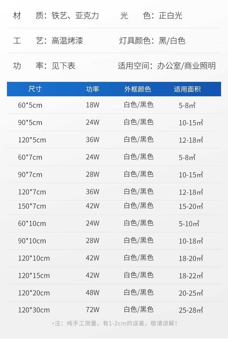 Длина 120 см*Ширина 5 см 24 Вт (модель высокой яркости); Длина 120 см*Ширина 5 см 36 Вт (утепленная версия); Длина 120 см*Ширина 7 см 36 Вт (модель высокой яркости); Длина 120 см*Ширина 7 см 40 Вт (утепленная версия); Длина 120 см*Ширина 10 см40 Вт (модель высокой яркости); Длина 120 см * Ширина 10 см 52 Вт (выделенная версия); Длина 150 см* Ширина 5 см 36 Вт; Длина 150 см*Ширина 7 см 42 Вт (модель высокой яркости); Длина 150 см*Ширина 7 см 60 Вт (улучшенная версия); Длина 150 см*Ширина 10 см 48 Вт (модель высокой яркости); Длина 150 см * Ширина 10 см, 72 Вт (выделенная версия); Длина 180 см*Ширина 7 см 52 Вт (модель высокой яркости); Длина 180 см * Ширина 7 см, 72 Вт (выделенная версия); Длина 180 см*Ширина 10 см 60 Вт (модель высокой яркости); Длина 180 см*Ширина 10 см 80 Вт (утепленная версия); Длина 200 см*Ширина 7 см 55 Вт (модель высокой яркости); Длина 200 см*Ширина 7 см 80 Вт (улучшенная версия); Длина 200см*Ширина 10см 72Вт; Длина 240 см*Ширина 5 см 52 Вт (модель высокой яркости); Длина 240 см*Ширина 5 см 72 Вт (выделенная версия); Длина 240 см*Ширина 7 см 60 Вт (модель высокой яркости); Длина 240 см*Ширина 7 см 88 Вт (выделенная версия); Длина 240см*Ширина 10см 80Вт; Длина 90 см*Ширина 10 см 30 Вт (модель высокой яркости); Длина 90 см*Ширина 10 см 40 Вт (утепленная версия); Длина 90 см*Ширина 7 см 28 Вт (модель высокой яркости); Длина 90 см * Ширина 7 см, 40 Вт (выделенная версия); Длина 90см*Ширина 5см 24Вт; Длина 60 см*Ширина 10 см 24 Вт (модель высокой яркости); Длина 60 см*Ширина 10 см 36 Вт (утепленная версия); Длина 60 см*Ширина 7 см 24 Вт (модель высокой яркости); Длина 60 см * Ширина 7 см, 36 Вт (выделенная версия); Длина 60см*Ширина 5см 18Вт; Длина 120 см*Ширина 15 см 48 Вт (модель высокой яркости); Длина 120 см * Ширина 15 см, 72 Вт (выделенная версия); Длина 120 см*Ширина 20 см 48 Вт (модель высокой яркости); Длина 120 см * Ширина 20 см 72 Вт (выделенная версия); Длина 120 см*Ширина 30 см 72 Вт (модель высокой яркости); Длина 120 см*Ширина 30 см 108 Вт (улучшенная версия); Длина 150 см*Ширина 15 см 60 Вт (модель высокой яркости); Длина 150 см*Ширина 15 см 98 Вт (улучшенная версия); Длина 150 см*Ширина 20 см 65 Вт (модель высокой яркости); Длина 150 см * Ширина 20 см 88 Вт (выделенная версия); Длина 150 см*Ширина 30 см 100 Вт (модель высокой яркости); Длина 150 см * Ширина 30 см 128 Вт (выделенная версия); Длина 180 см*Ширина 15 см 72 Вт (модель высокой яркости); Длина 180 см * Ширина 15 см 108 Вт (выделенная версия); Длина 180 см*Ширина 20 см 80 Вт (модель высокой яркости); Длина 180 см * Ширина 20 см 108 Вт (выделенная версия); Длина 180см*Ширина 30см 110Вт; Длина 180 см * Ширина 30 см, 148 Вт (выделенная версия); Длина 200 см*Ширина 15 см 80 Вт (модель высокой яркости); Длина 200 см*Ширина 15 см 118 Вт (утепленная версия); Длина 200 см*Ширина 20 см 80 Вт (модель высокой яркости); Длина 200 см*Ширина 20 см 118 Вт (улучшенная версия); Длина 200 см*Ширина 30 см 130 Вт (модель высокой яркости); Длина 200 см*Ширина 30 см 156 Вт (улучшенная версия); Длина 240 см*Ширина 15 см 100 Вт (модель высокой яркости); Длина 240 см*Ширина 15 см 148 Вт (выделенная версия); Длина 240см*Ширина 20см 110Вт; Длина 240 см*Ширина 20 см 148 Вт (выделенная версия)