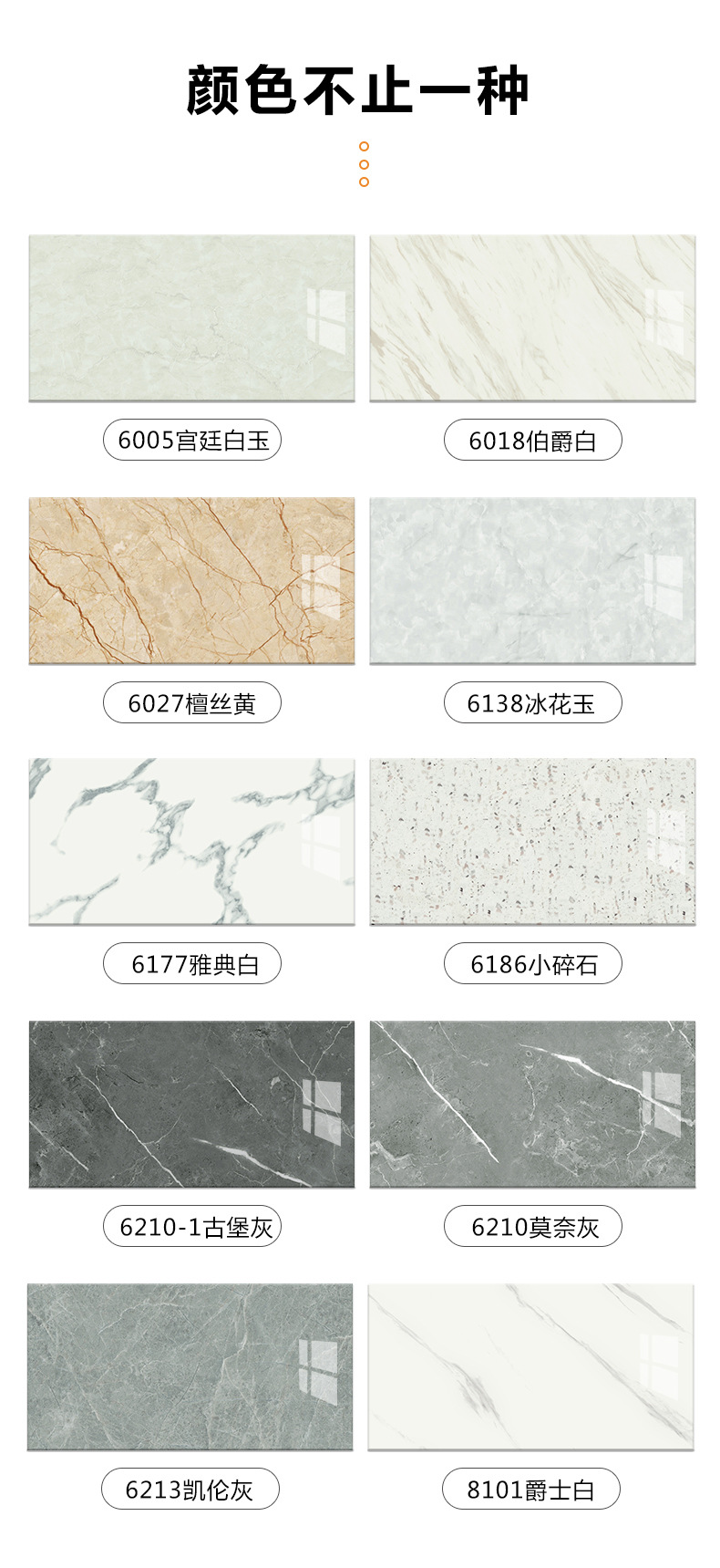 6005 Дворцовый белый нефрит; 6018 Эрл Уайт; 6027 сандал желтый; 6138 Нефритовый цветок льда; 6152 Лююнь Нефрит; 6156 жемчужно-белый; 6177 Афины Белый; 6178-3 узор из голубого камня; 6179 Хуанлун нефрит; 6186 мелкий гравий; 6189 Надо Грей; 6198-5 Молния Черная; 6198 позолоченный белый; 6210-1 Замок Серый; 6210 Моне Грей; 6213 Карен Грей; 6222 рыбий жир белый; 8101 джаз белый; чистый белый; 6203 Надо Грей; 6179-3 Аквамарин; Яши белый; Граф Грей; Легкоскользящий кирпич; большая сетка; маленькая сетка; джаз белый; Серый ледяной нефрит; Моне Грей; час серый; Кара Белый; 902 современный серый; 904 Афины Серый; CLS-011 стример белый; CLS-014 джаз белый; CLS-26 окрашен в синий цвет; CLS-28 краска желтая; CLS-29 окрашен в черный цвет; CLS-030 старинное дерево; CLS-032 вишневое дерево; CLS-033 светло-серое дерево; CLS-034 Кипарисная сосна; CLS-035 древесина среднего серого цвета; Чернильный камень CLS-036; CLS-037 простой камень; CLS-42 агат серый; CLS-43 агат желтый; CLS-44 Нефритовый зеленый; CLS-89 Кэдди Грей; ELS-002 сандал желтый; ELS-010 узор черное золото; ELS-011 джазовый черный; ЭЛС-12 Белоснежка; ELS-13 коричневый лайм; ELS-014 Кофе Эрл Грей; ELS-15 чернила белые; ELS-17 узор из желтого камня; ELS-018 Нефритовый цветок льда; ELS-19 замок серый; ELS-21 Яши Белый; ZC-009 рыбий жир белый; DW-201; DW-202; DW-203; HL-086; HL-085; HL-098; HL-099; HL-100; HL-101; HL-107; HL-119; HL-120; HL-121; HL-122; HL-129; HL-130; HL-132; HL-133; HL-134; HL-135; SDN1014; SDN-1020; SDN-1021