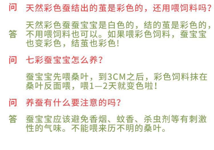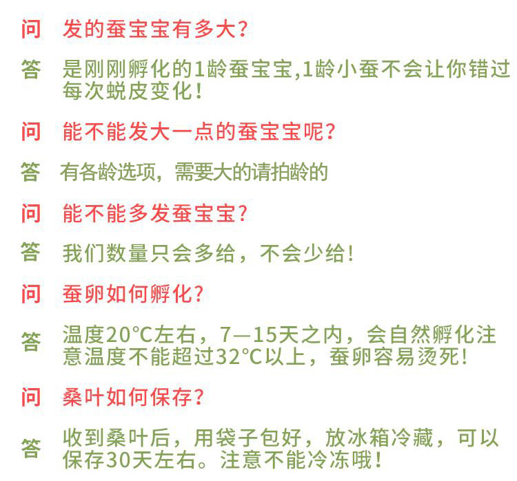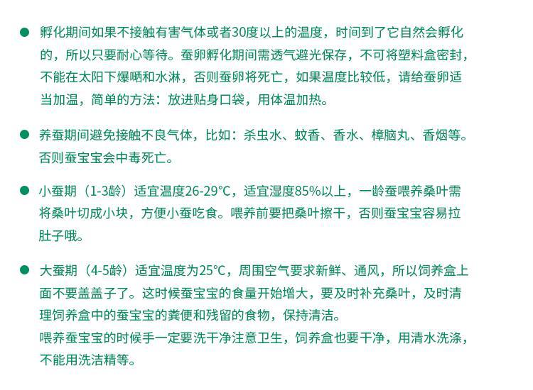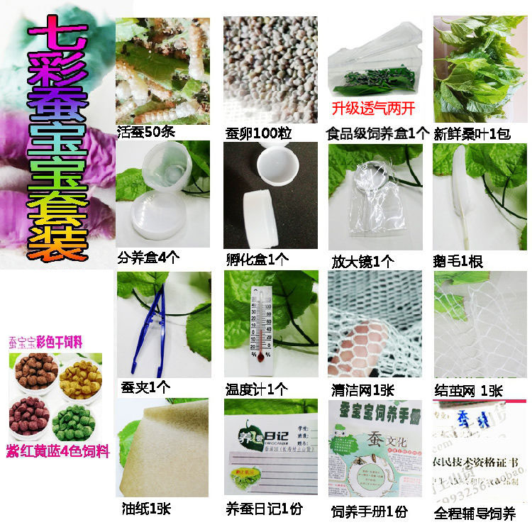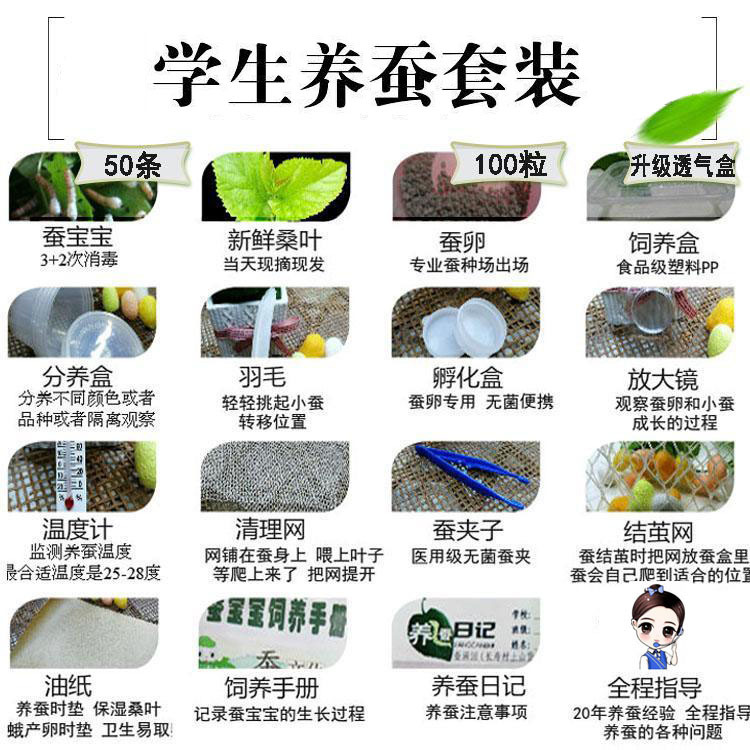 Набор для выращивания тутового шелкопряда 1; Набор для выращивания тутового шелкопряда 1 (30 тутовых шелкопрядов и 30 яиц); Набор для выращивания тутового шелкопряда 1 (30 тутовых шелкопрядов и 50 яиц); Набор инструментов для тутового шелкопряда + листья шелковицы; 10 штук для 1 года + коробка + листья шелковицы.; 30 штук для 1 года + коробка + листья шелковицы.; 50 штук для 1 года + коробка + листья шелковицы; 100 штук для 1 года + коробка + листья шелковицы; 10 штук для 2 лет + коробочка + листья шелковицы; 30 штук для 2 лет + коробочка + листья шелковицы; 50 штук для 2 лет + коробочка + листья шелковицы; 10 штук для 3 лет + коробочка + листья шелковицы; 20 штук для 3 лет + коробочка + листья шелковицы; 10 штук для 4 лет + листья шелковицы.; 100 яиц тутового шелкопряда + набор для выращивания тутового шелкопряда + листья шелковицы; Половина фунта листьев шелковицы; Набор для выращивания тутового шелкопряда 2; Набор для выращивания тутового шелкопряда 3; Листья шелковицы 0.5kg; костюм из золотой проволоки; Красочный шелковый костюм; Красочный набор шелковых тутового шелкопряда (20 штук); 10 штук для 4 лет + дышащая коробка + листья шелковицы.; 20 штук для 4 лет + дышащая коробка + листья шелковицы.; 30 штук для 4 лет + дышащая коробка + листья шелковицы.; Студенческий набор для выращивания тутового шелкопряда; Четырехцветная коробка подачи; Четырехцветная коробка для корма; Бабочка шелкопряда, традиционная китайская медицина, размер профилактики; Порошок Silkworm Baby Quicklime 0.5kg; 100 г очень нежных листьев; Полный набор инструментов для выращивания тутового шелкопряда + листья шелковицы.; Студенческий красочный набор тутового шелкопряда; Набор для кормления монохромного шелкопряда; Студенческий костюм из шелкового шелкопряда; 10 бесплатных листьев шелковицы для детей 5 лет; 100 золотых тутовых червей + коробка + листья шелковицы; 10 3-летних тутового шелкопряда + коробочка + перья + листья шелковицы; 50 тутовых червей в возрасте 1 года + 100 яиц + розетка + инкубационная коробка + увеличительное стекло + перья + листья шелковицы; 10 тутовых червей + розетка + 20 яиц + инкубационная коробка + листья шелковицы