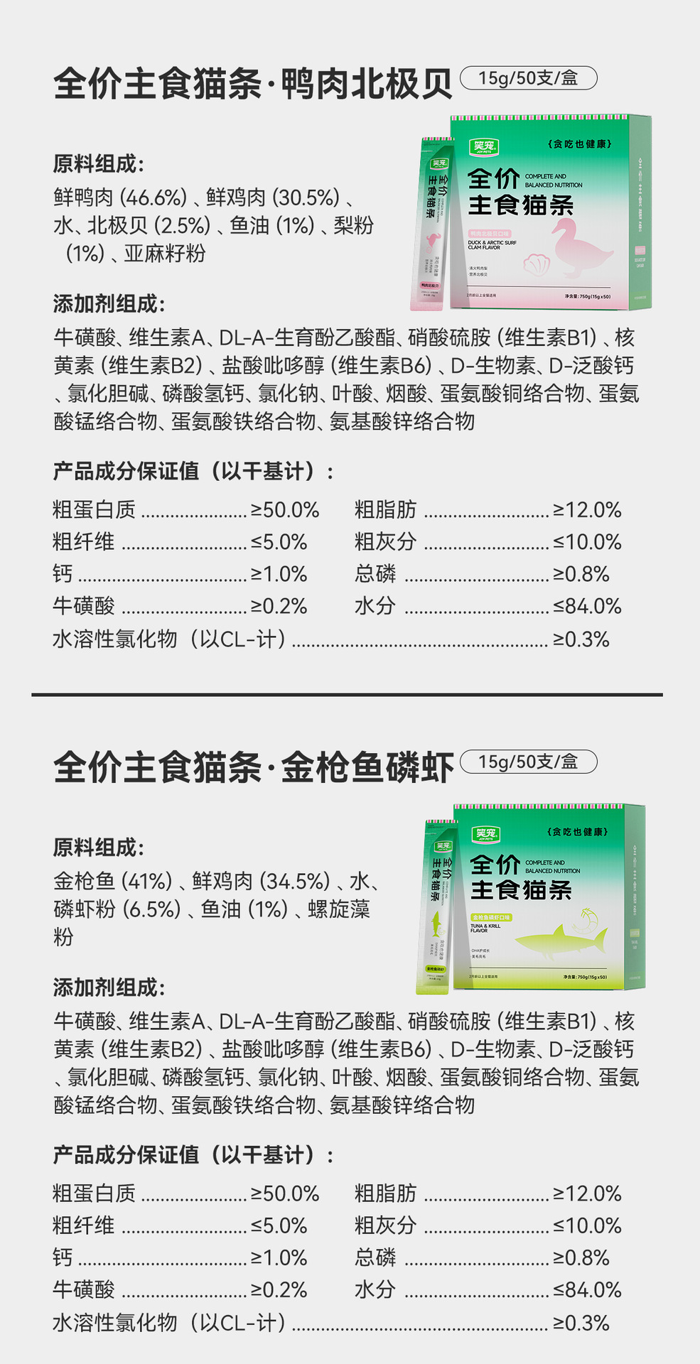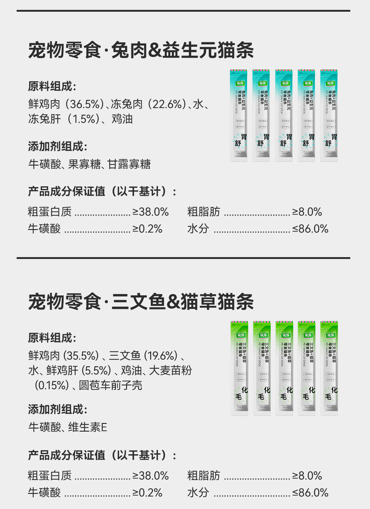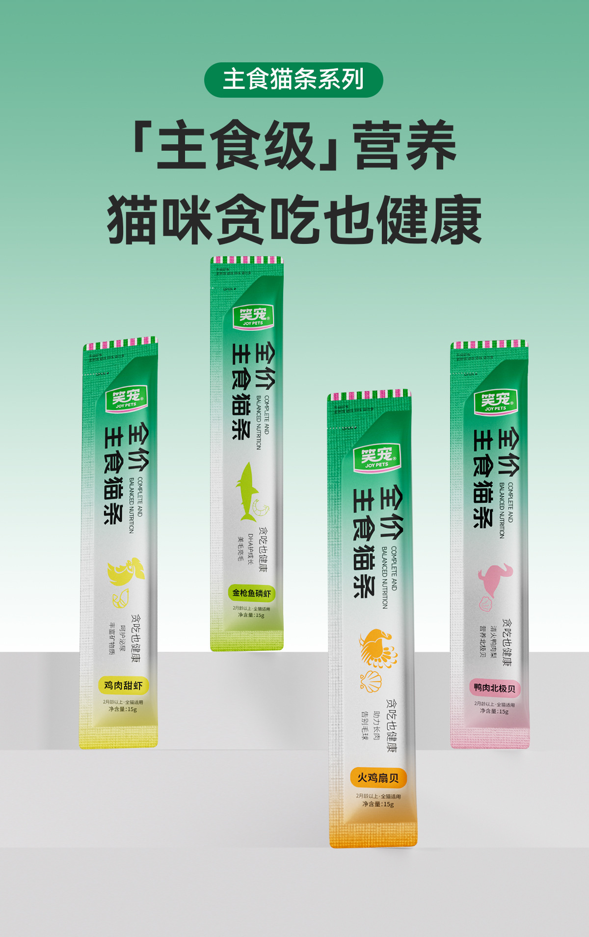 Курица и сладкие креветки [улучшают мочеиспускание]; Тунец криль [красивые и блестящие волосы]; Турецкие гребешки [Помогает набрать вес]; Утиное мясо и арктические гребешки [очищают от жара и уменьшают шум]; Масло трески и криля [красивые и блестящие волосы]; Курица и клюквен [уход за мочом]; Лососевая кошачья трава [удаление волос]; Пребиотики из кроличьего мяса [уход за желудочно-кишечным трактом]