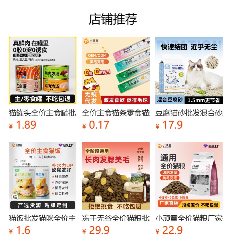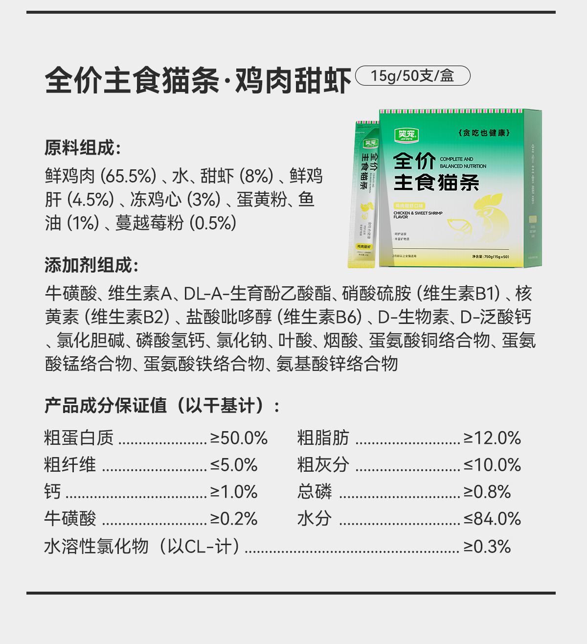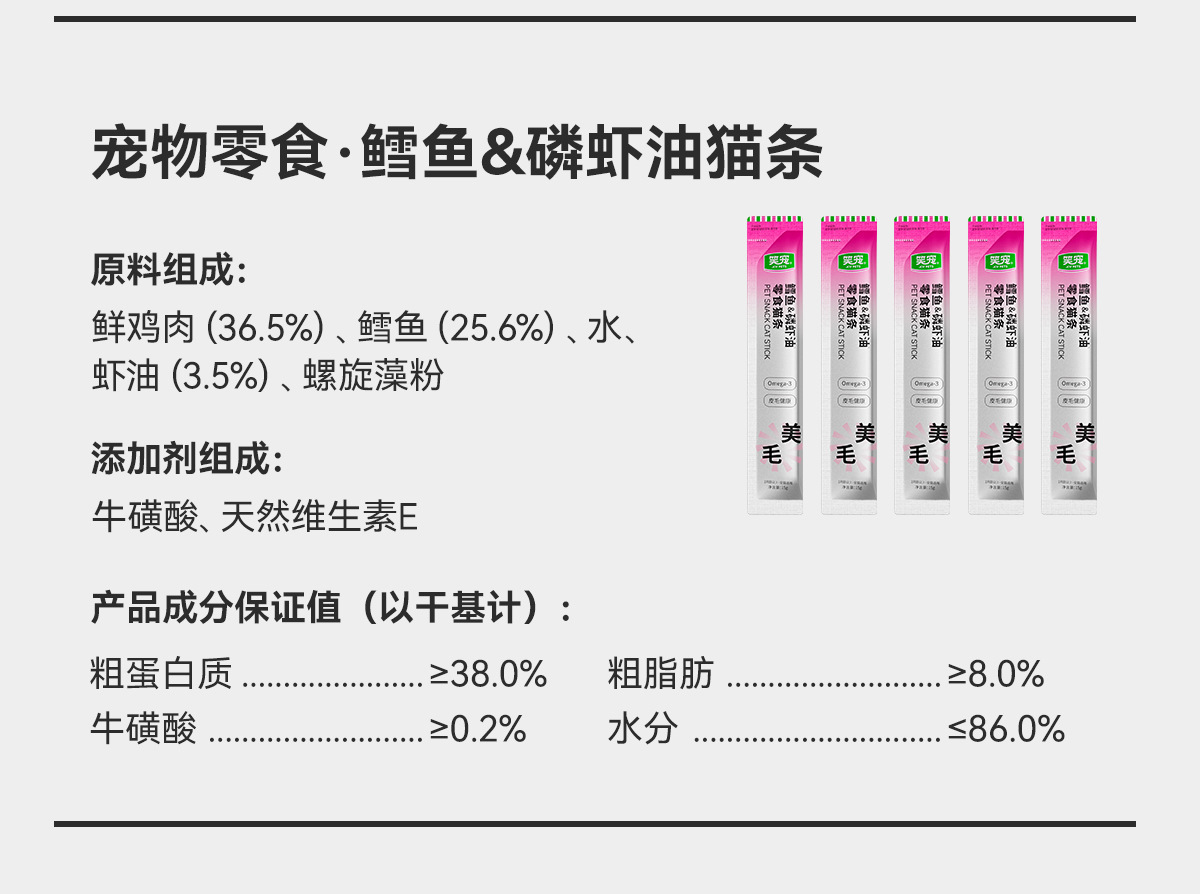 Курица и сладкие креветки [улучшают мочеиспускание]; Тунец криль [красивые и блестящие волосы]; Турецкие гребешки [Помогает набрать вес]; Утиное мясо и арктические гребешки [очищают от жара и уменьшают шум]; Масло трески и криля [красивые и блестящие волосы]; Курица и клюквен [уход за мочом]; Лососевая кошачья трава [удаление волос]; Пребиотики из кроличьего мяса [уход за желудочно-кишечным трактом]