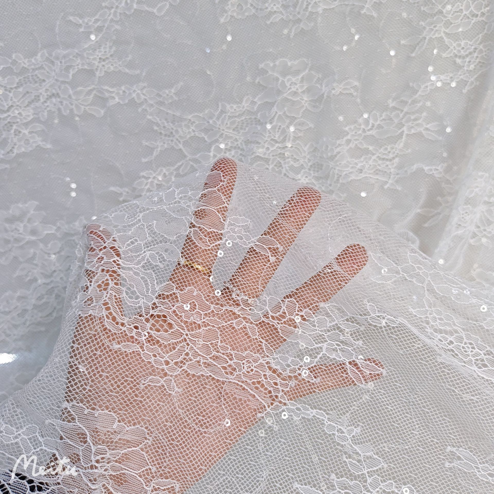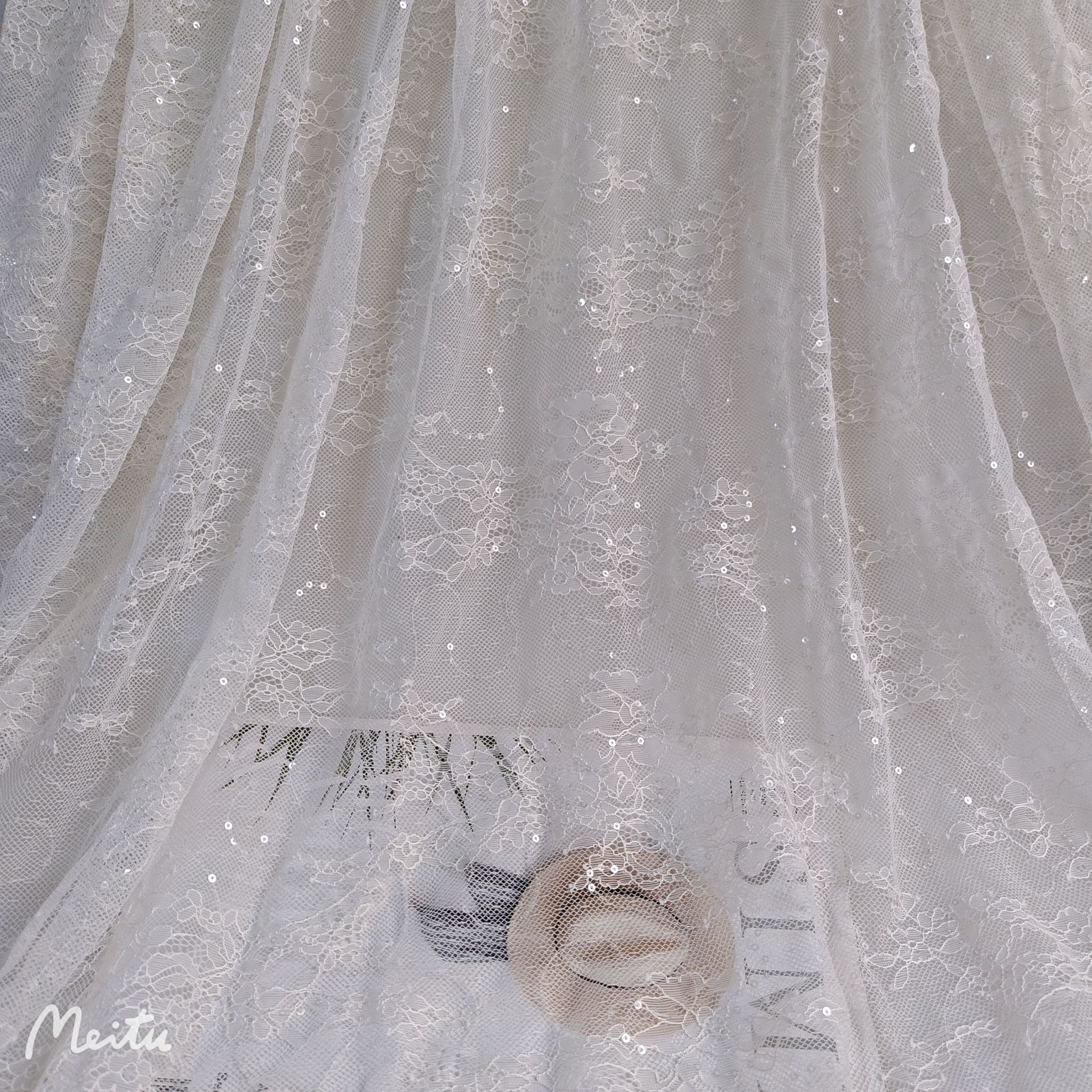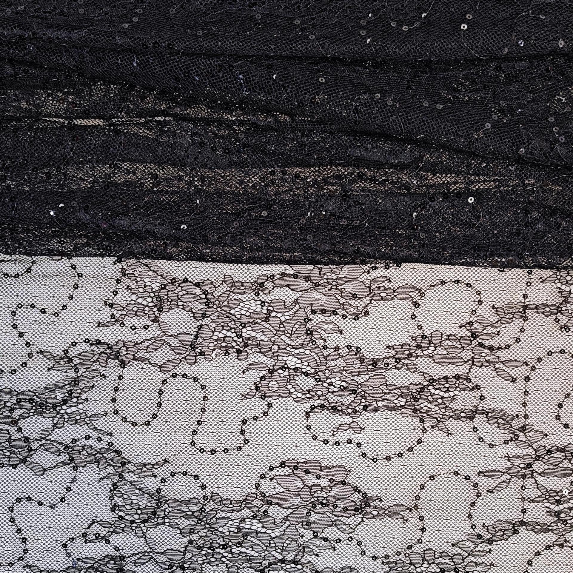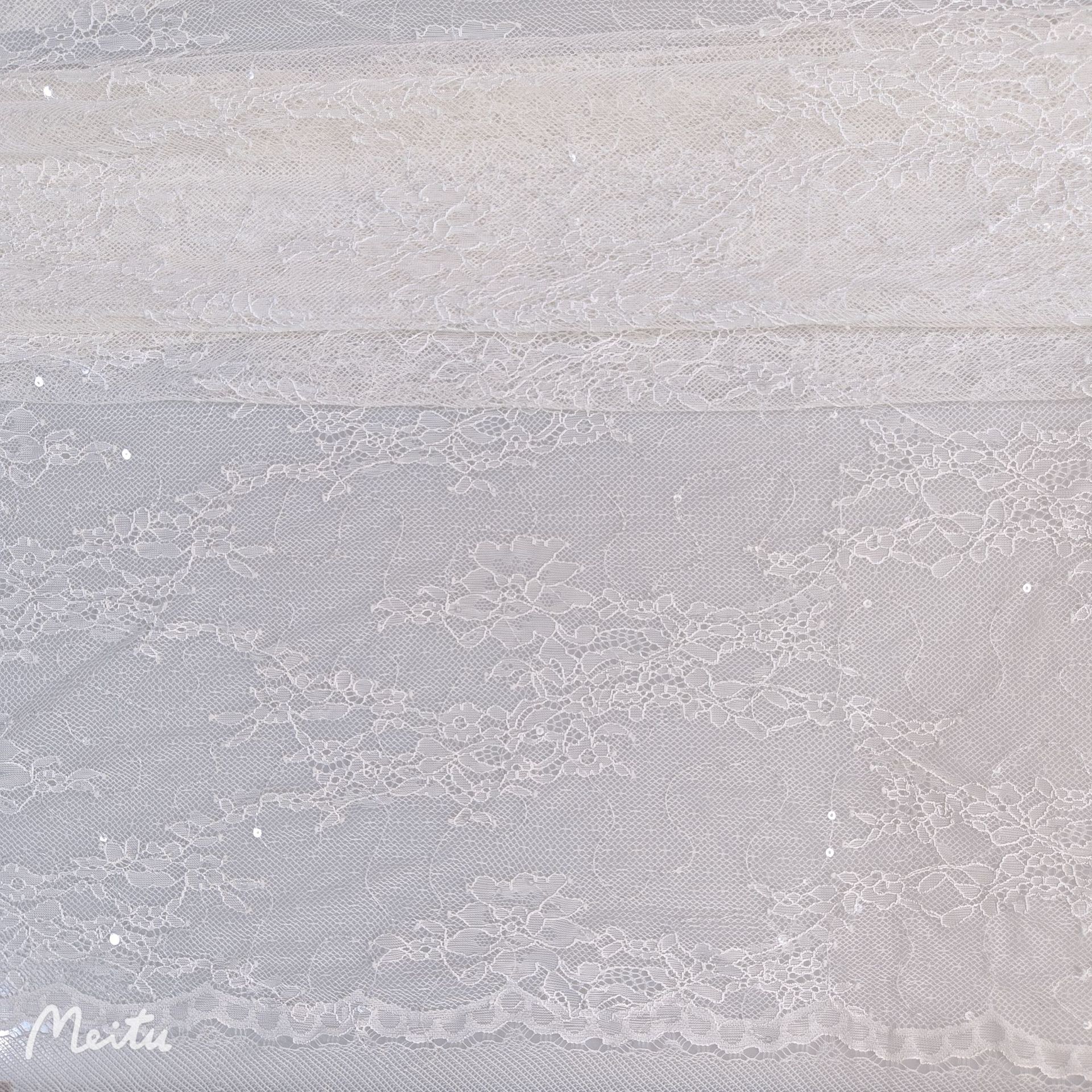 闪亮款Bingbing的 薄透款剪线蕾丝面料 大花型剪线蕾丝 无规则波浪弯曲绣片 白色杏色是透明片绣片 黑色是黑片绣片 时尚大气款 手感适中 垂感好 好品质