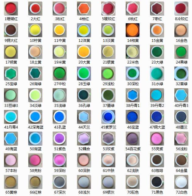коралловый красный; Большой красный; розовый; розовый; розово-красный; Дата красная; Медно-красный; оранжевый; Цветы красные; большой зеленый; фруктовый зеленый; Королевский зеленый; нефритовый зеленый; зеленый боб; светло-зеленый; озеро зеленое; глубокая сосна; Накаматсу; светлая сосна; Военный зеленый; Ланди Грин; темно-зеленый; дупло зеленое; Тяньлань; морское синее; глубоководное синее; королевский синий; голубое озеро; Конг Лань; медно-синий; Картина 1; Картина 2; Картина 3; Картина 4; Молан; Ревень; лимонно-желтый; ярко-желтый; Желтый; светло-желтый; оранжевый; золотой; серебристо-желтый; Землисто-желтый; бежевый; Фиолетовый; ярко-фиолетовый; розово-фиолетовый; фиолетовый; корень лотоса; Фиолетовые цветы; темно-розовый; светло-розовый; Этот порошок; блеск; глубокая кожа; средняя кожа; светлая кожа; желто-коричневый; основной цвет; Венера; кофе; верблюд; Белый; черный; темно-серый; светло-серый; серебристо-серый; средний желтый; светло-оранжевый; цвет