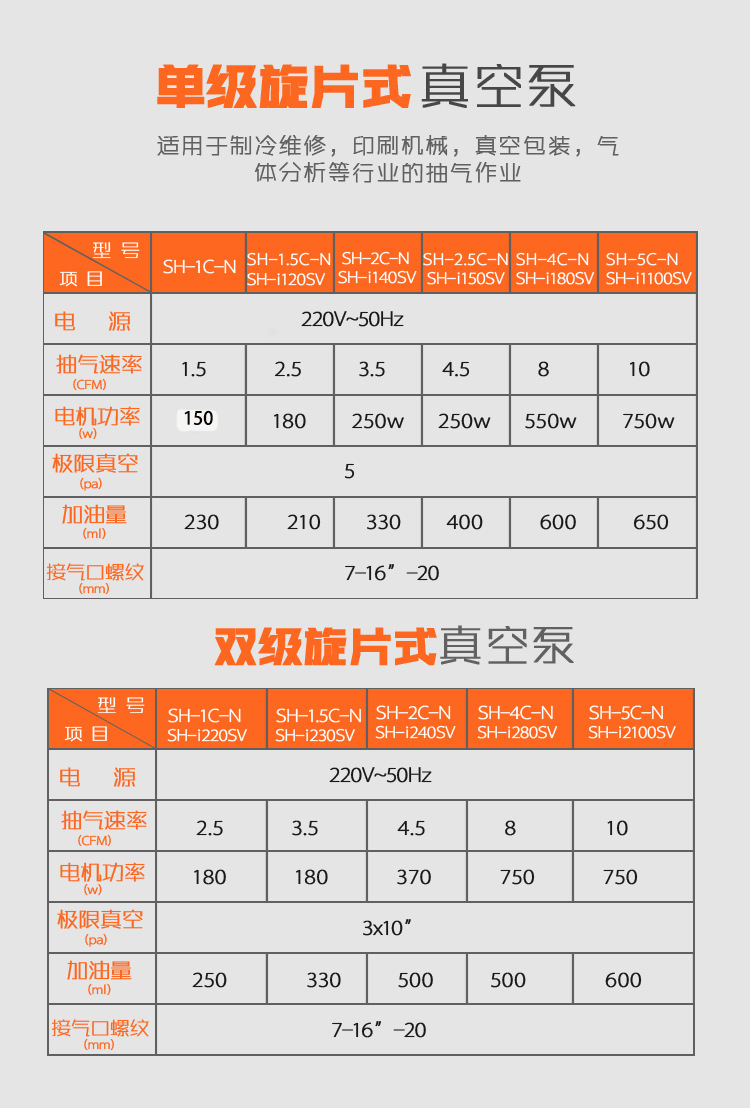 SH-1C-N насос голый (масло насоса) 150W; 1.5C-N голого насосного масла 180W 3 лошадиных; 2C-N голое насосное масло 250W1-5 лошадиных; 4C-N голый перекачиваемого масла 550W1-10 лошадиных; 120SV голый перекачиваемого масла 180W1-2 лошадиных; 140SV голый перекачиваемого масла 250W одноступенчатый насос; 180SV голый перекачиваемого масла 550W анти-обратный поток; 240SV голый перекачиваемого масла 370W2 л биполярный; 280SV голый перекачиваемого масла 750W4 л биполярный; SH-1C-N (стандартный 1 литр 150W); SH-1C-N (стандартный 1 литр 150W) с трубкой; SH-1.5C-N (стандартный 1.5 л 180W); SH-2C-N (2 л одноступенчатого насоса 250 Вт); SH-4C-N (4 л одноступенчатого насоса 550 Вт); SH-i120SV (1,5 л с электромагнитным клапаном 180W); SH-i140SV(2 л с электромагнитным клапаном 250W); SH-i180SV(4 л одноступенчатый клапан 550 Вт); SH-i240SV(2 литра двухступенчатый ременный клапан 370W); SH-i280SV(4 литра двухступенчатый ременный клапан 750 Вт)