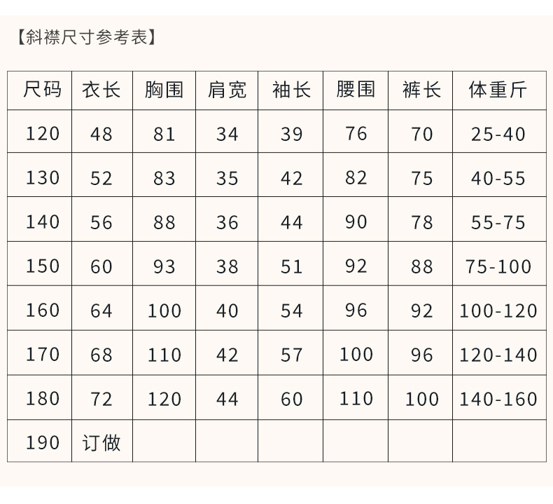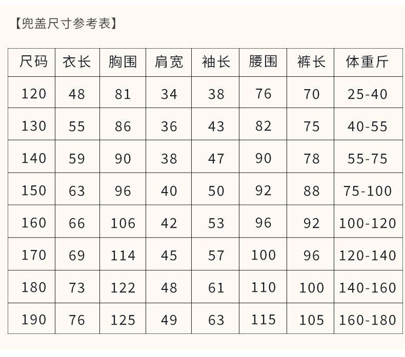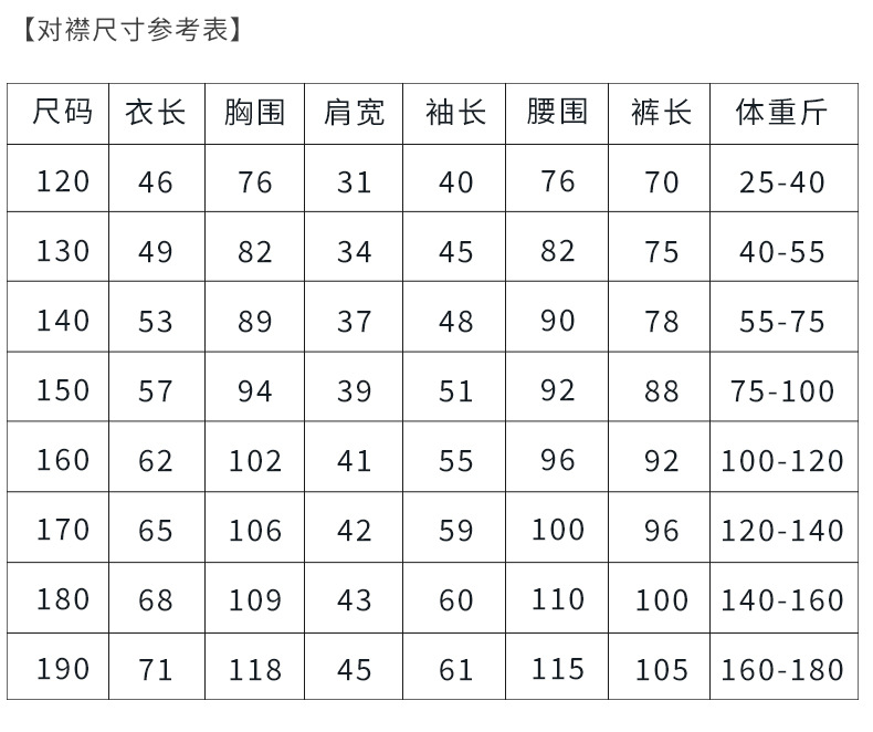 130 размер (рекомендуется 40-55 кг); Размер 140 (рекомендуется 55-75 кг); 150 размер (рекомендуется 75-100 кг); Размер 160 (рекомендуется 100-125 кг); 170 размер (рекомендуется 125-140 кг); 180 размер (рекомендуется 140-165 кг); 190 размеров (рекомендуется 165-200 кг)