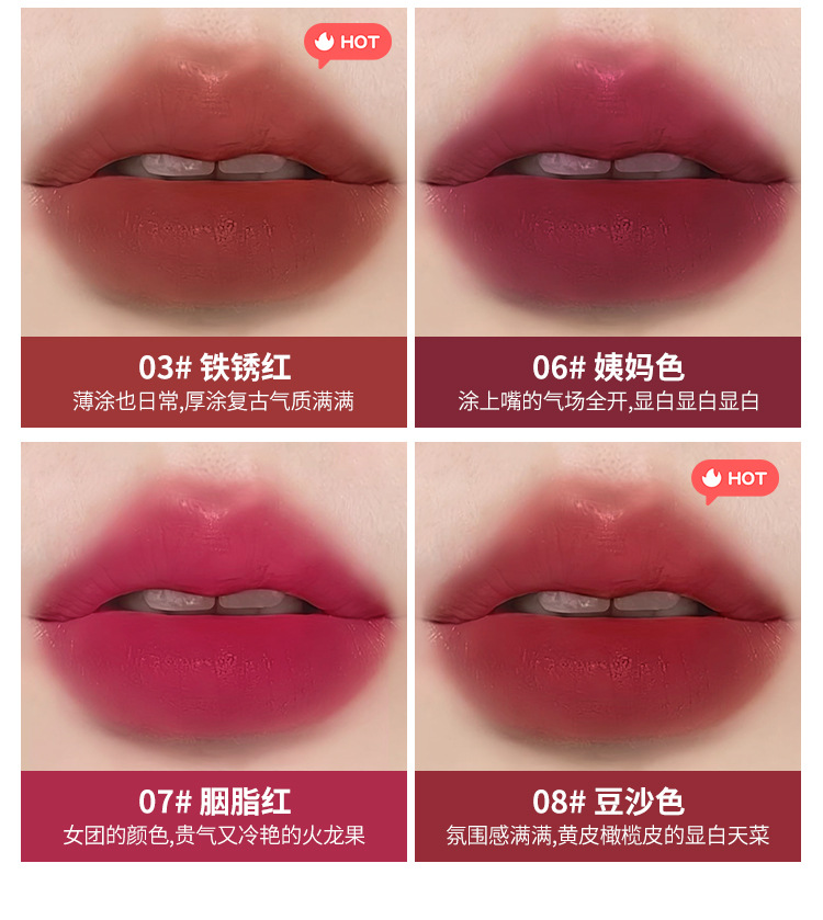 01#цвет сливы; 02#паста из красной фасоли; 03#желтый красный; 06 # Цвет тети; 07#Кармин; 08#цвет бобовой пасты