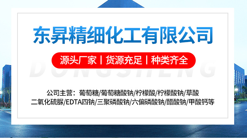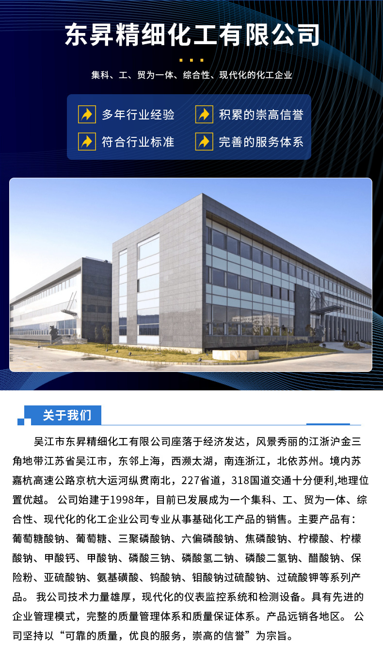 吴江市东昇精细化工有限公司座落于经济发达,风景秀丽的江浙沪金三角地带---江苏省吴江市,东邻上海,西濒太湖,南连浙江,北依苏州。境内苏嘉杭高速公路、京杭大运河纵贯南北,227省道,318国道交通十分便利,地理位置优越。 公司始建于1998年,目前已发展成为一个集科、工、贸为一体、综合性、现代化的化工企业。 公司专业从事基础化工产品的销售。主要产品有:葡萄糖酸钠、葡萄糖、三聚磷酸钠、六偏磷酸钠、焦磷酸钠、柠檬酸、柠檬酸钠、甲酸钙、甲酸钠、磷酸三钠、磷酸氢二钠、磷酸二氢钠、醋酸钠、保险粉、亚硫酸钠、氨基磺酸、钨酸钠、钼酸钠、七钼酸铵、聚丙烯酰胺、过硫酸钠、过硫酸钾等系列产品。 我公司技术力量雄厚,现代化的仪表监控系统和检测设备。具有先进的企业管理模式,完整的质量管理体系和质量保证体系。产品远销各地区。 公司坚持以“可靠的质量,优良的服务,崇高的信誉”为宗旨。