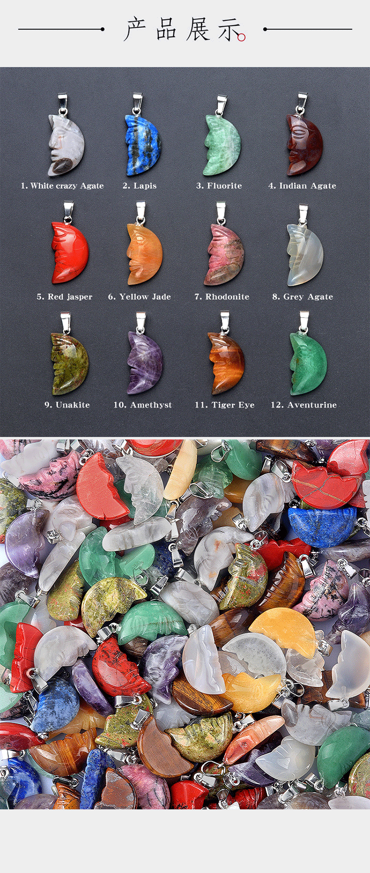 белый сумасшедший агат; белый кристалл; Аметист; камень тигровый глаз; Зеленый авантюрин; лазурит; желтый нефрит; красный камень; Розовый кварц; красный камень; цветной флюорит; черный блеск; натуральный агат; Индийский агат; цветок зеленый камень; фиолетовая слюда; 1 случайный