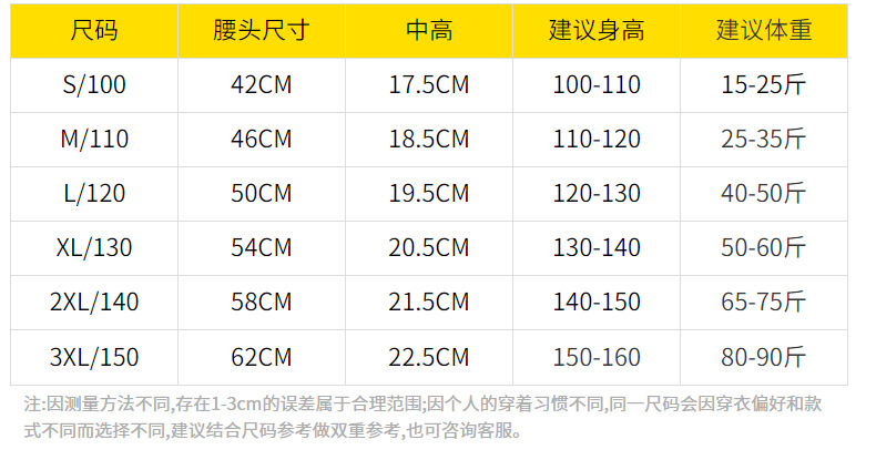 С/100【 7.5-12.5kg 】; М/110【 12.5-17.5kg 】; Л/120【 20-25kg 】; XL/130【 27.5-32.5kg 】; 2XL/140【 35-40kg 】; 3XL【 42.5-47.5kg 】