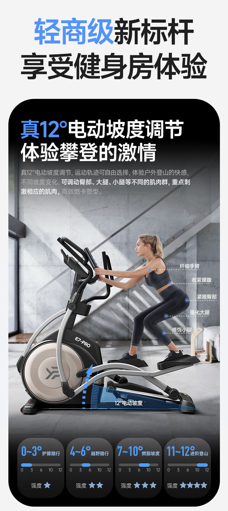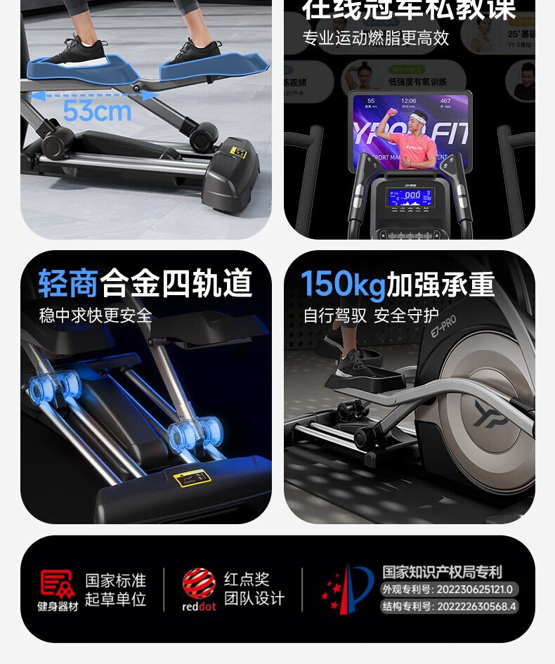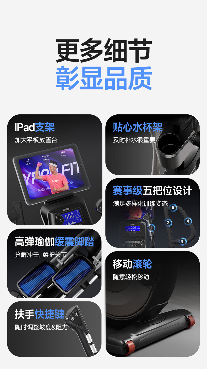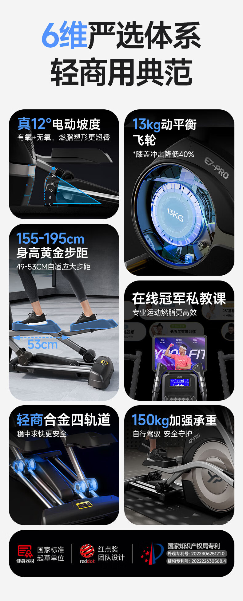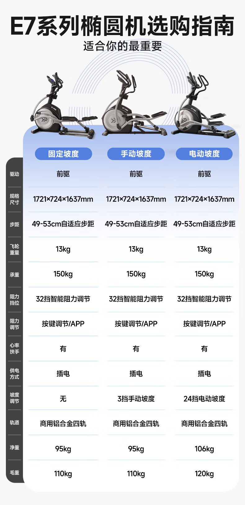 Модель с ручным наклоном — 3 уровня наклона, коммерческая большая длина шага; Классическая модель — инерционный маховик 15 кг, 32-скоростной магнитный контроль; Электрическая модель с наклоном — 24 уровня наклона, коммерческая, с увеличенной длиной шага